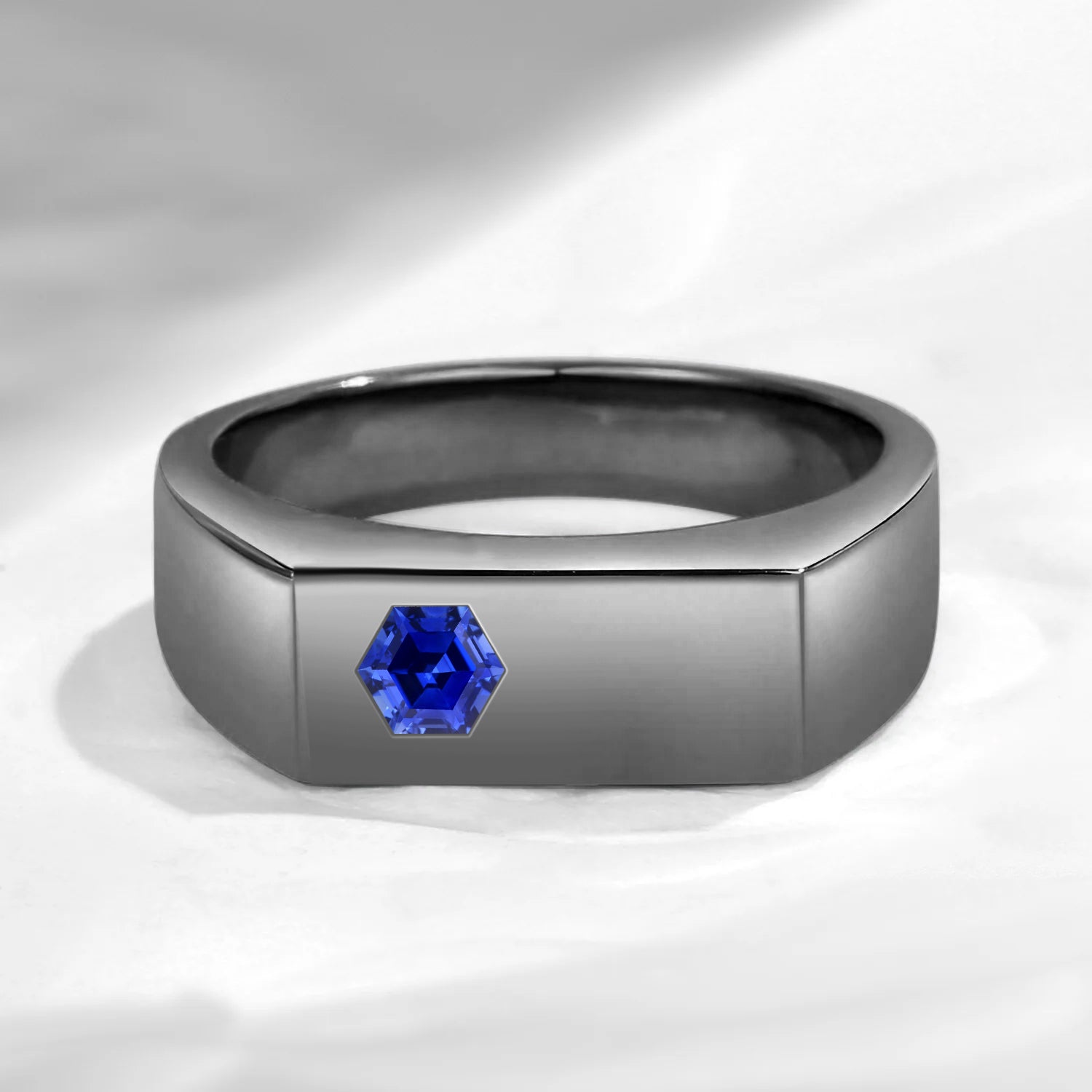 Unique Hexagon Lab Sapphire Wedding Band For Men