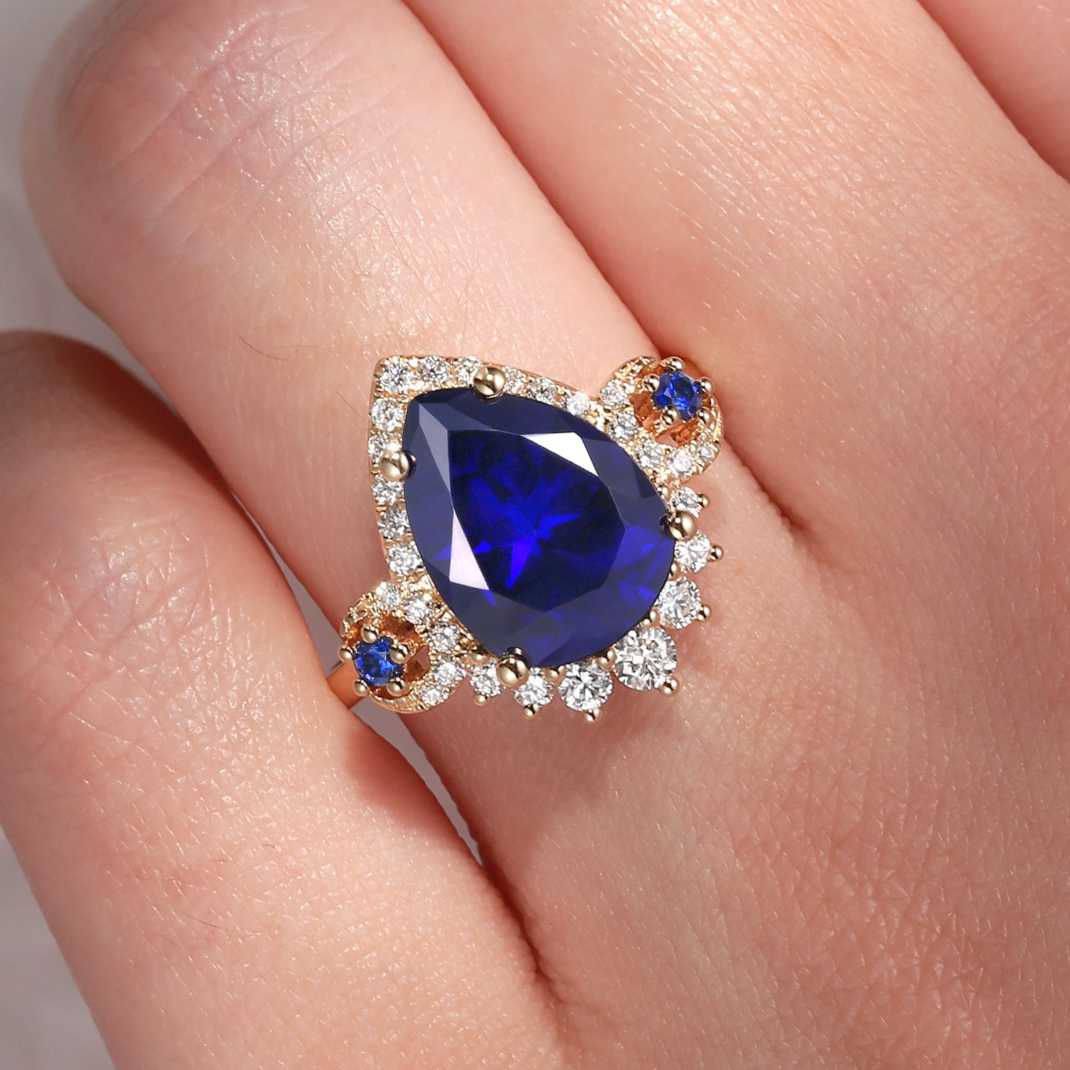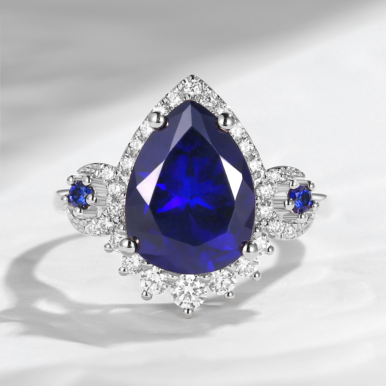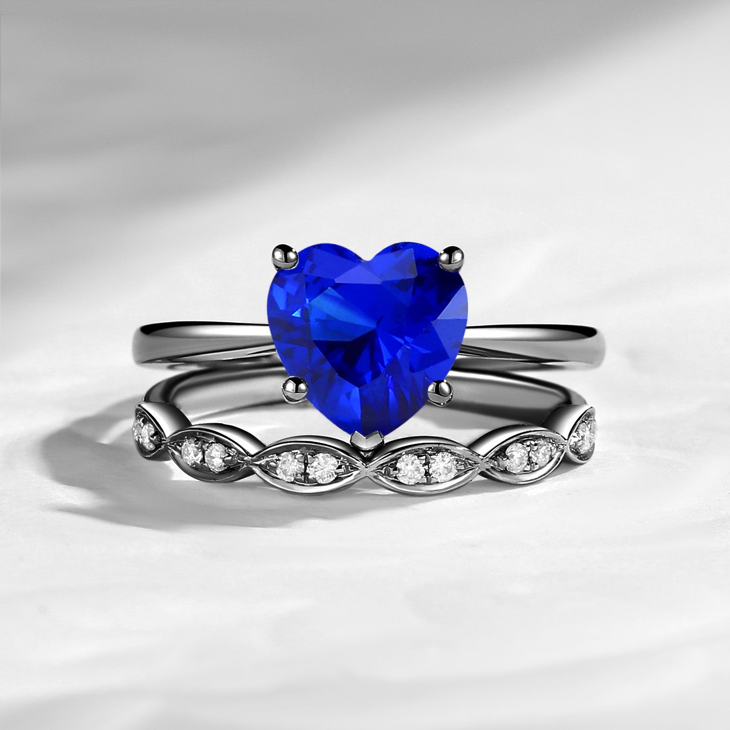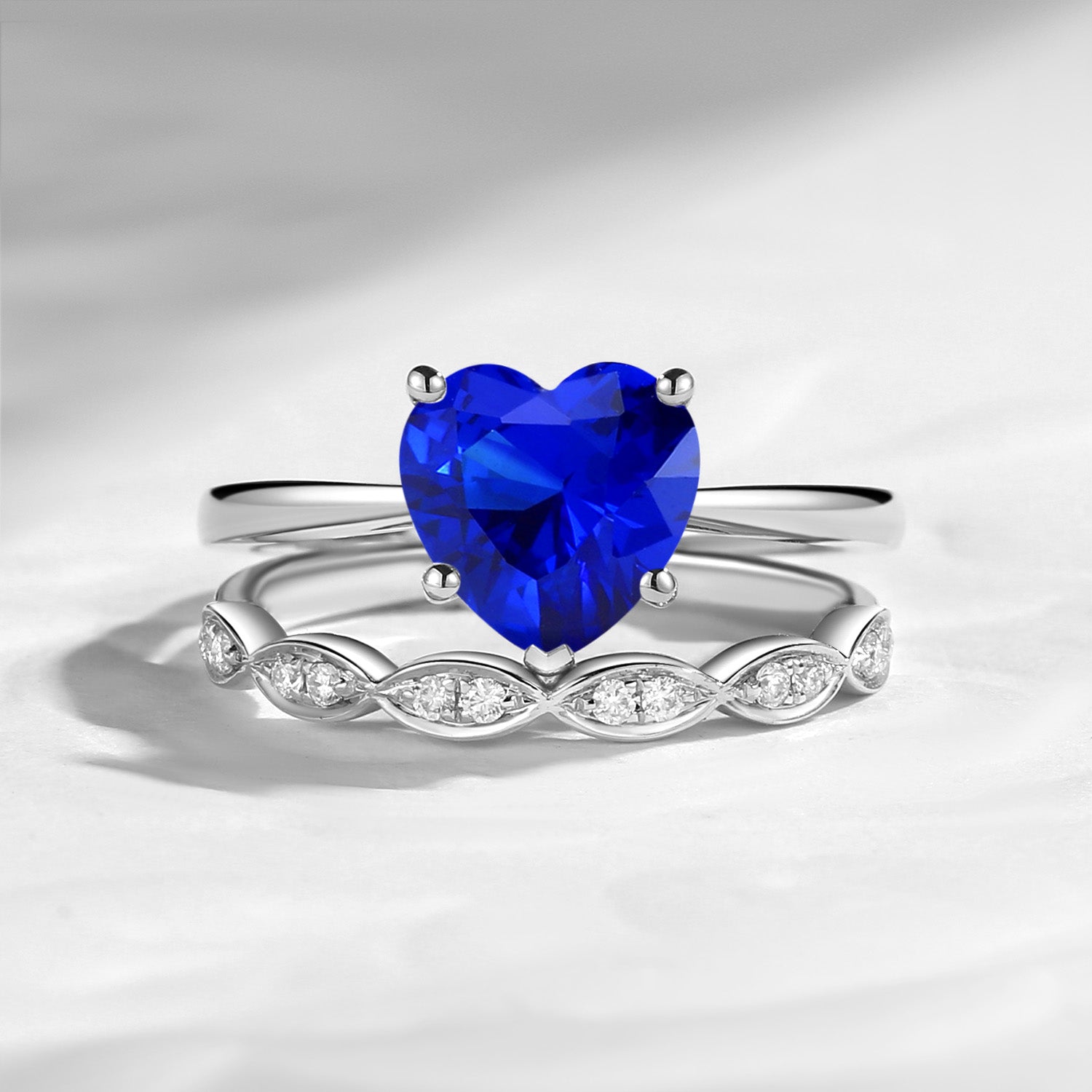 Unique Heart Shaped Solitare Lab Sapphire Engagement Ring 2pcs Set