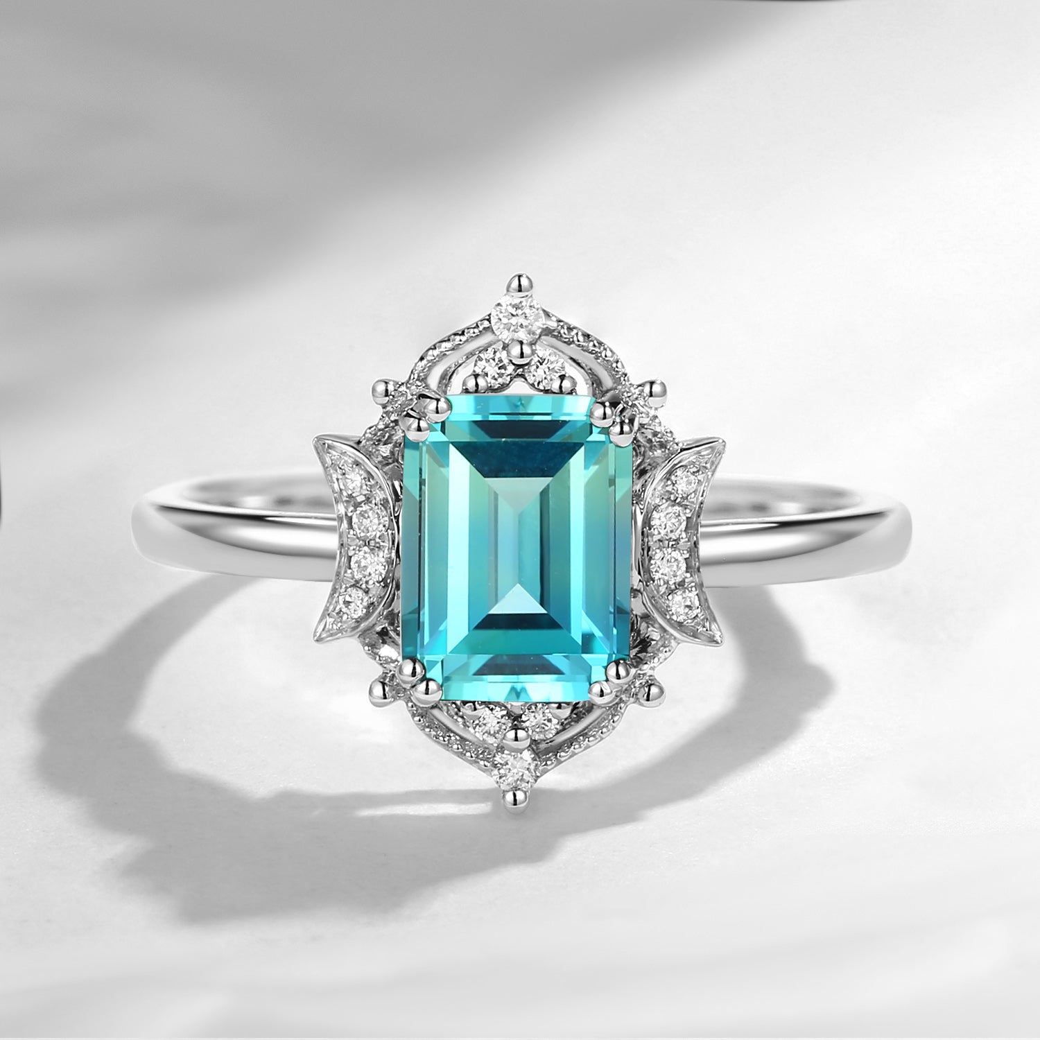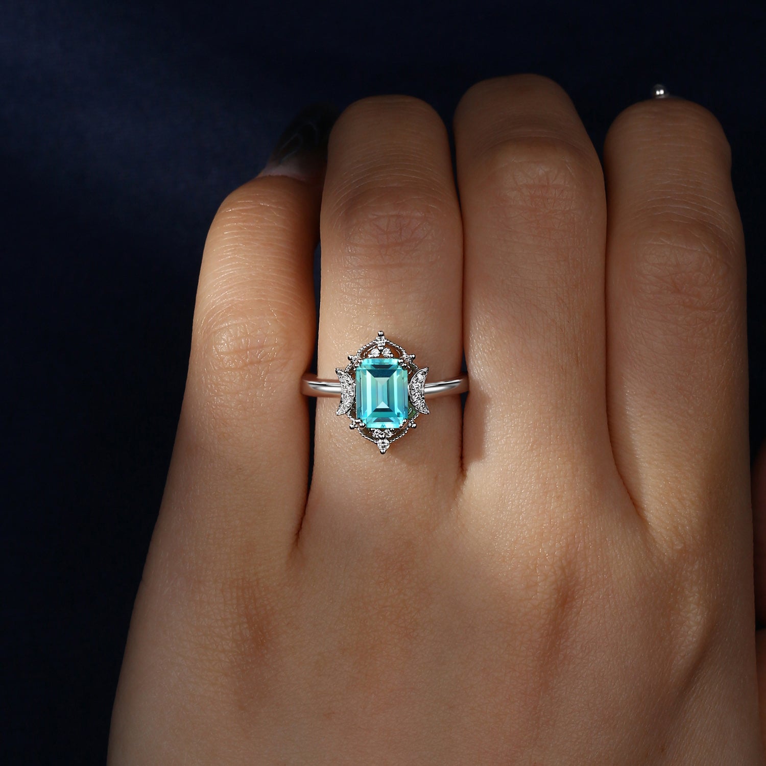 Crescent Moon | Emerald Cut Art Deco Lab Paraiba Engagement Ring