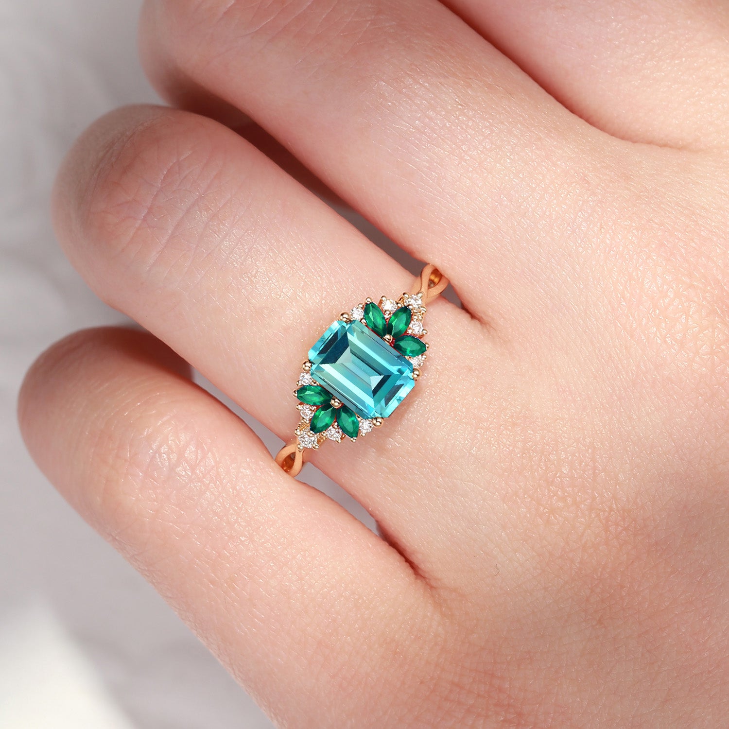 Cluster Emerald Cut Lab Paraiba & Emerald Twist Engagement Ring