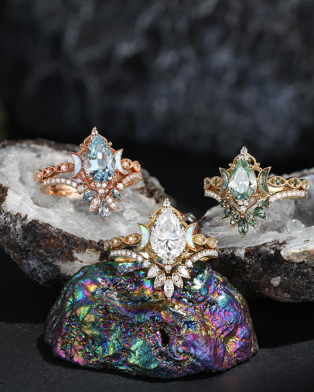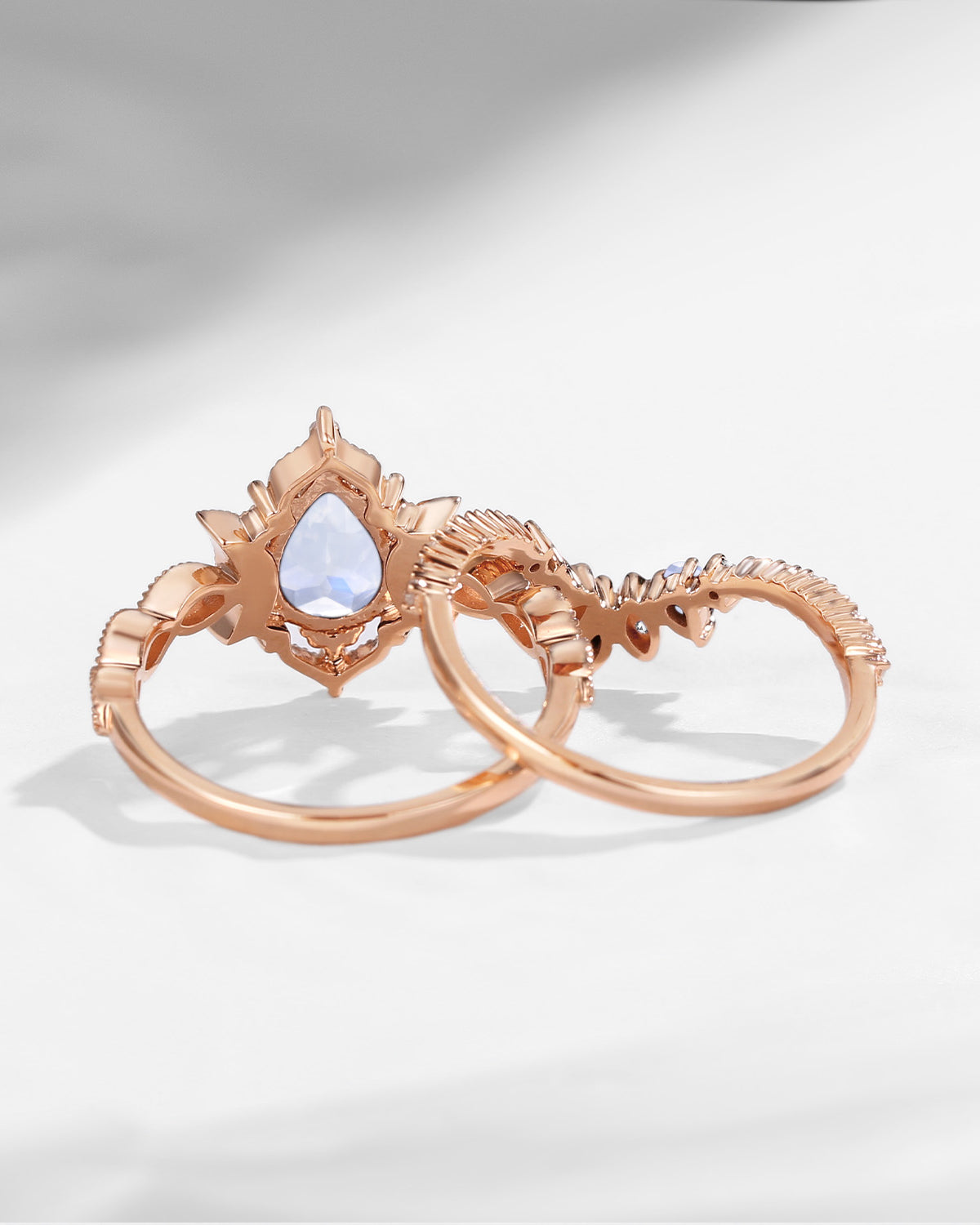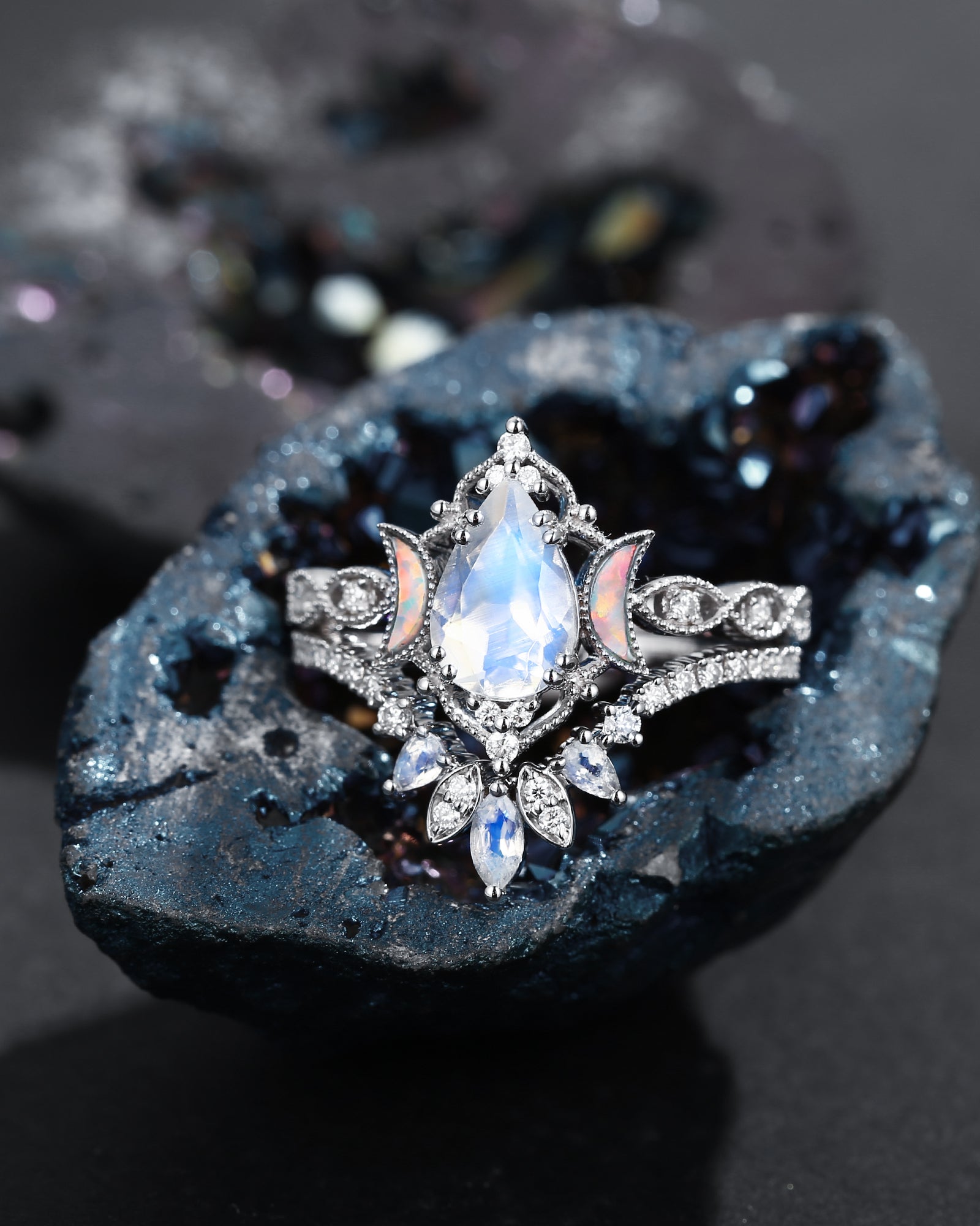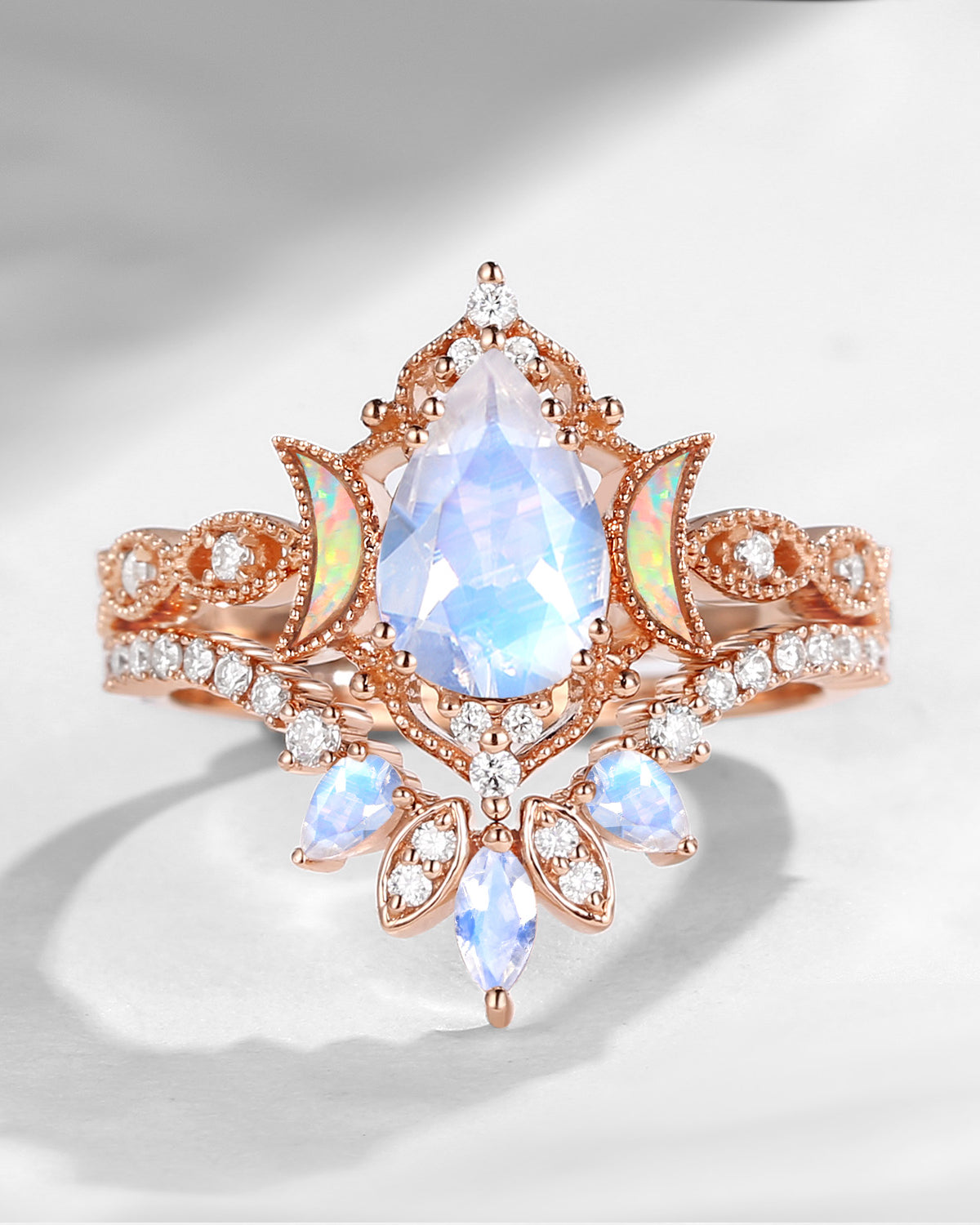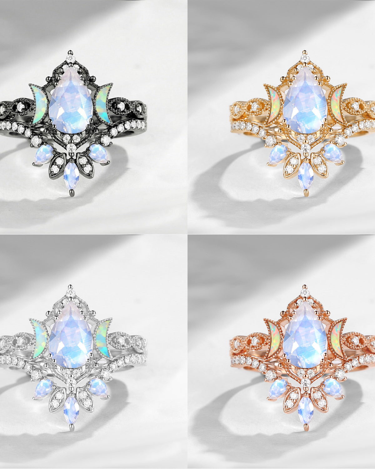 Crescent Moon | Pear Cut Moonstone Galaxy Engagement Ring Set 2PCS 18K