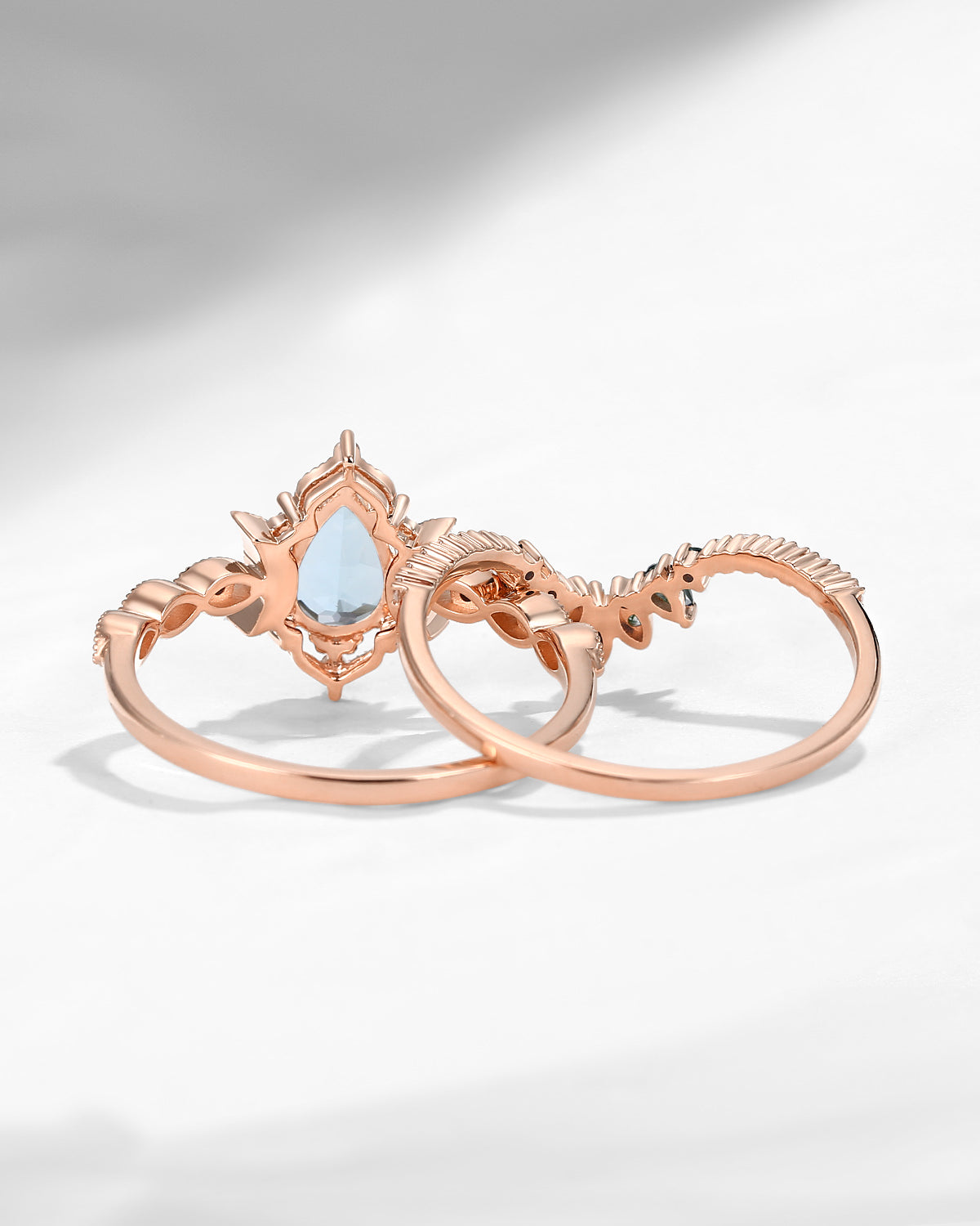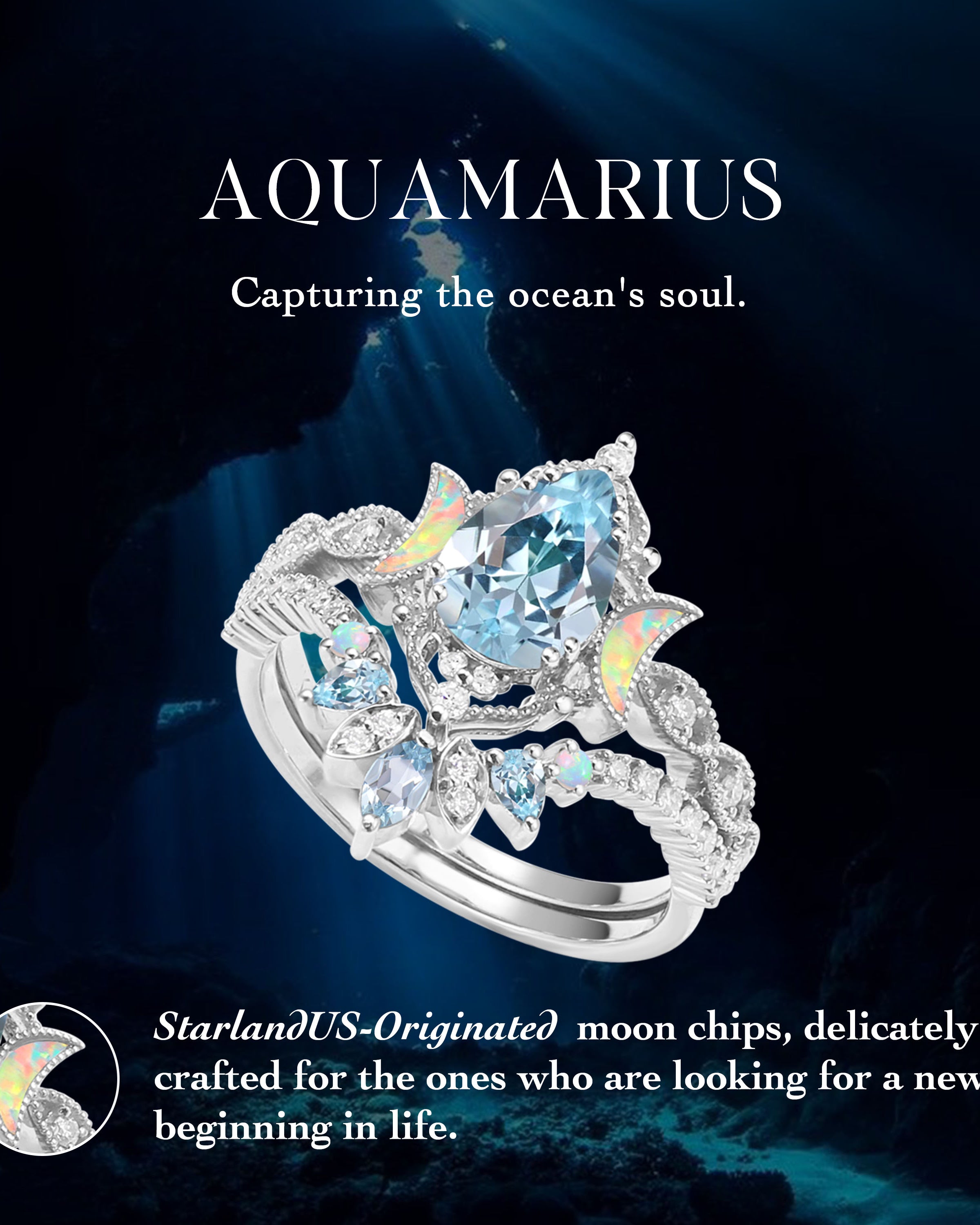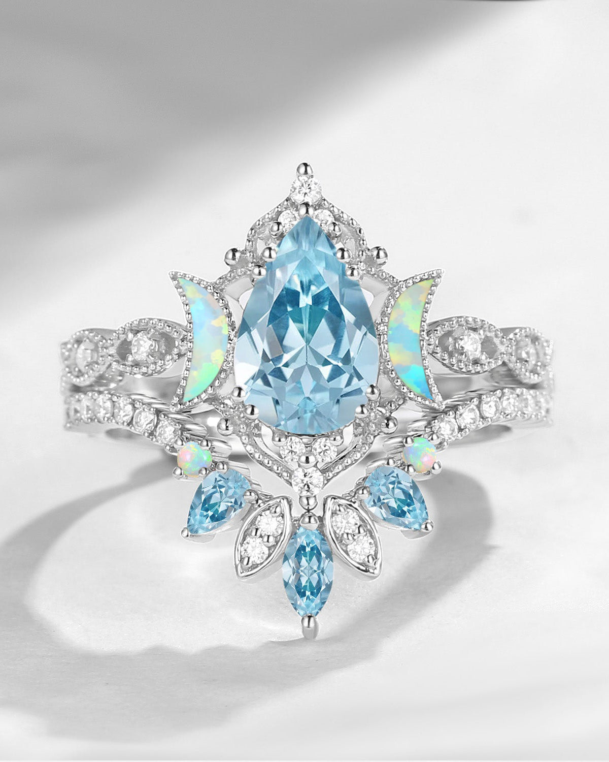 Crescent Moon | Pear Cut Natural Aquamarine 'Ultra Galaxy' Engagement Ring Set 2pcs
