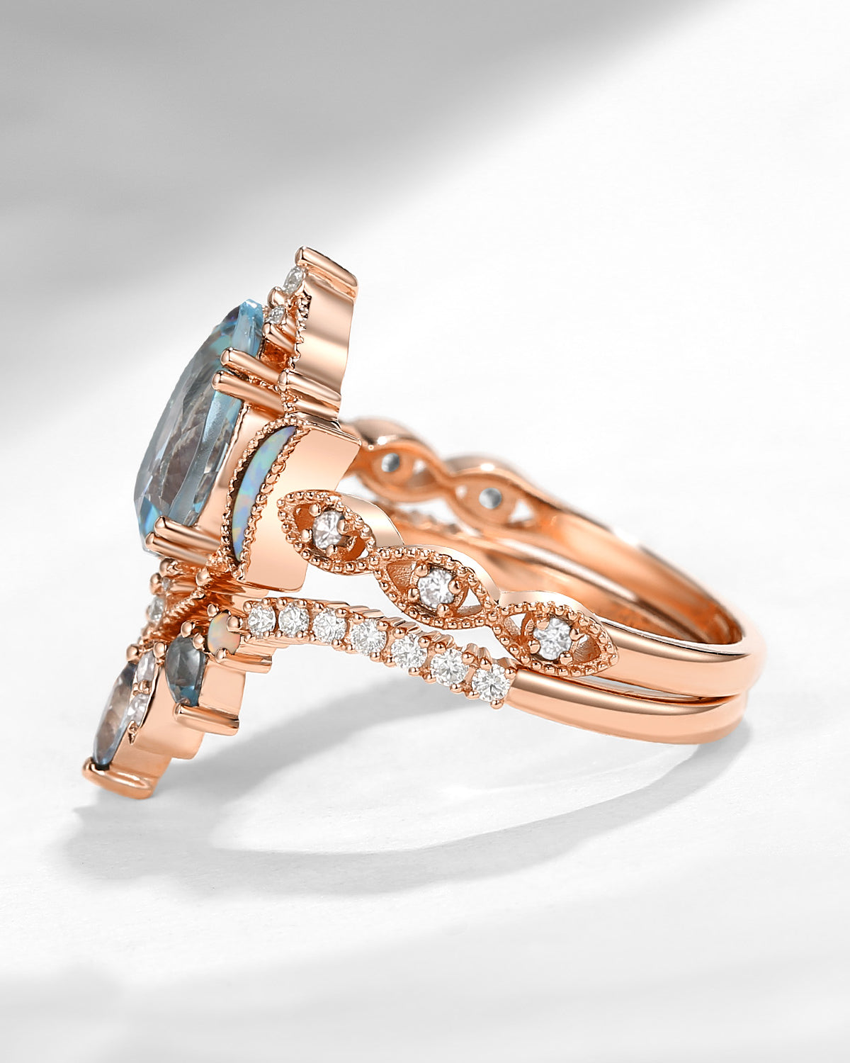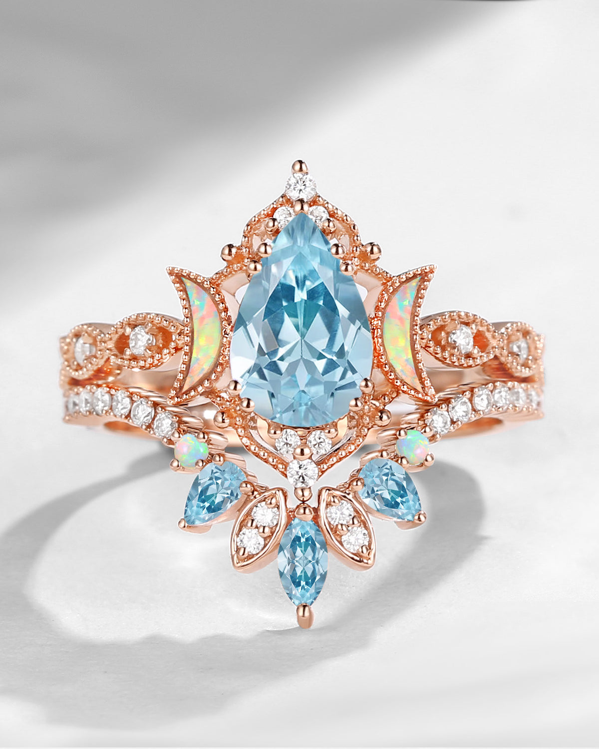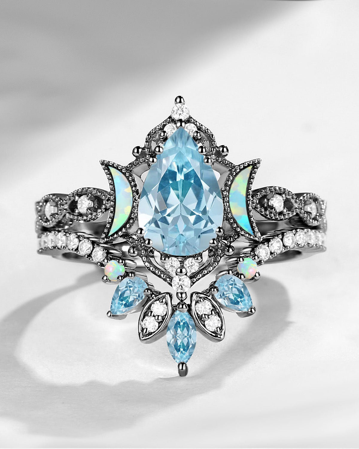 Crescent Moon | Pear Cut Natural Aquamarine 'Ultra Galaxy' Engagement Ring Set 2pcs