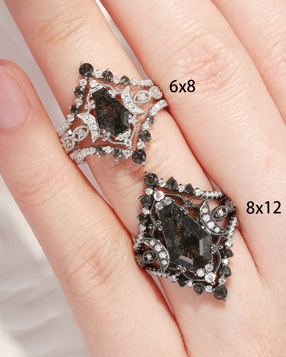 Crescent Moon | Coffin Cut Black Rutilated Quartz 'Black Statement' Ring Set 2pcs