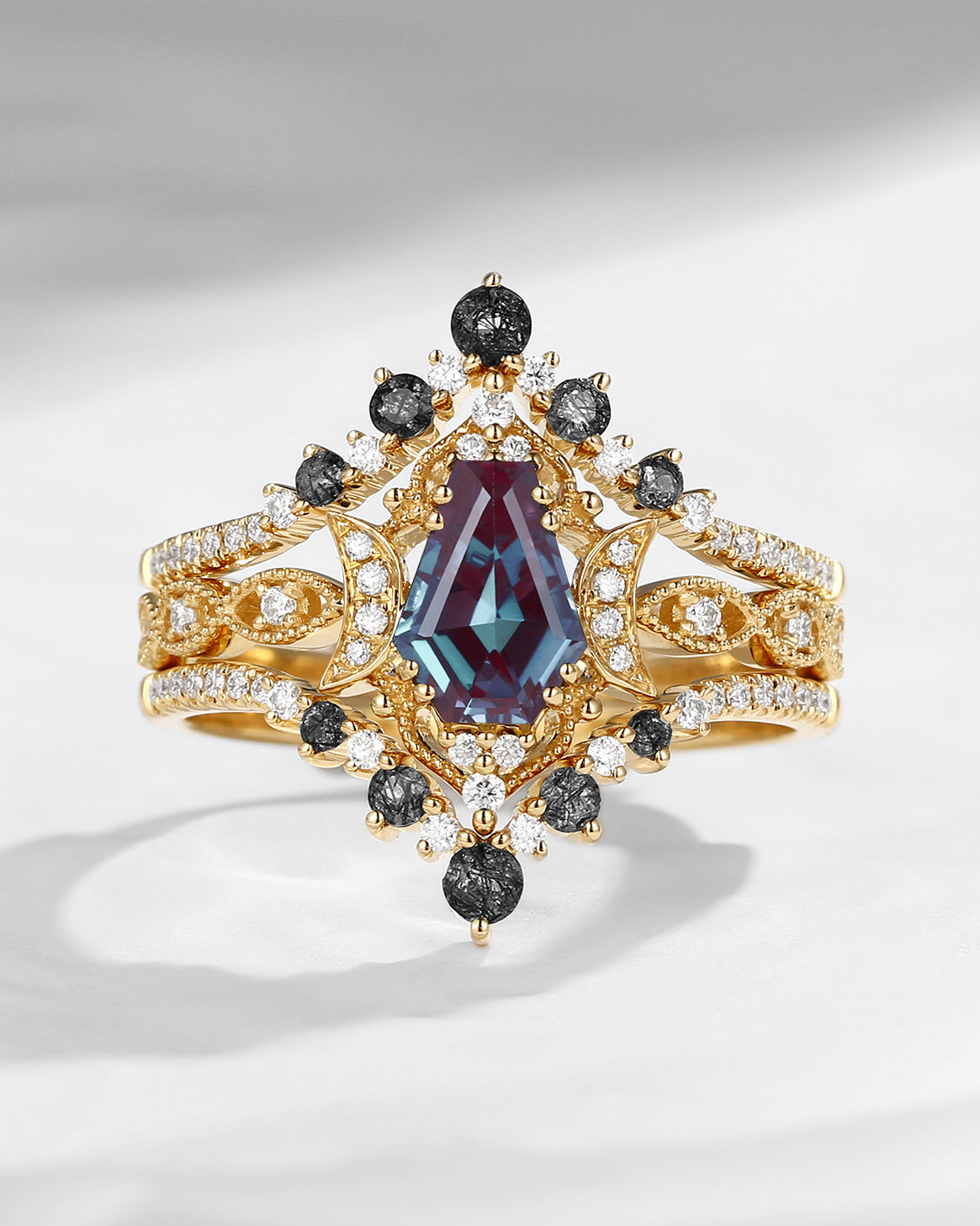 Crescent Moon | Coffin Faceted Lab Alexandrite Engagement Ring Set 3PCS