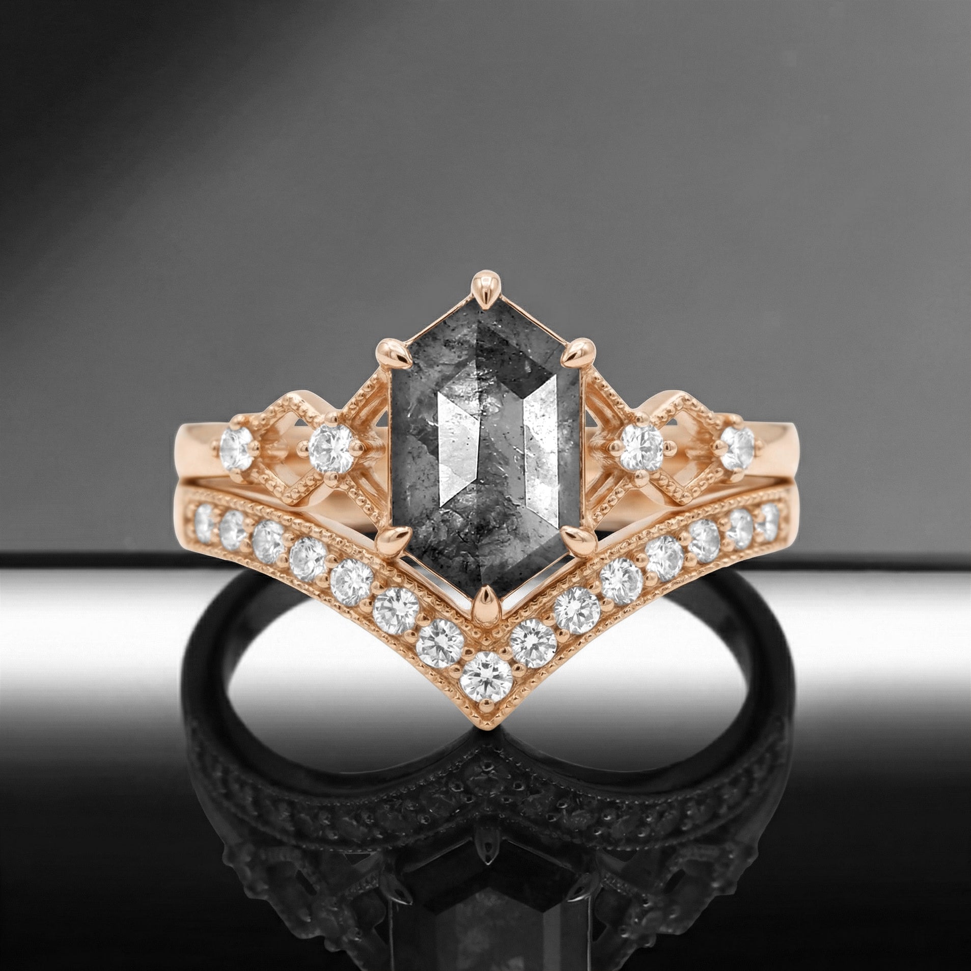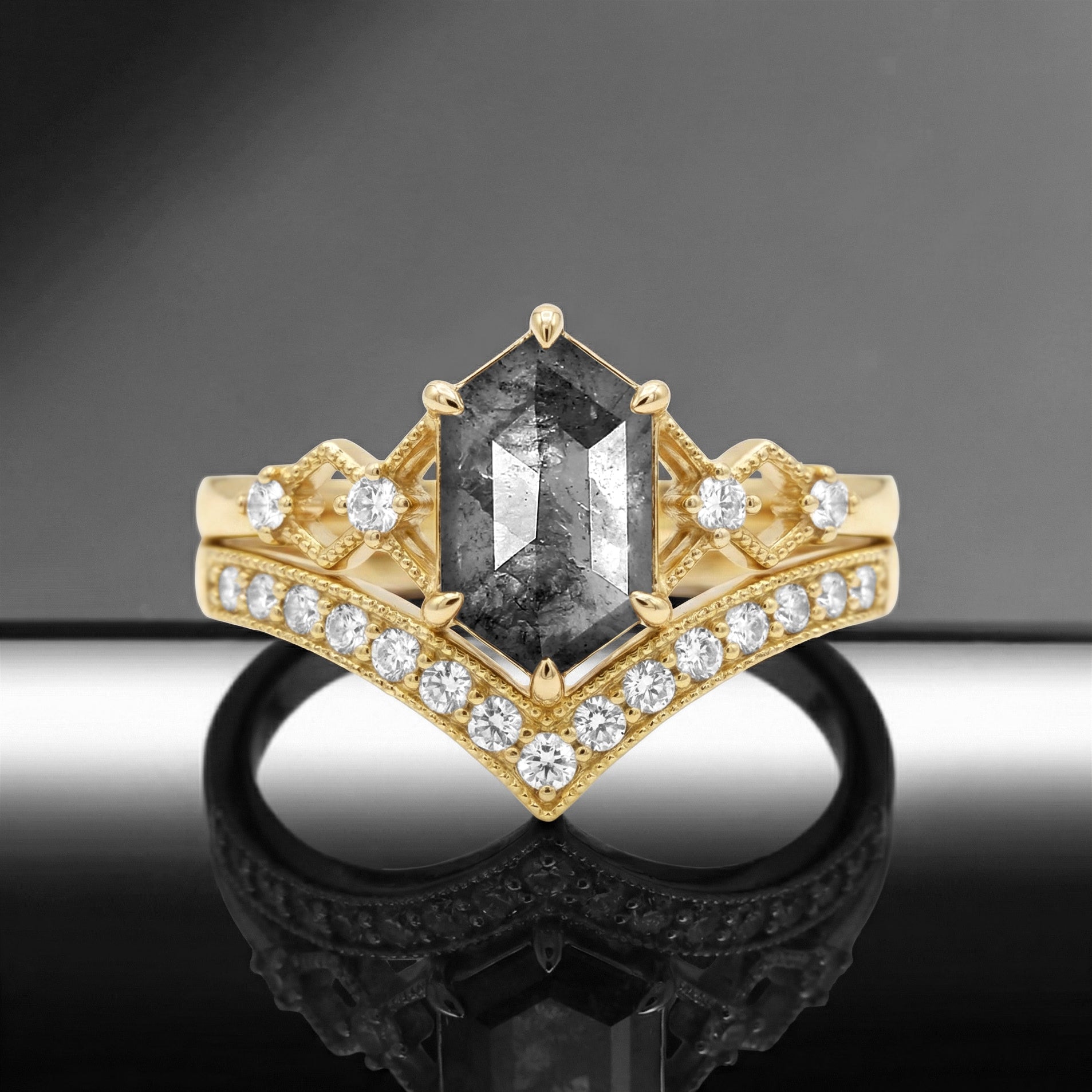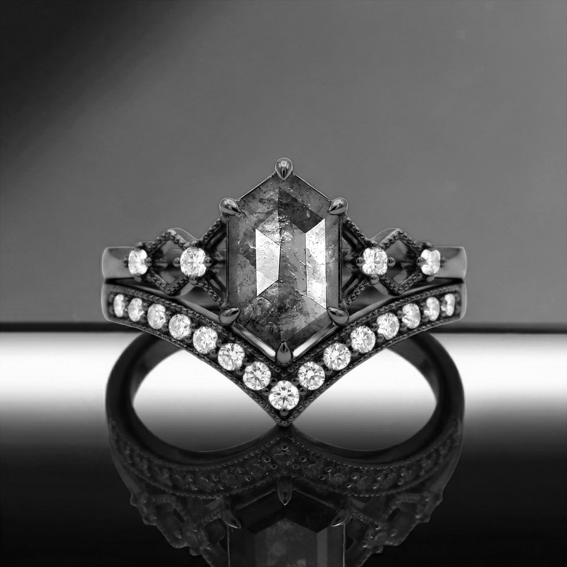 Art-Deco Long Hexagon Salt and Pepper Diamond Engagement Ring Set 2pcs