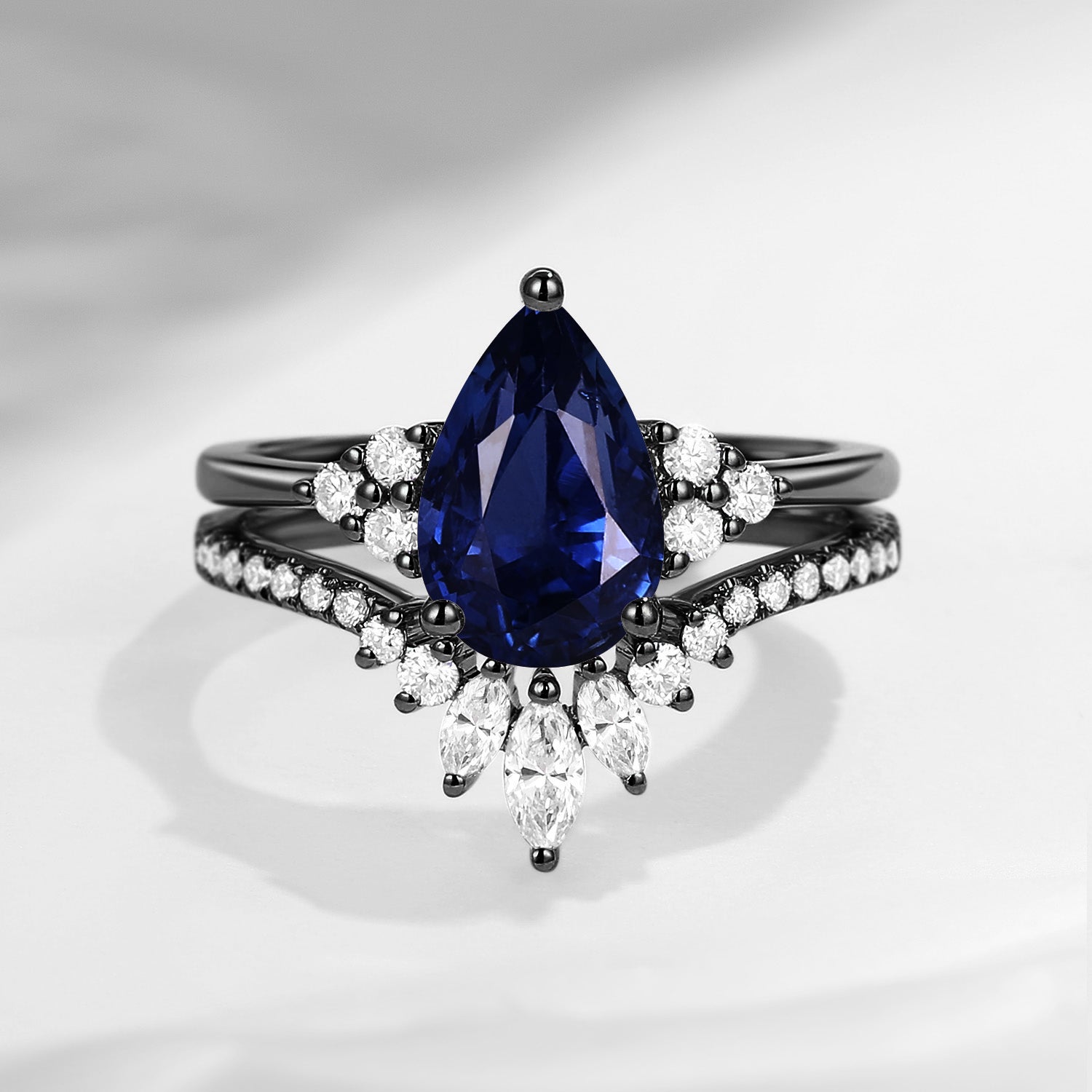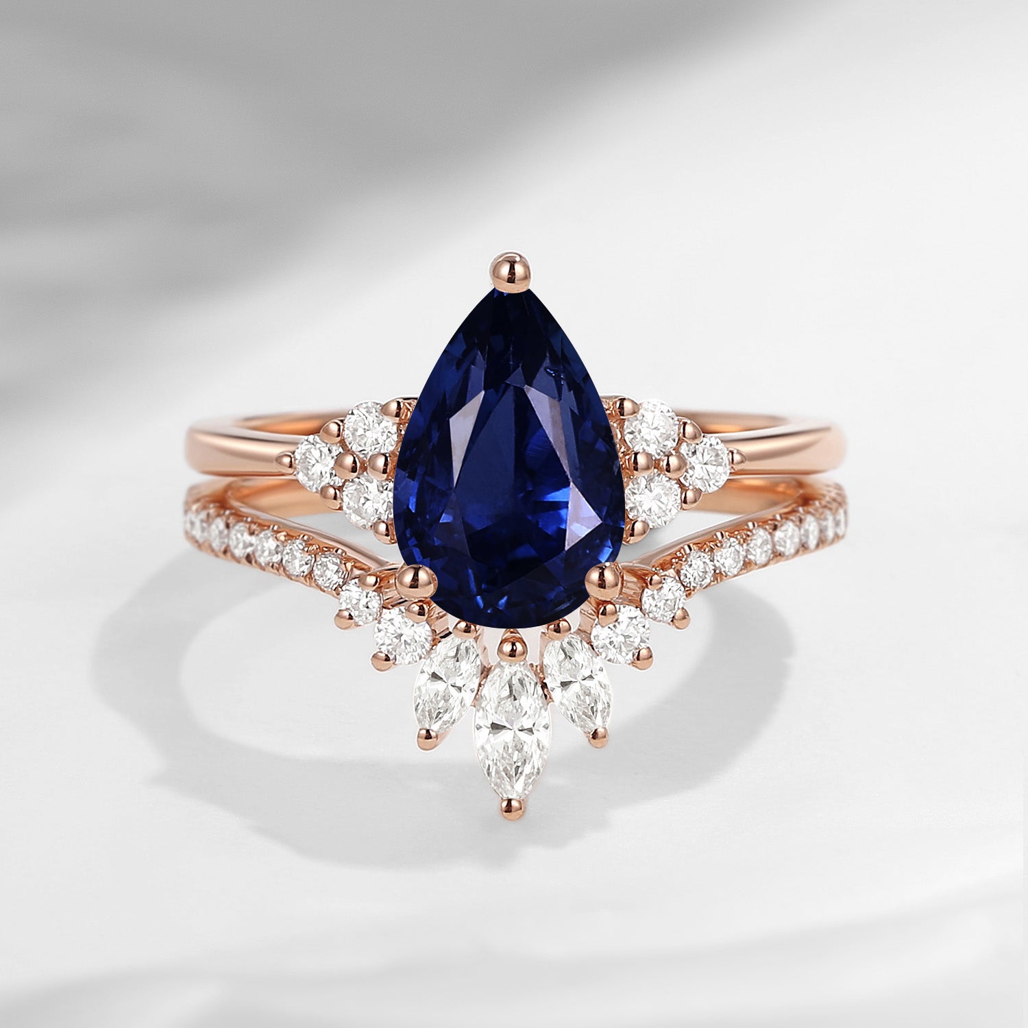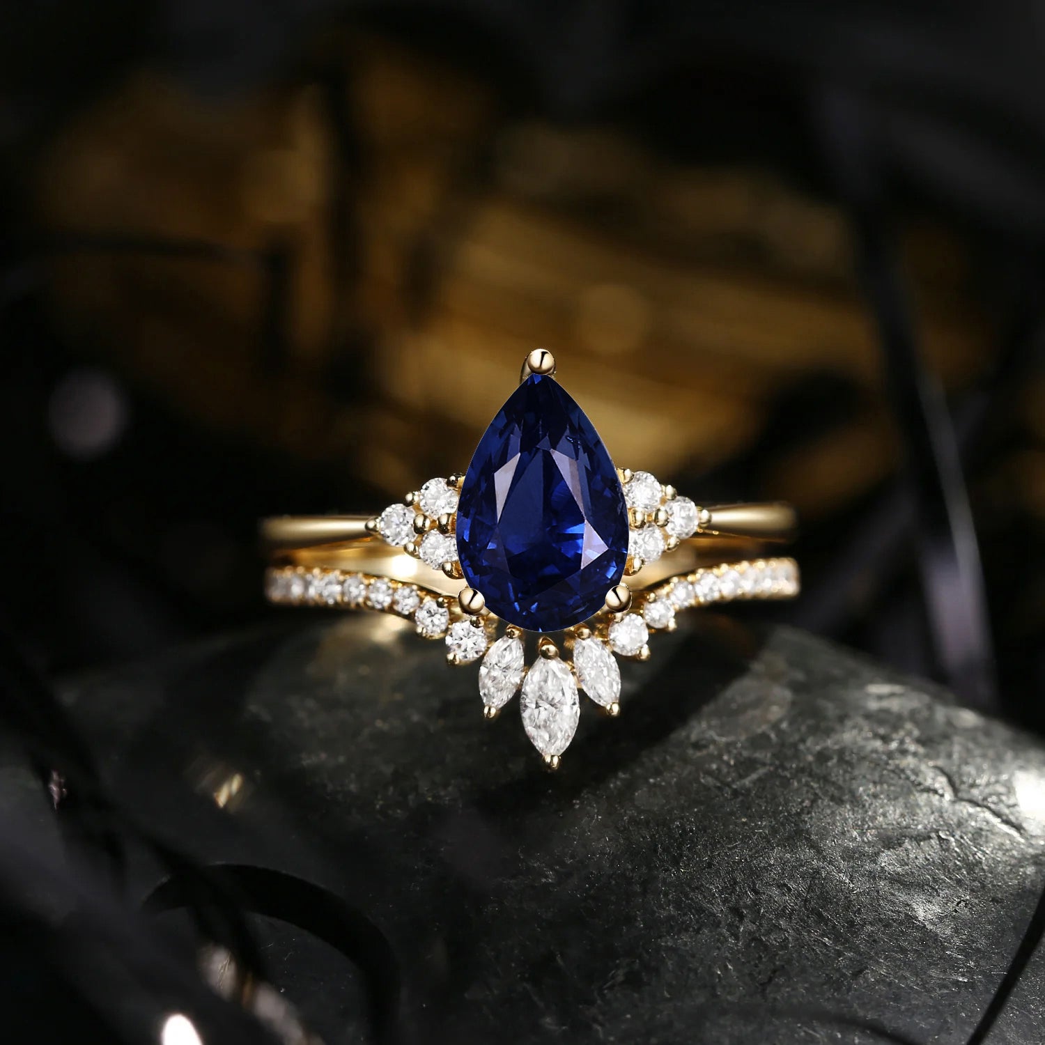 Classic Style Pear Natural Sapphire Cluster Engagement Ring Set 2pcs - Vivian