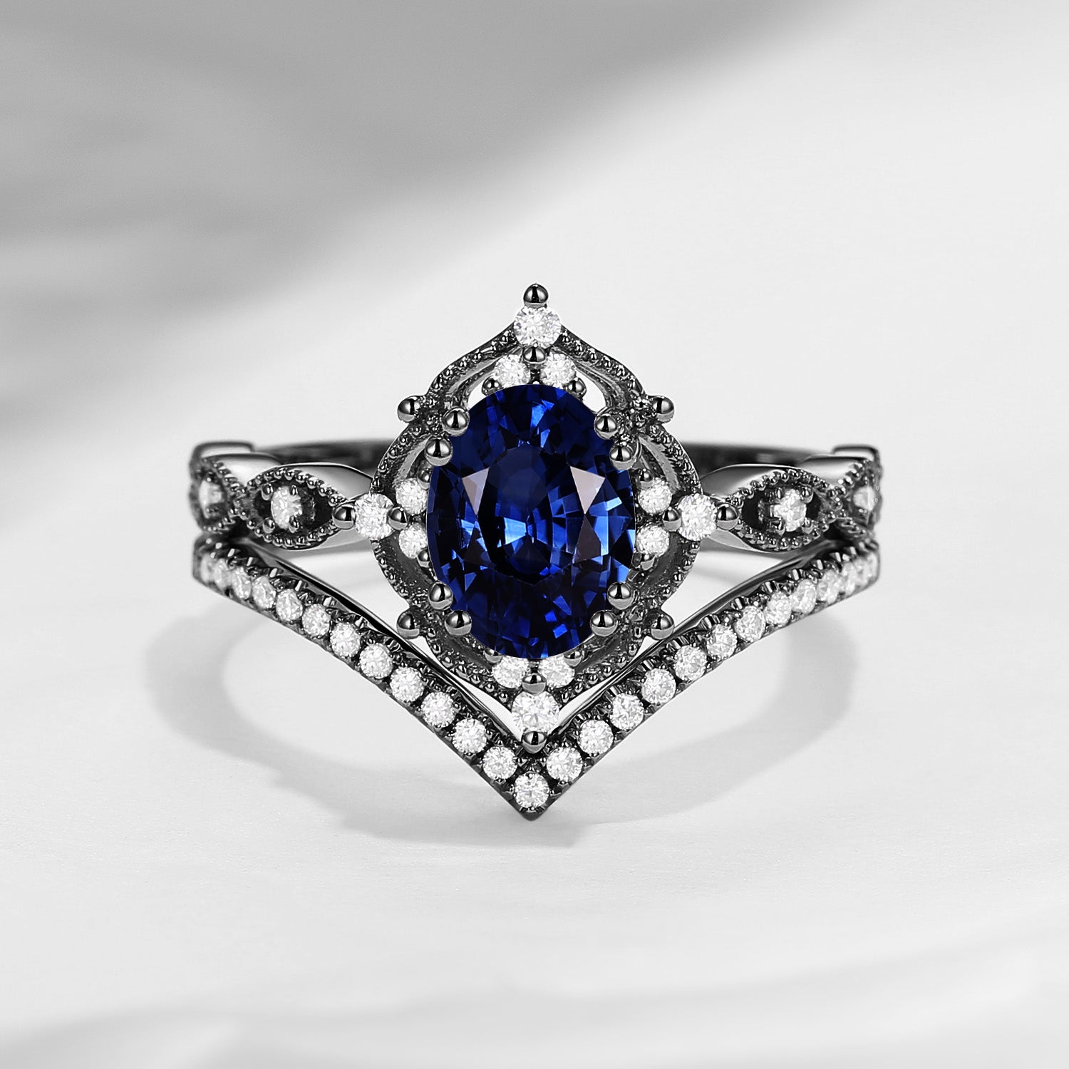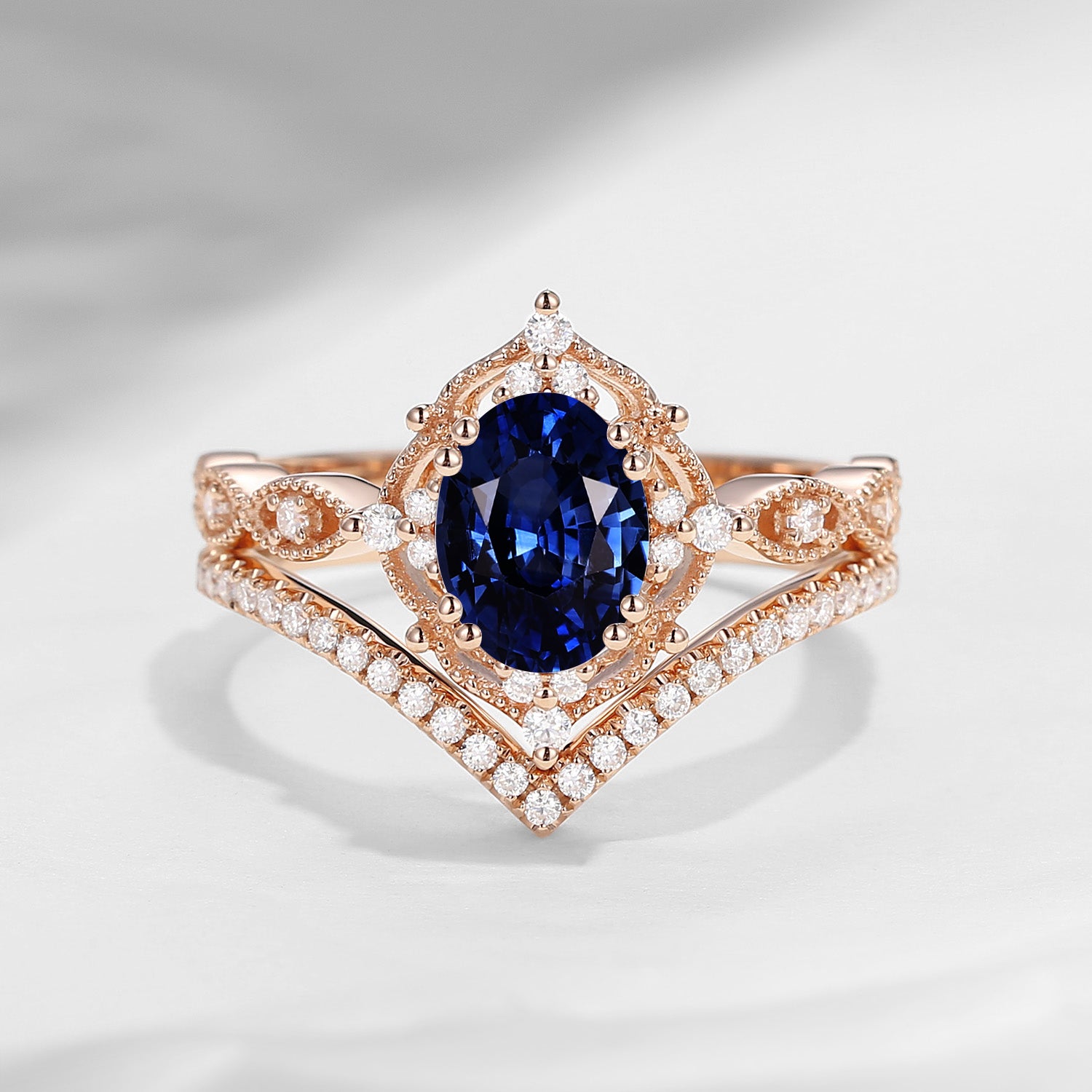 Natural Sapphire Bridal Set Rose Gold Cluster Rings Oval Engagement Ring V Shaped Chevron Band Milgrain Band 2pcs Vintage Inspired