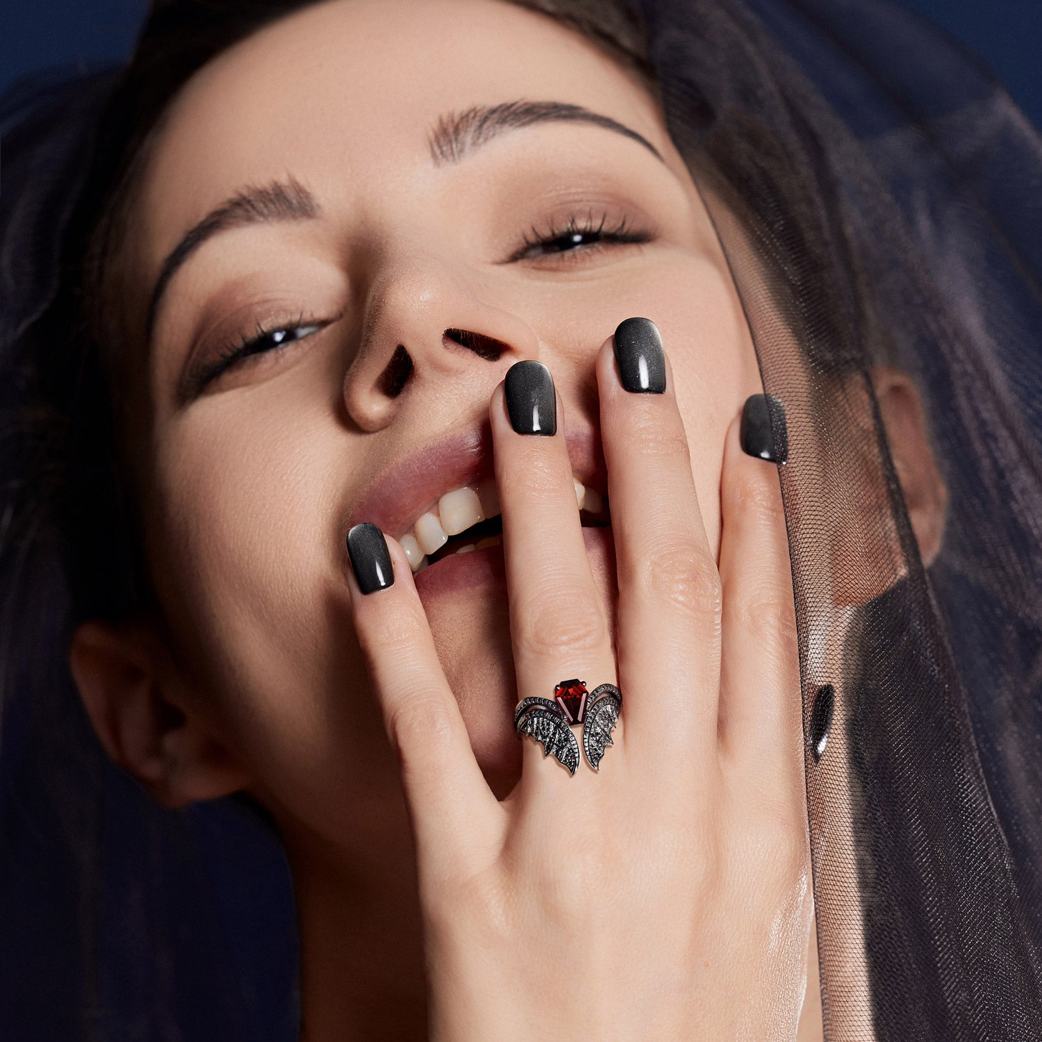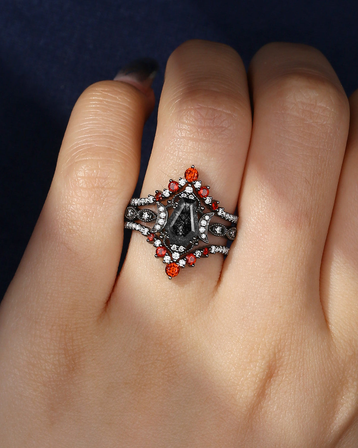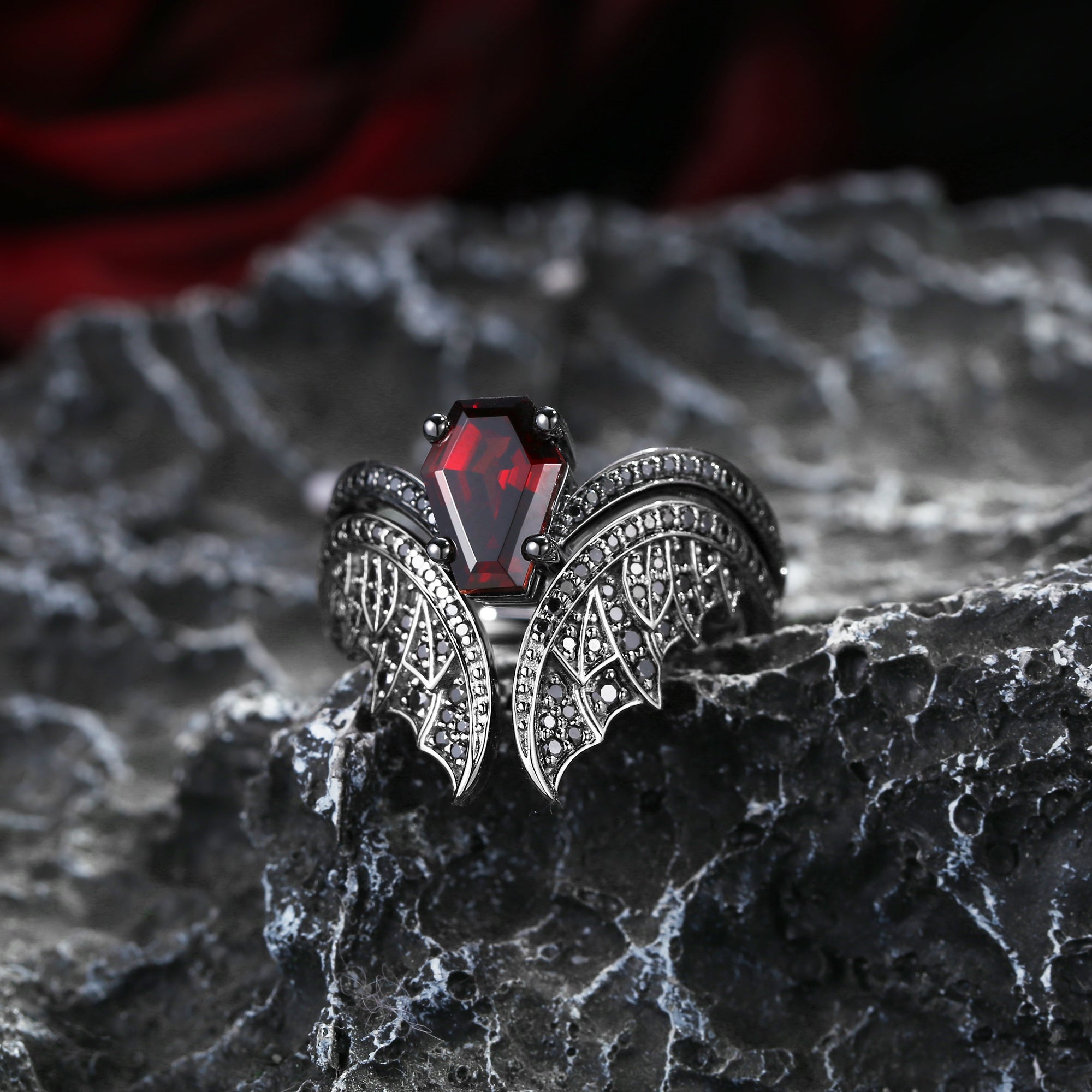 Coffin Cut Garnet Vintage Black Gold Bridal Set 2pcs - Bat Ring