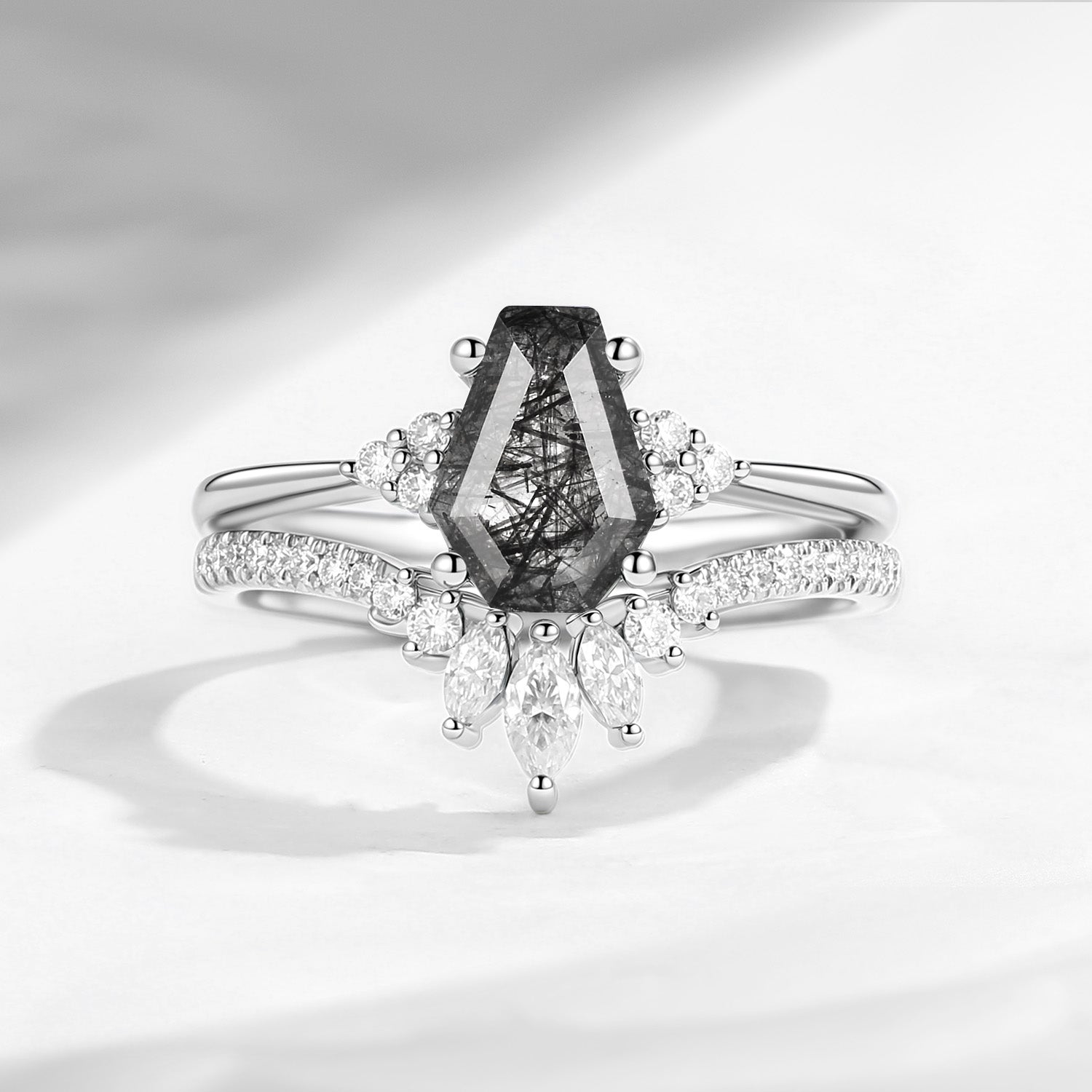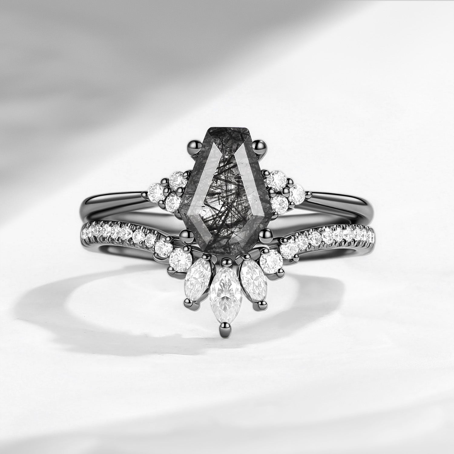 Coffin Black Rutilated Quartz Engagement Ring 2PCS - White Dress