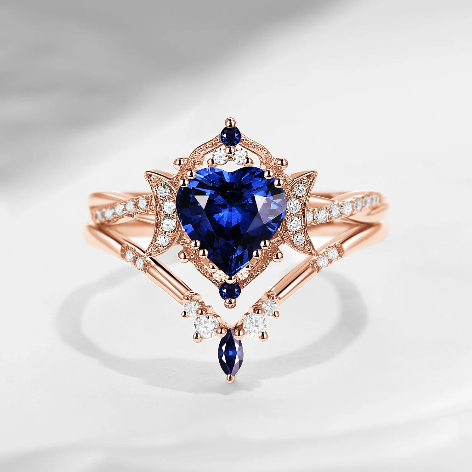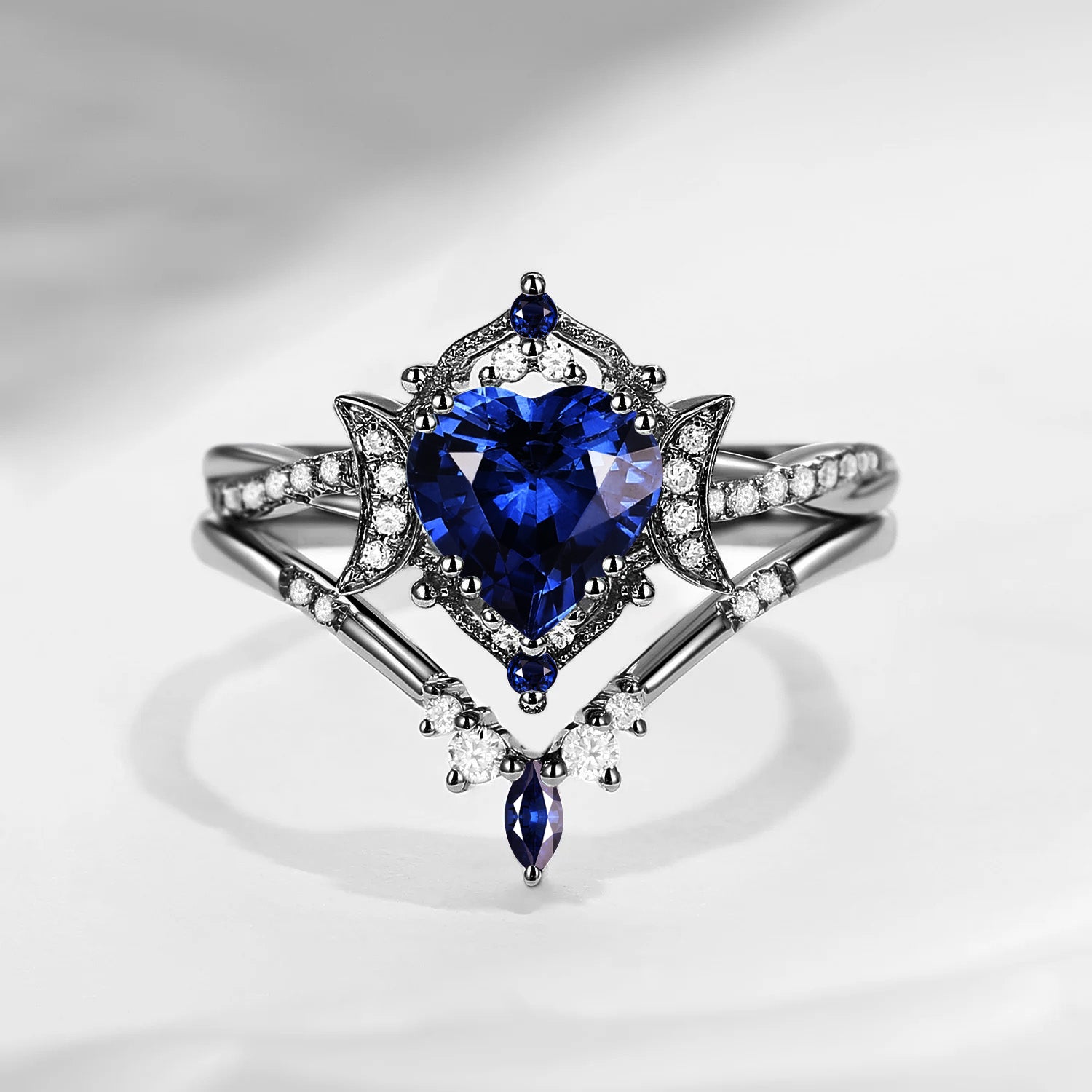 Crescent Moon | Heart Shaped Natural Sapphire Infinity Engagement Ring Set 2pcs - Alexandria