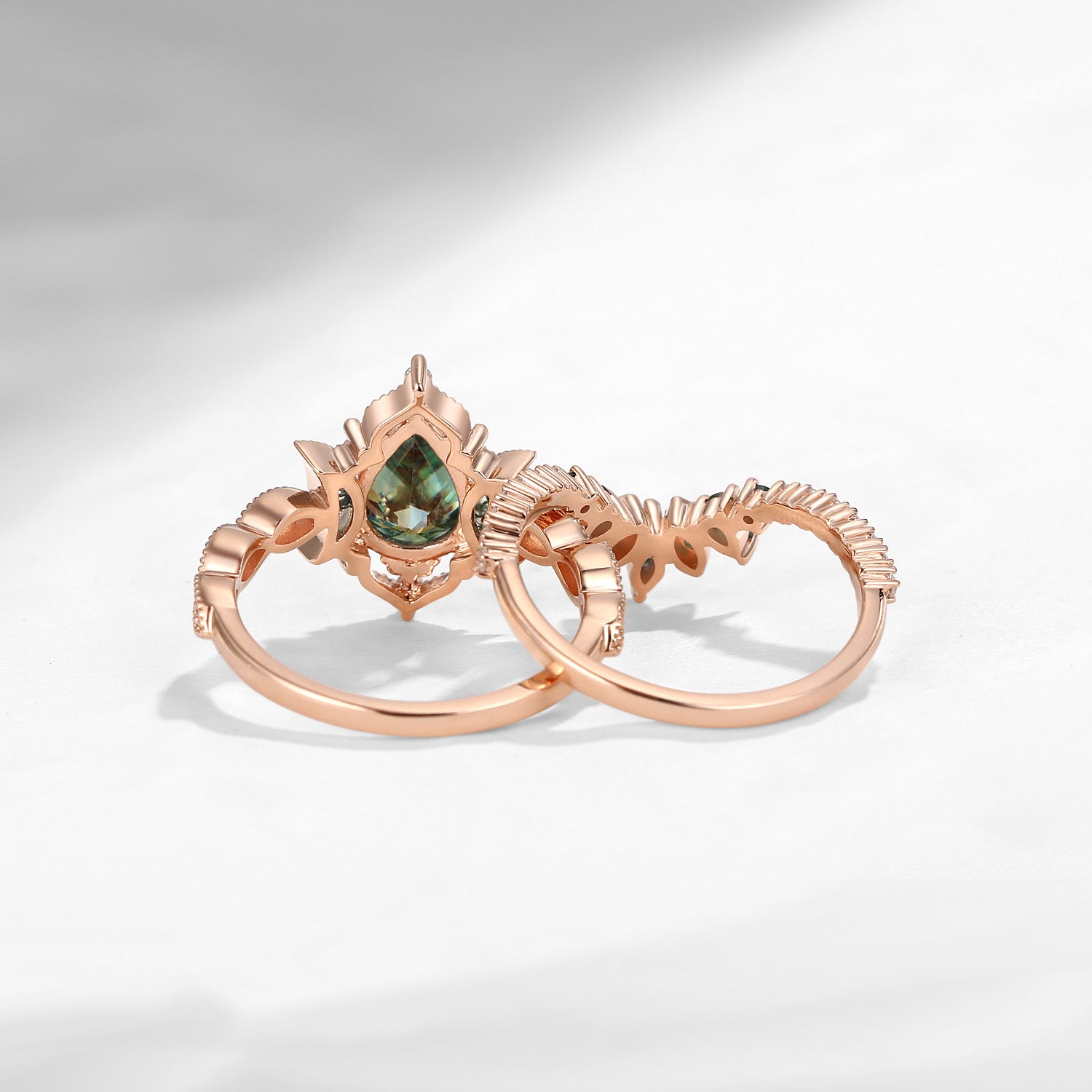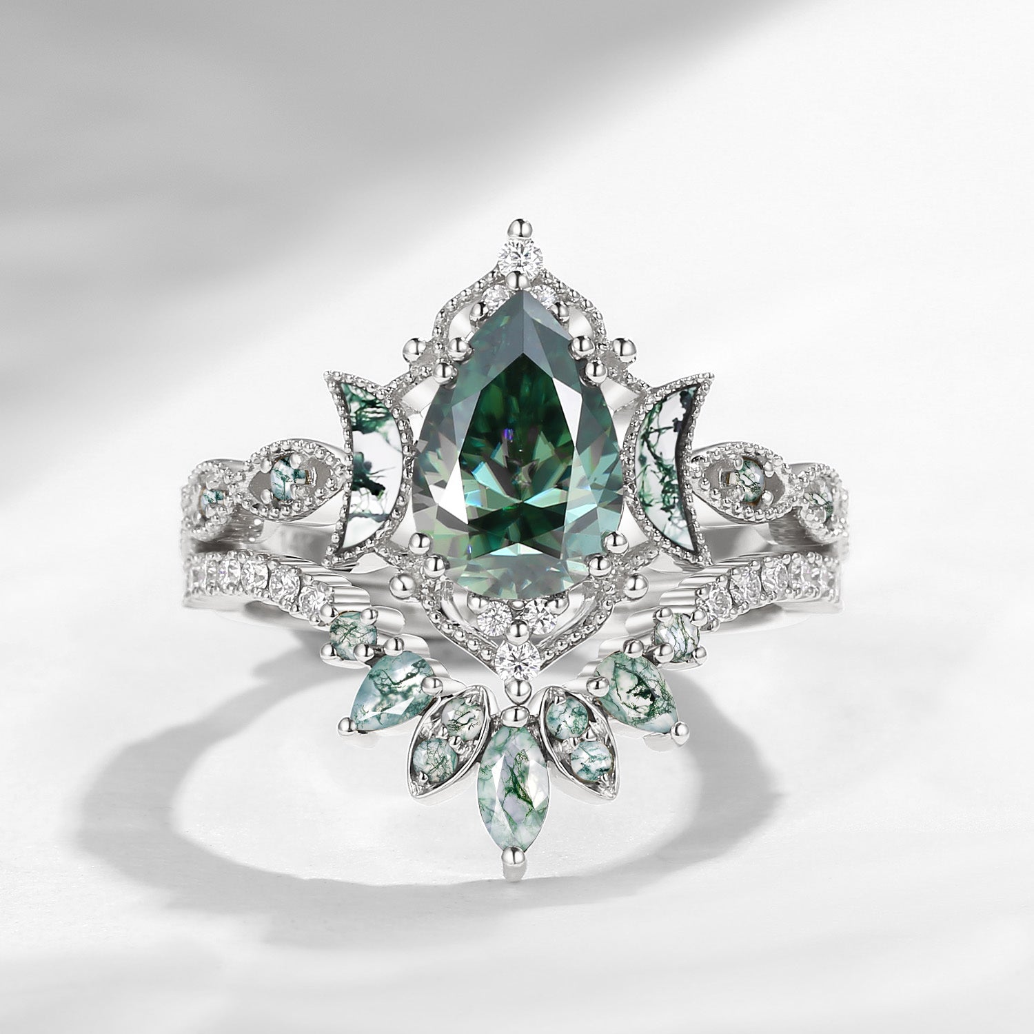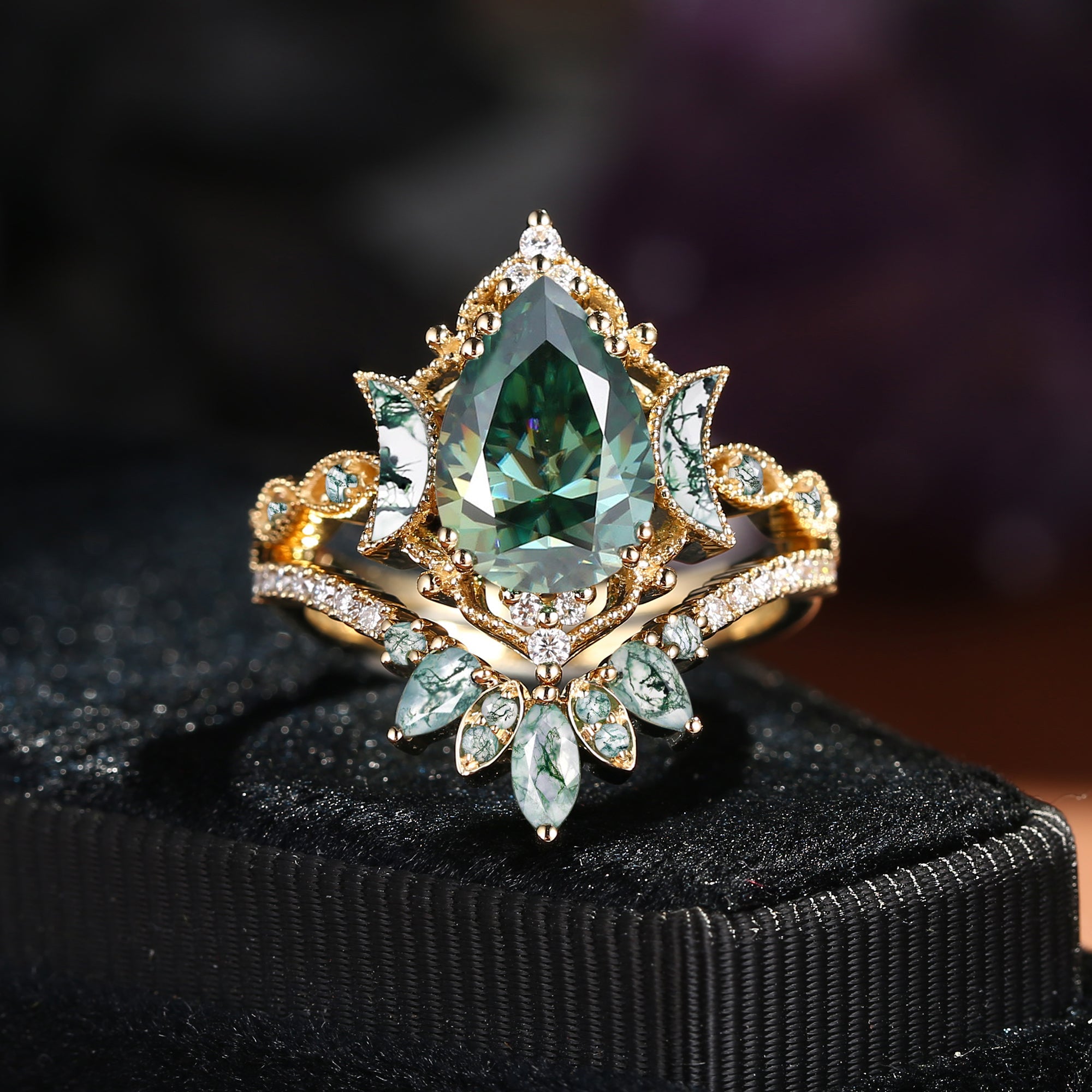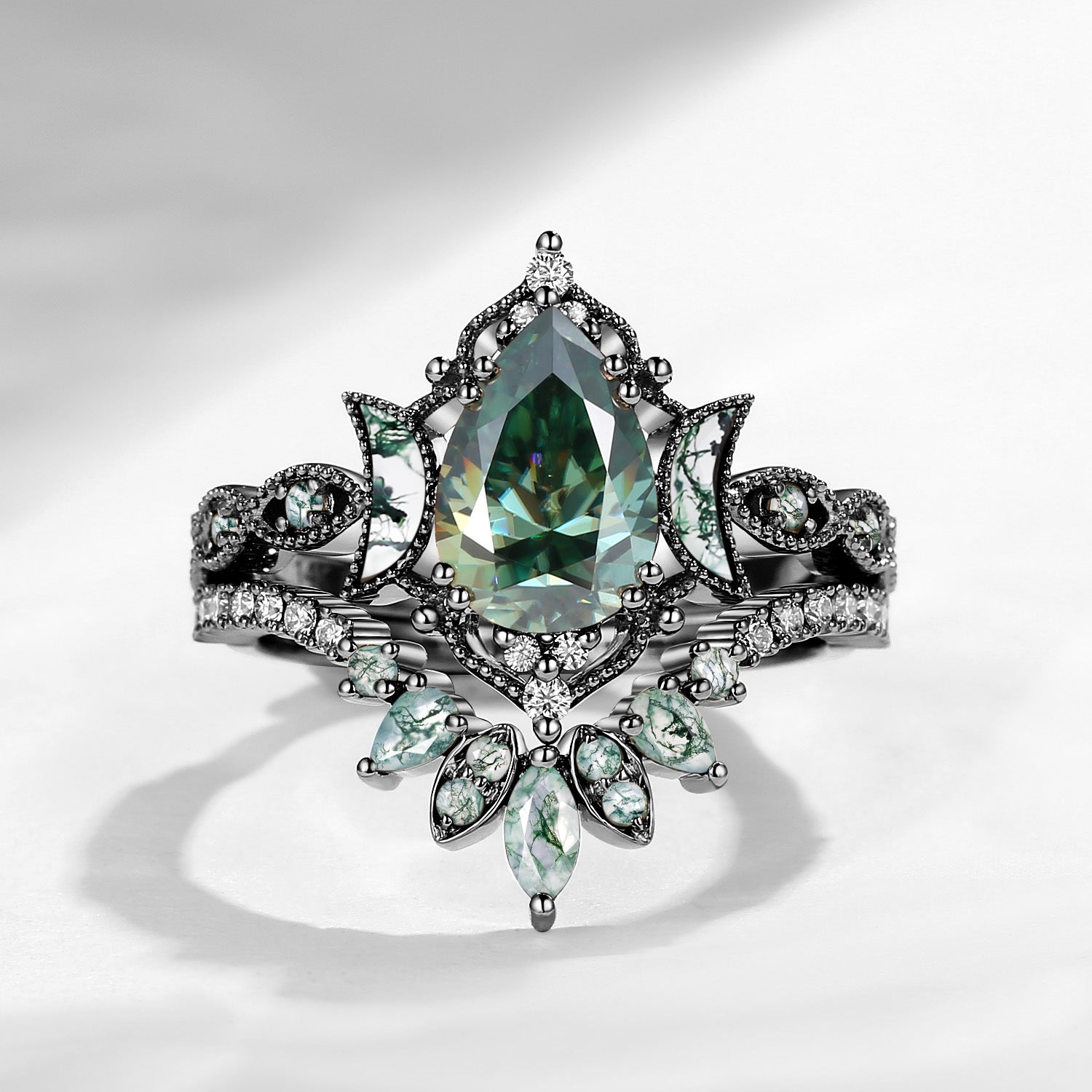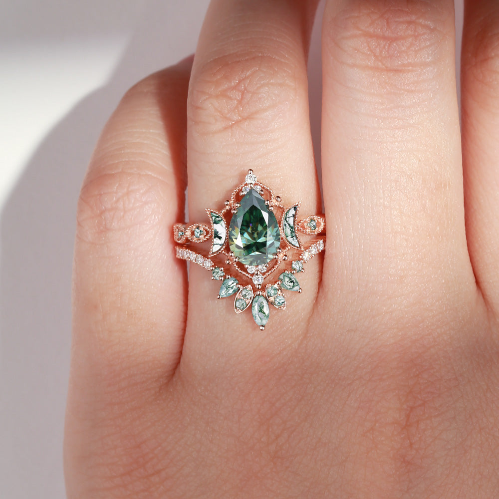 Crescent Moon | Pear Cut Green Moissanite 'Ultra Galaxy' Engagement Ring Set 2pcs