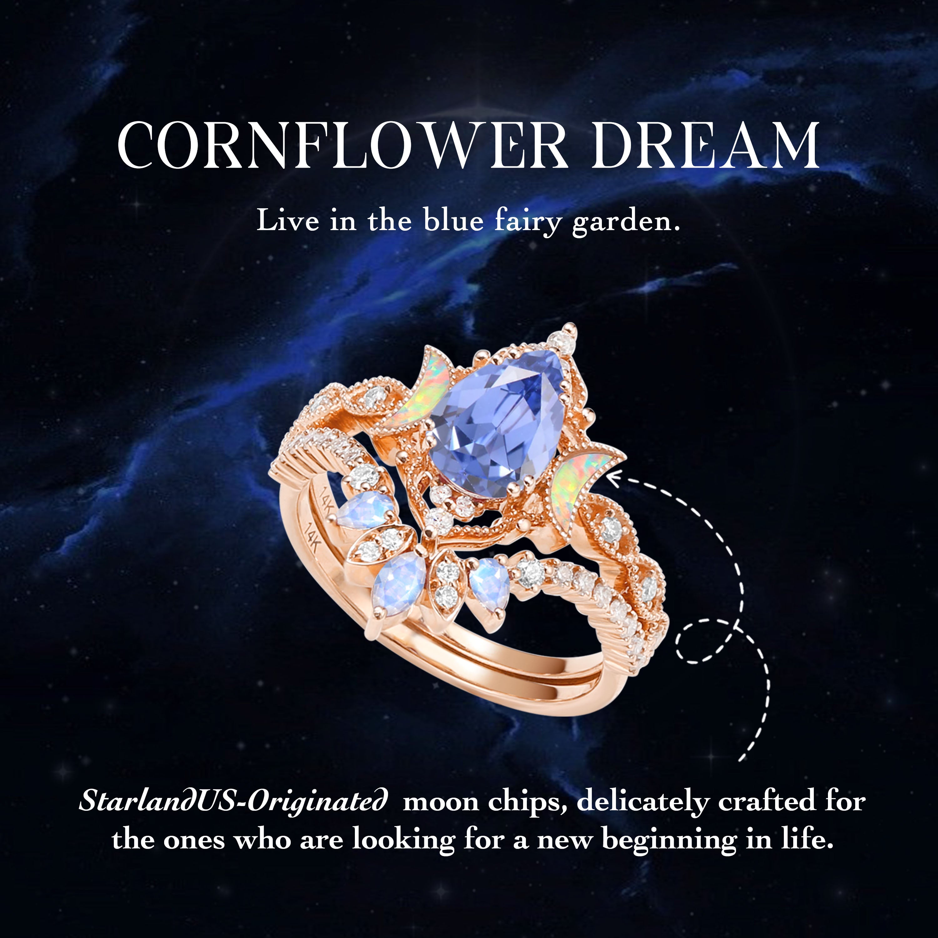 • Design - Two masterfully cut moon shaped gems guarding the center pear, clustered by little sparkly accents, mimicking a galaxy-like setting. A romantic Sci-Fi fiction at its finest.