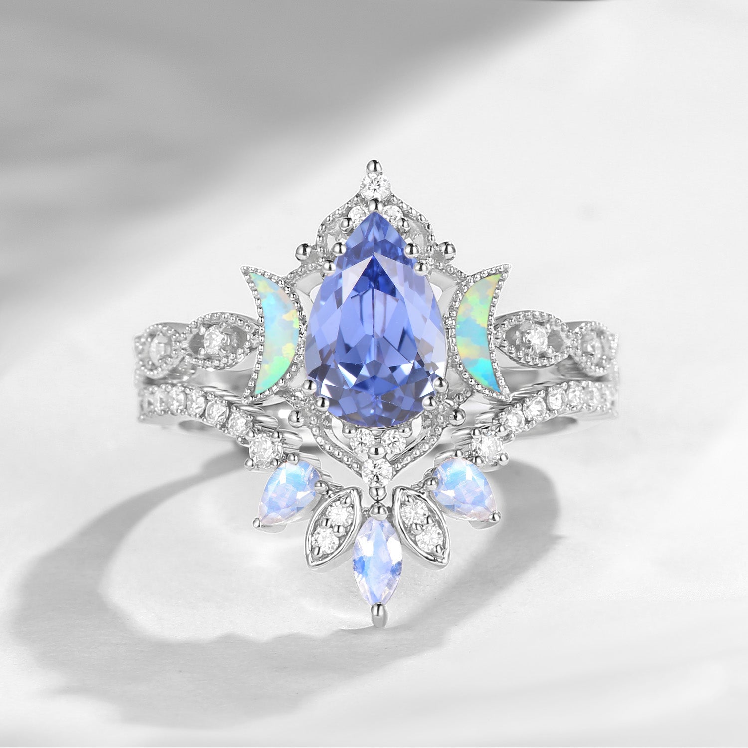 Crescent Moon | Pear Cut Lab Cornflower Sapphire 'Ultra Galaxy' Engagement Ring Set 2pcs