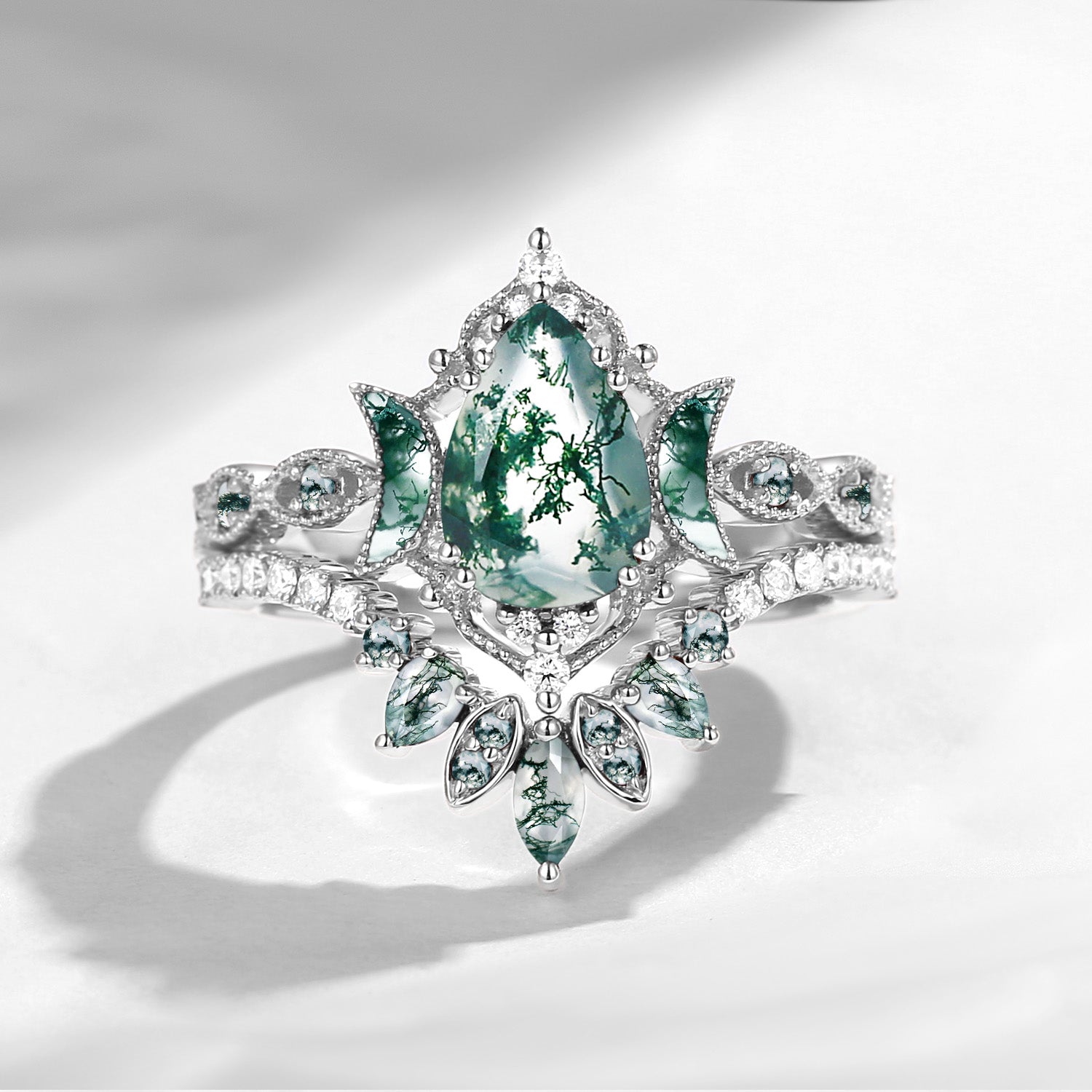 Crescent Moon | Unique Pear Shape Moss Agate Engagement Ring Set 2pcs - Luna