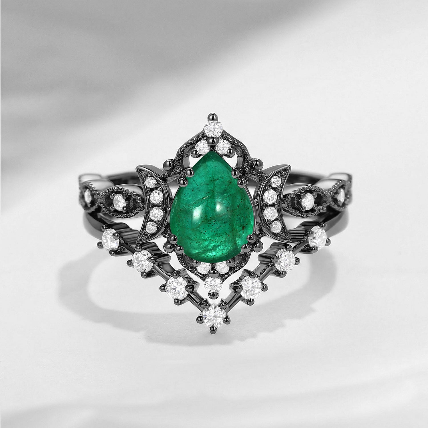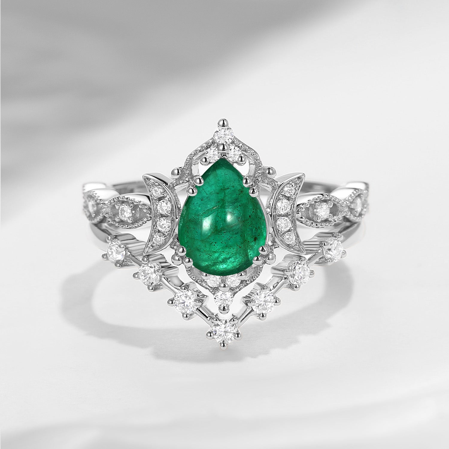 Natural Emerald Engagement Ring White Gold Moon Crescent Ring Set 2pcs Pear Shaped Engagement Ring Alternating Ring Anniversary Gift