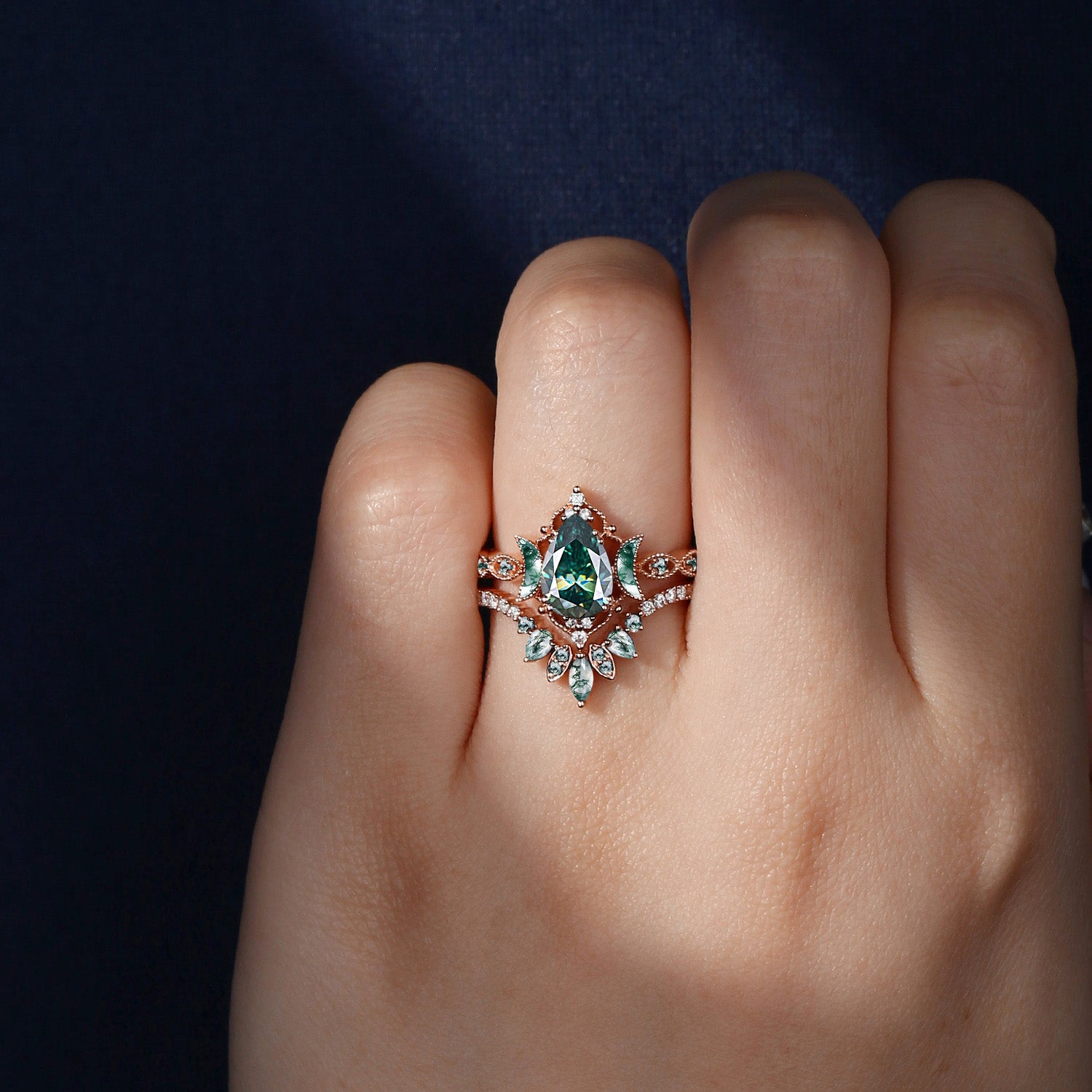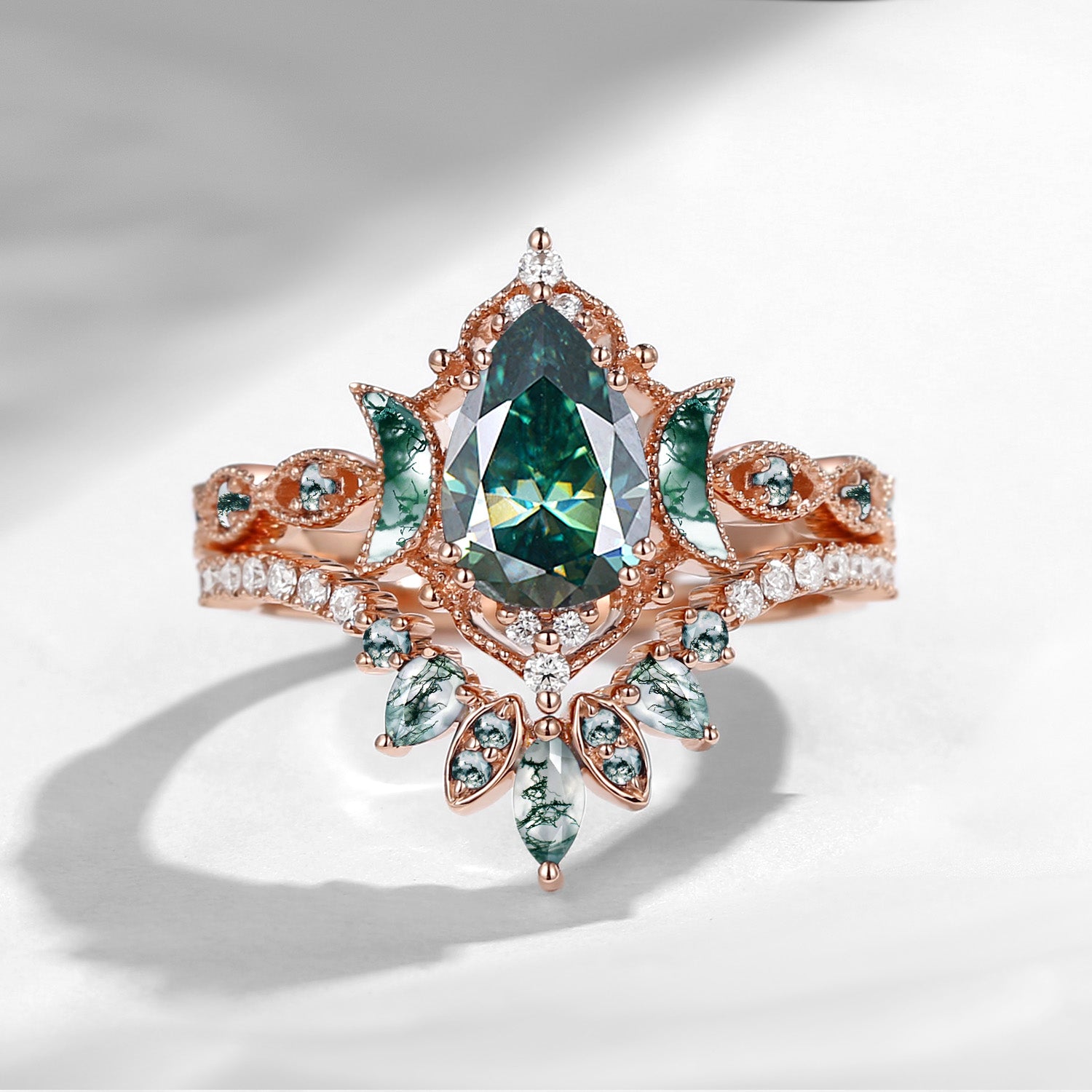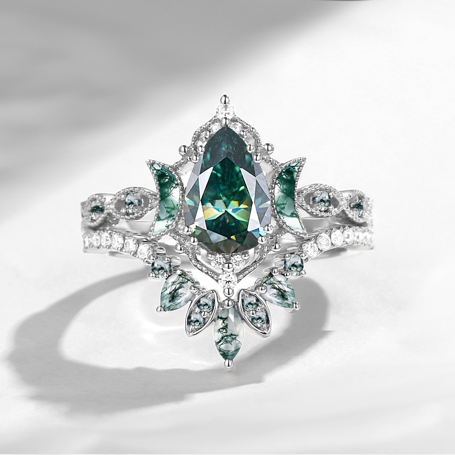 Pear Cut Teal Moissanite Engagement Ring Infinity Ring Vintage Style Cluster Moon Wedding Ring Set 2pcs