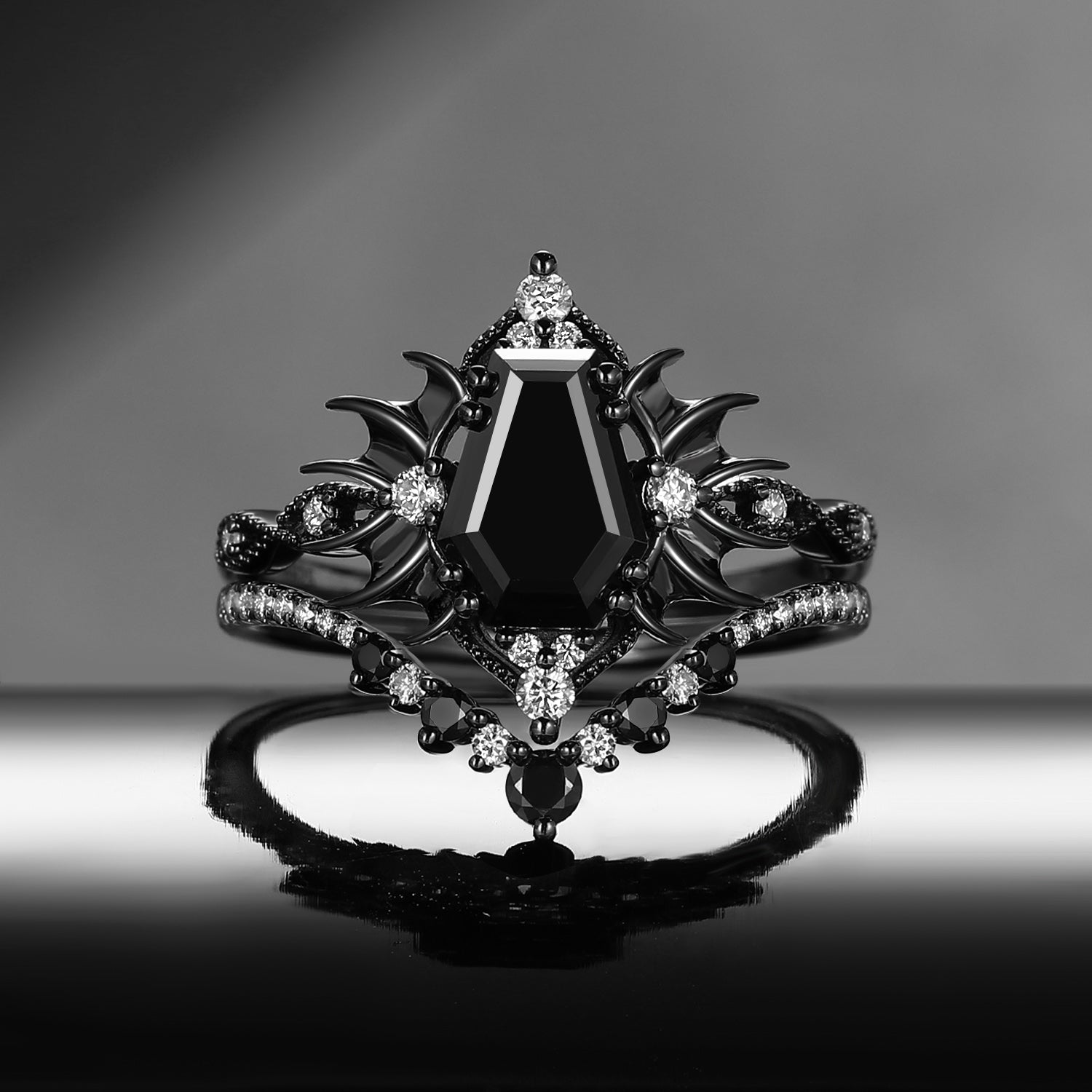 Gothic Inspired Coffin Black Moissanite Black Gold Engagement Ring Set 2pcs - Angel in Disguise
