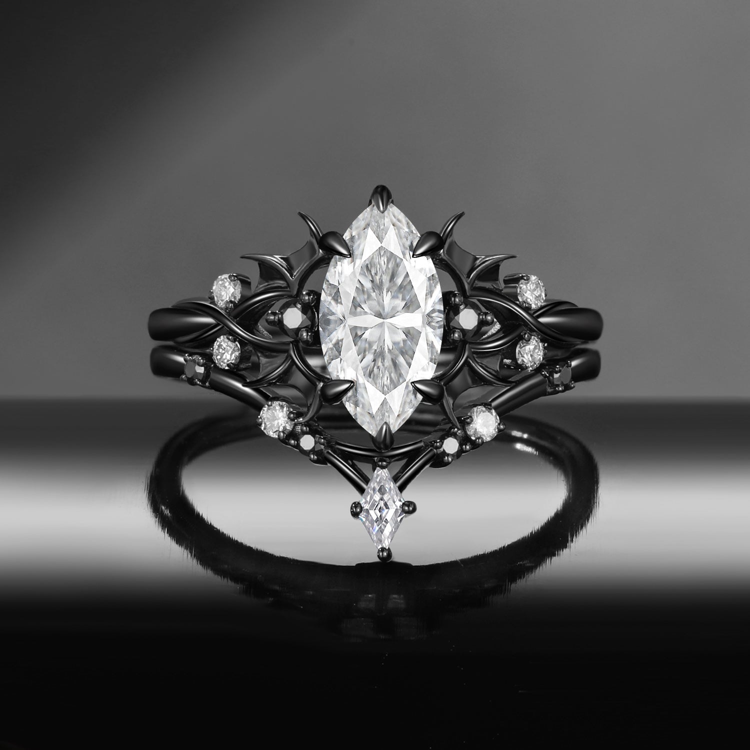 Gothic Inspired Marquise Moissanite Black Gold Infinity Engagement Ring Set 2pcs - Night Court