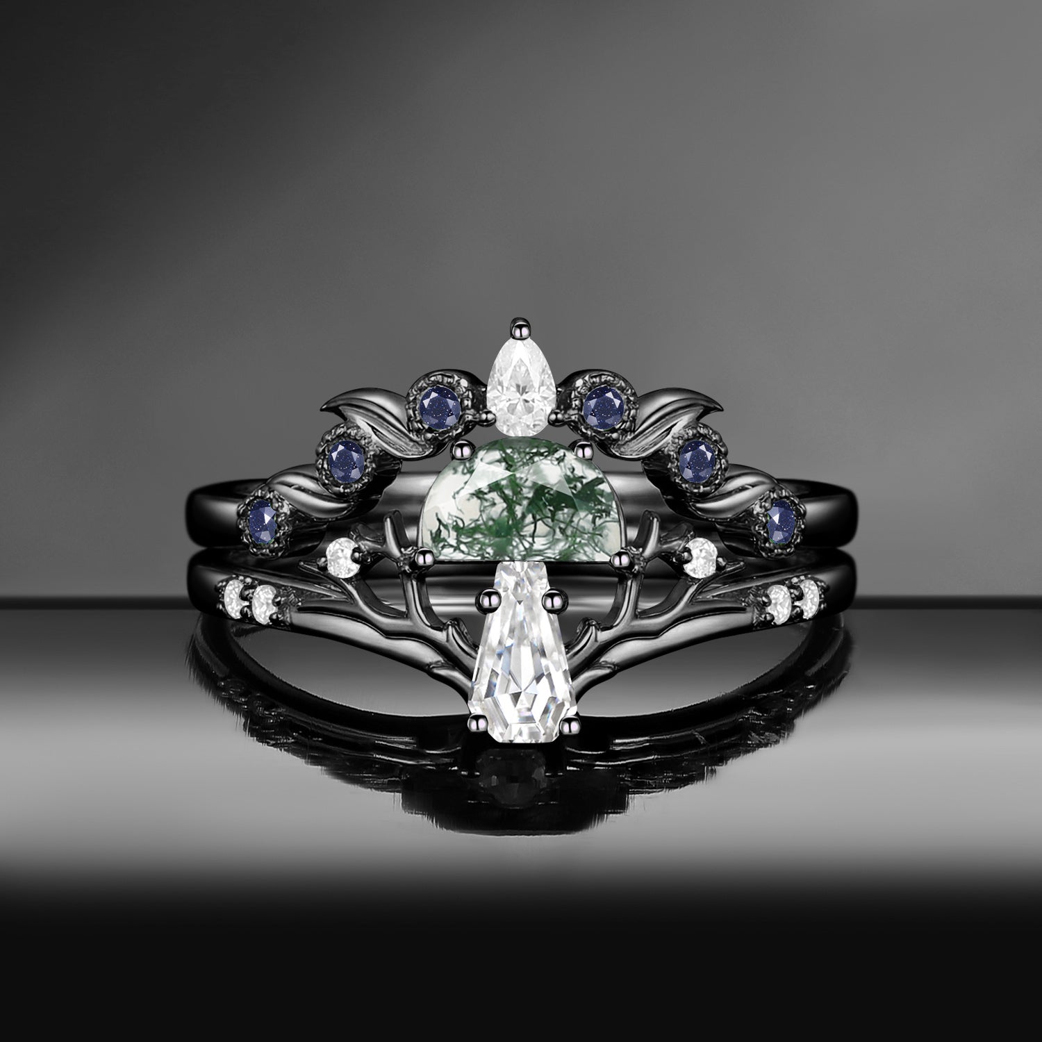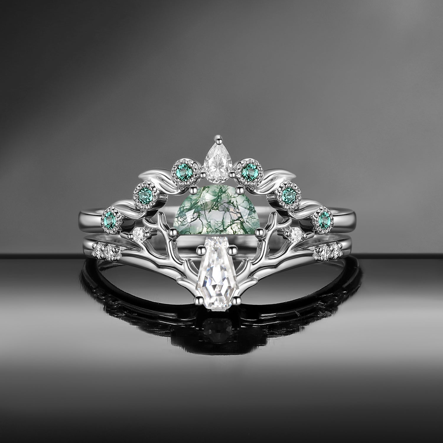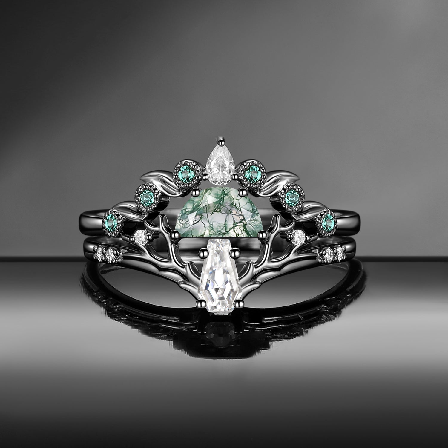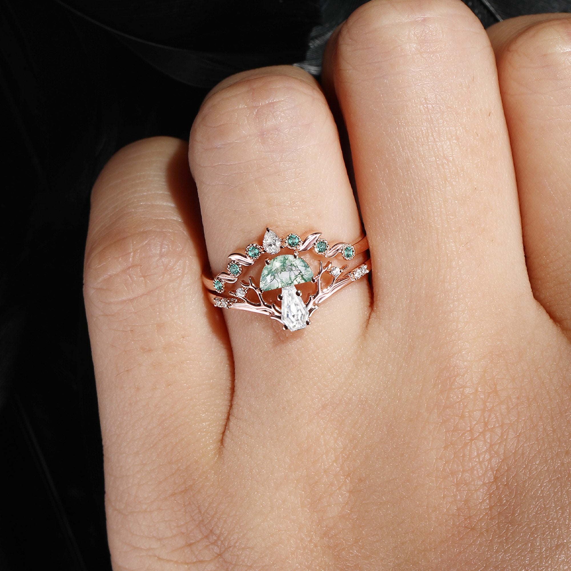 Half Moon Moss Agate + Coffin Cut Moissanite 'Tree of Life' Mushroom Engagement Ring Set 2pcs