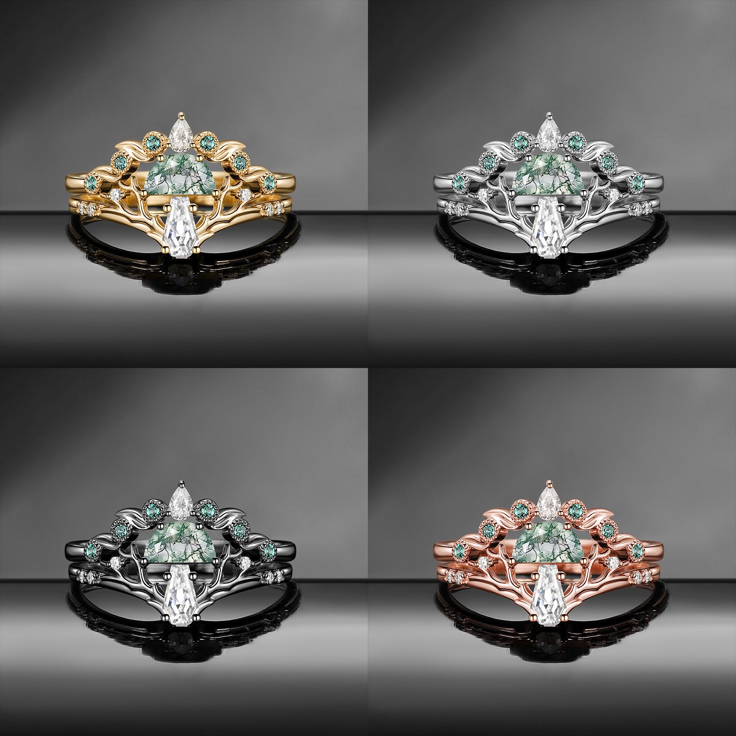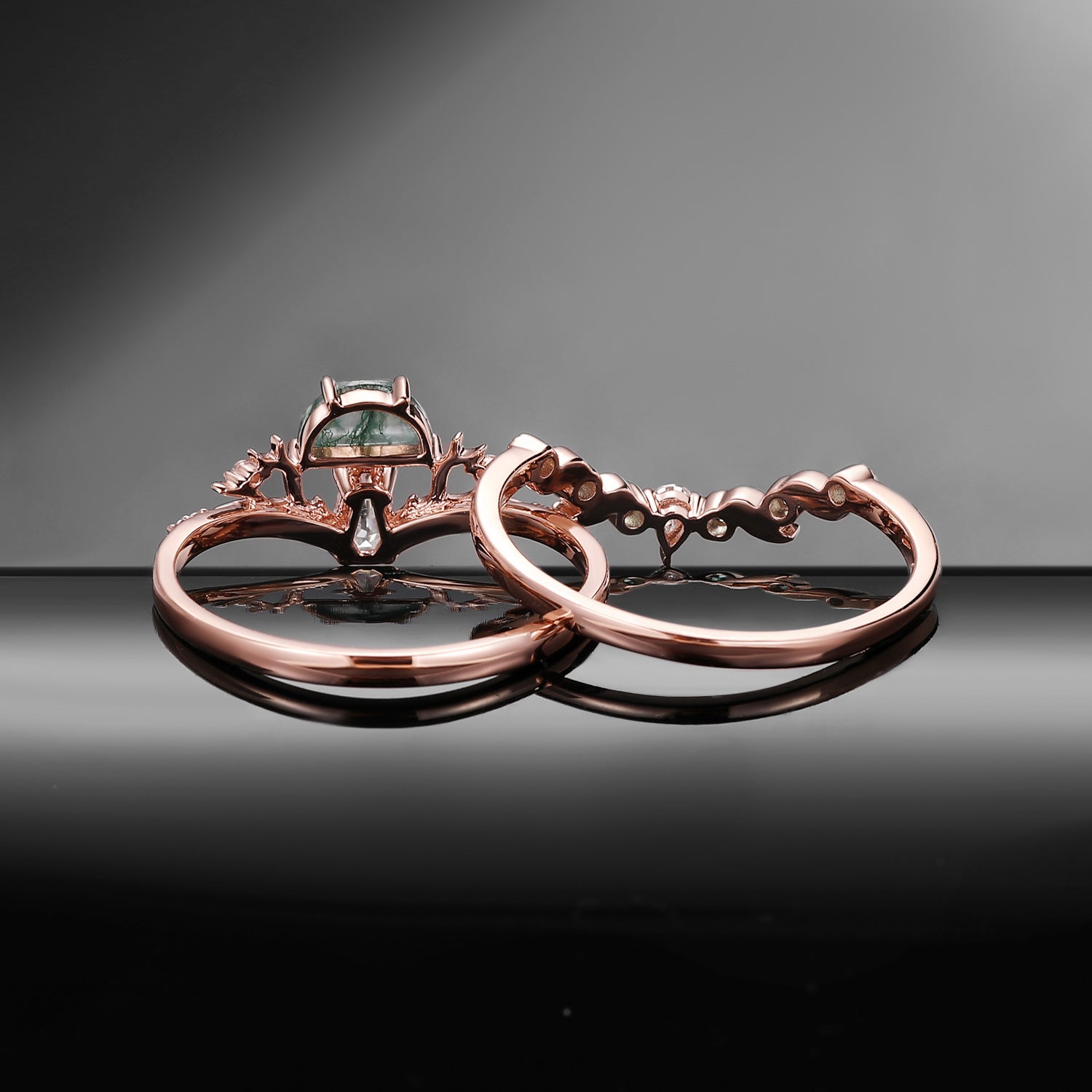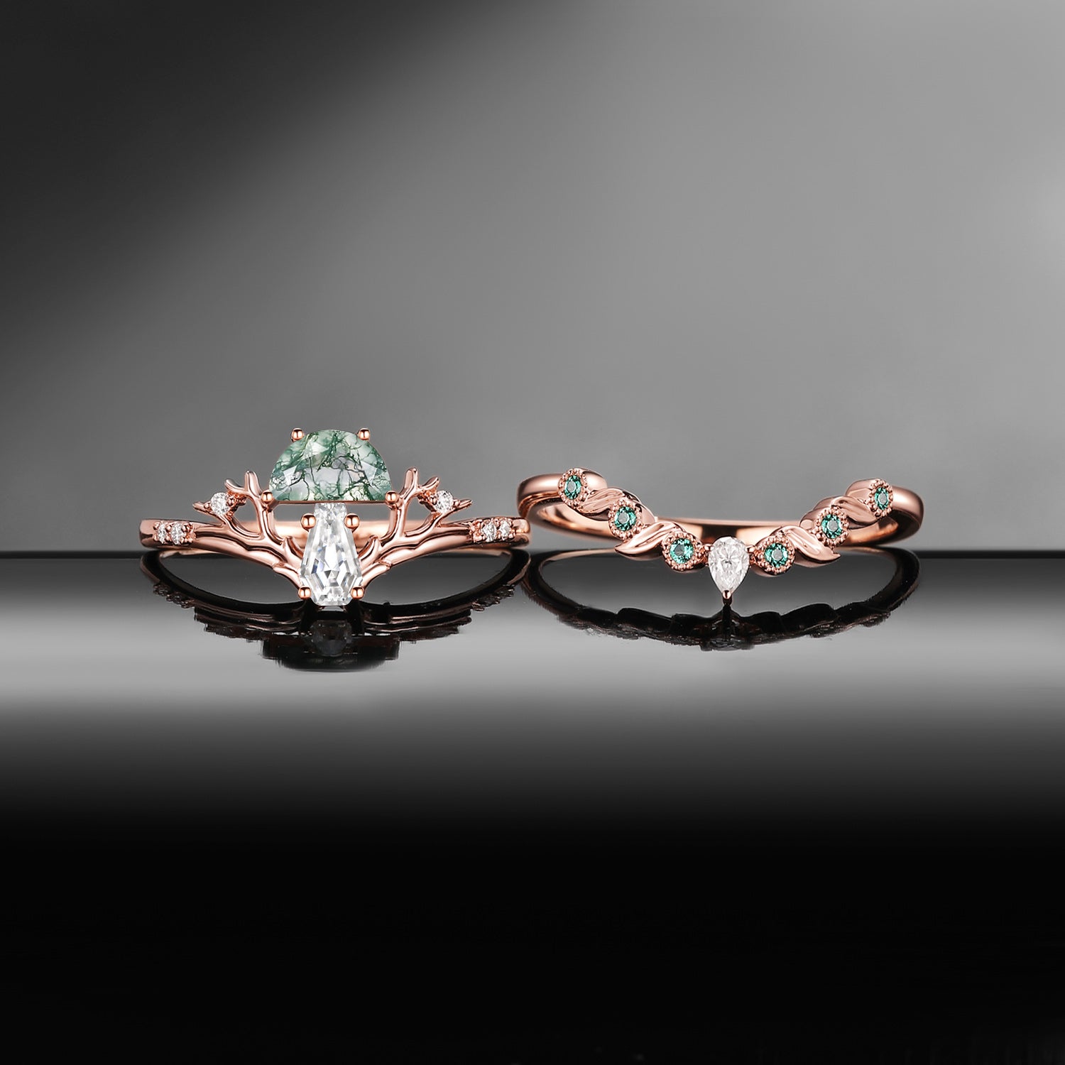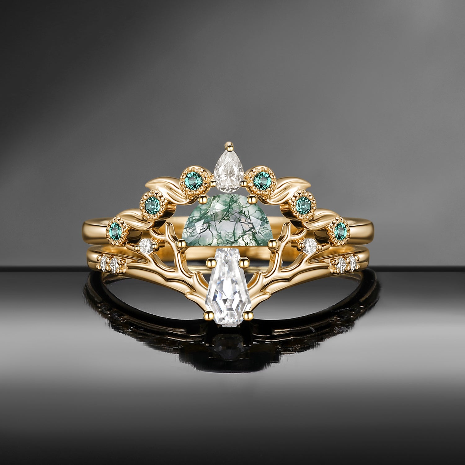 Half Moon Moss Agate + Coffin Cut Moissanite 'Tree of Life' Mushroom Engagement Ring Set 2pcs