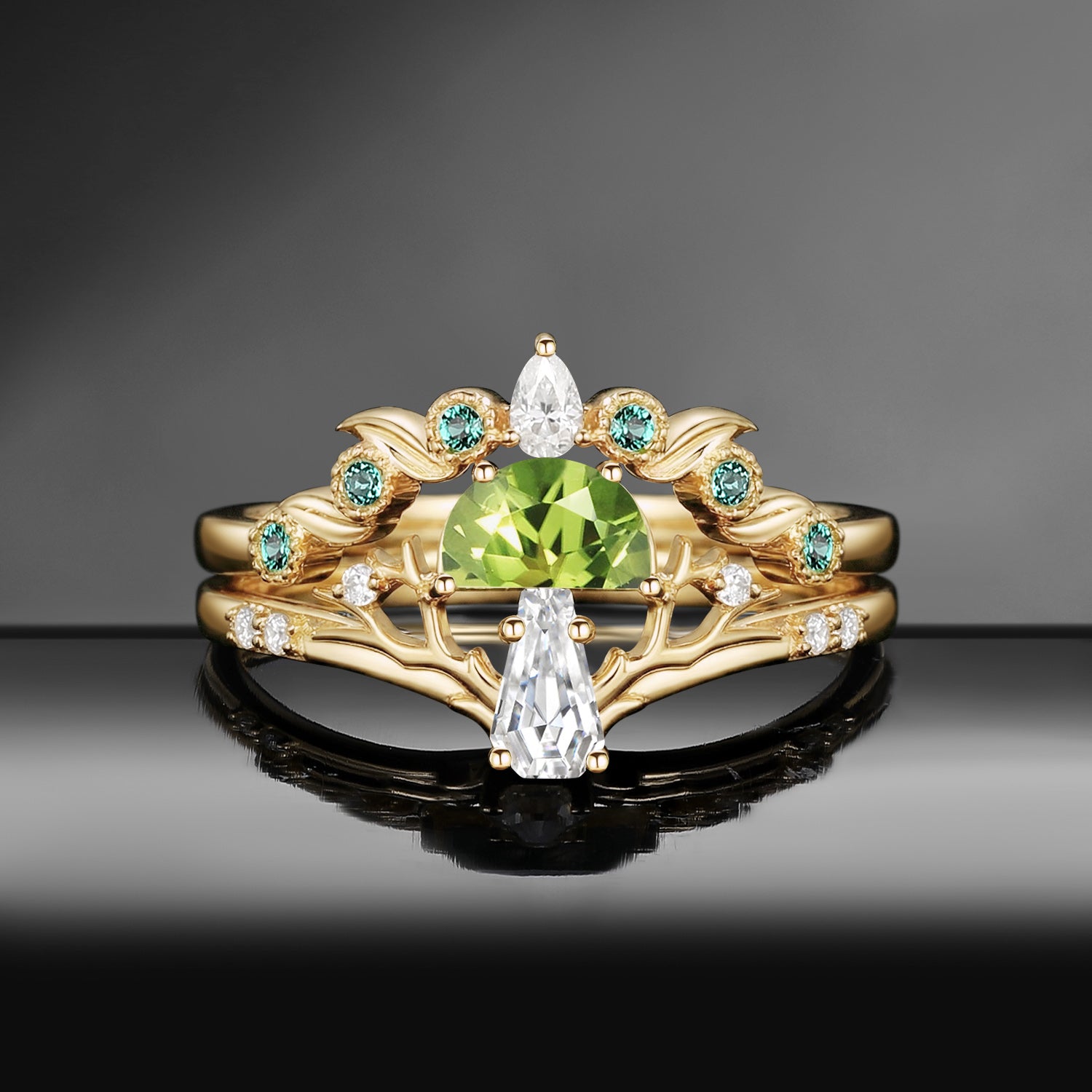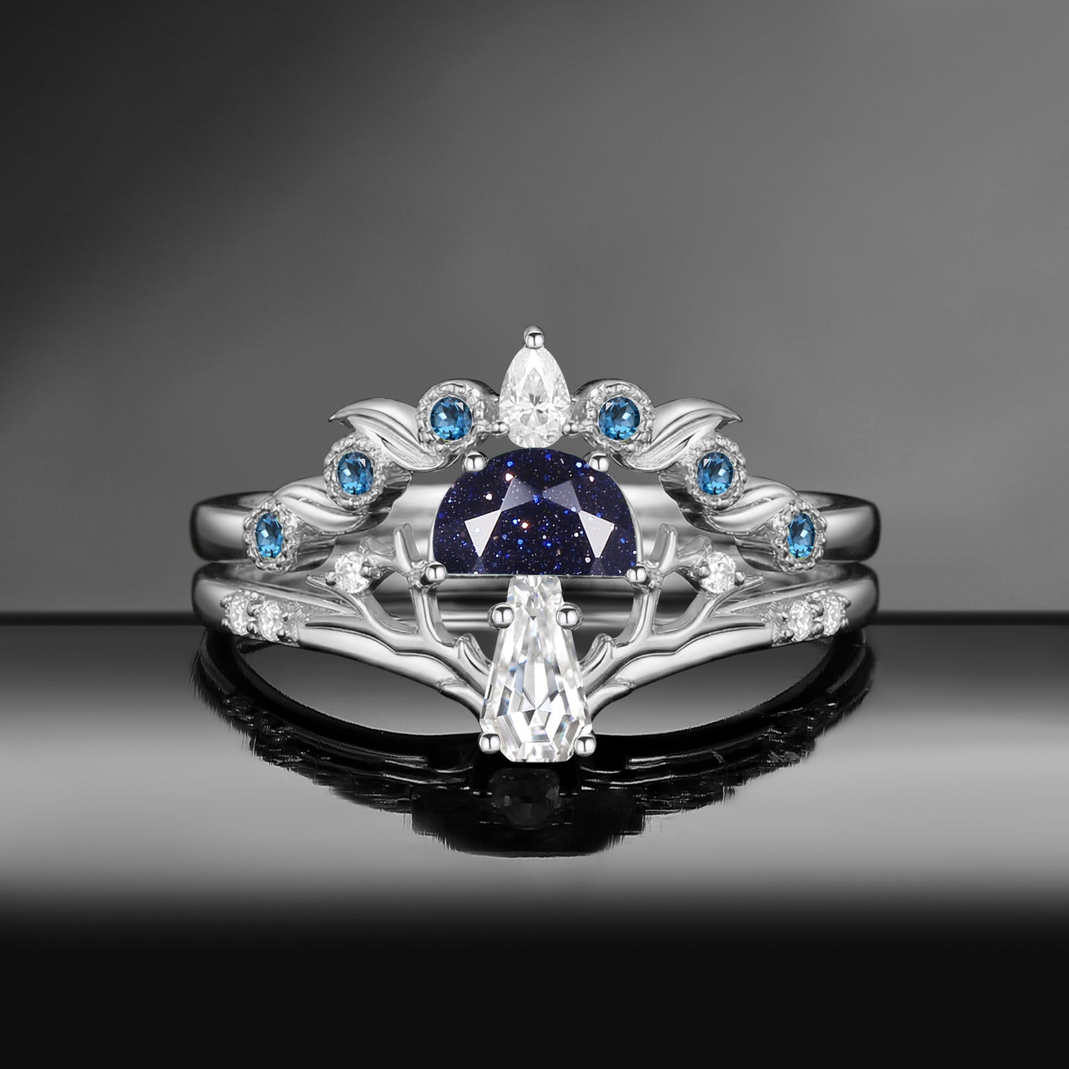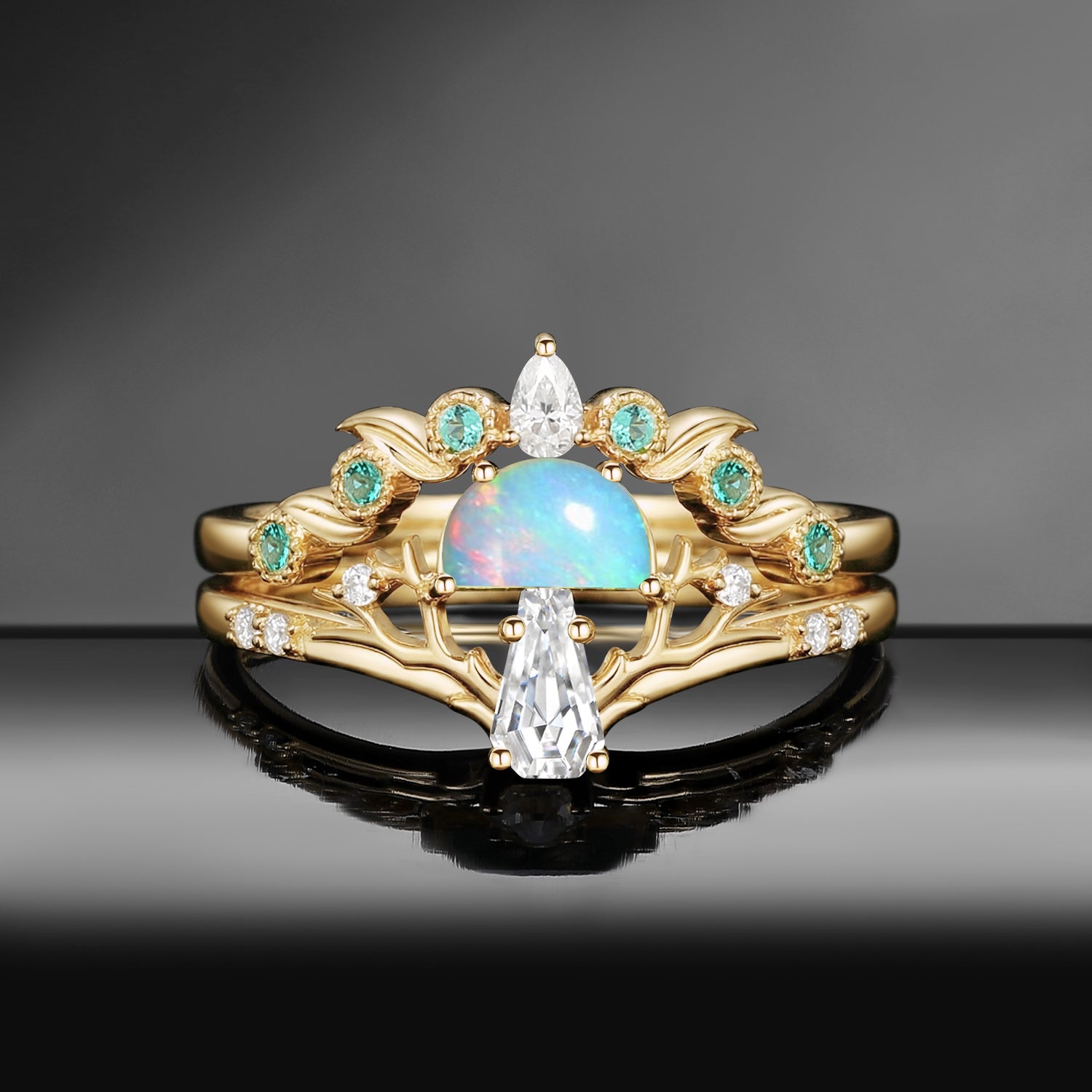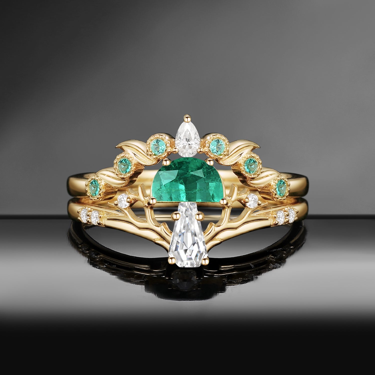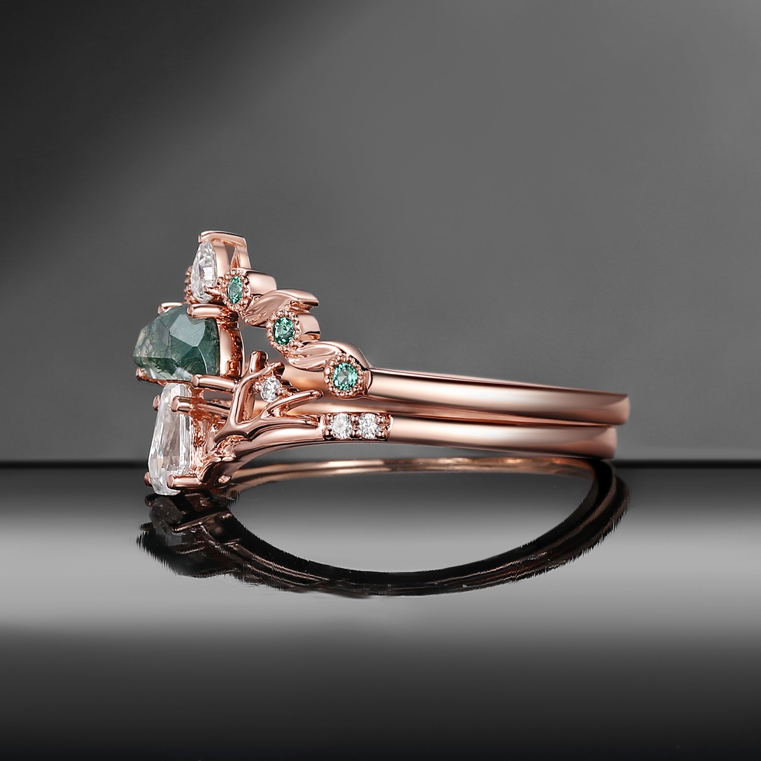 Half Moon Moss Agate + Coffin Cut Moissanite 'Tree of Life' Mushroom Engagement Ring Set 2pcs