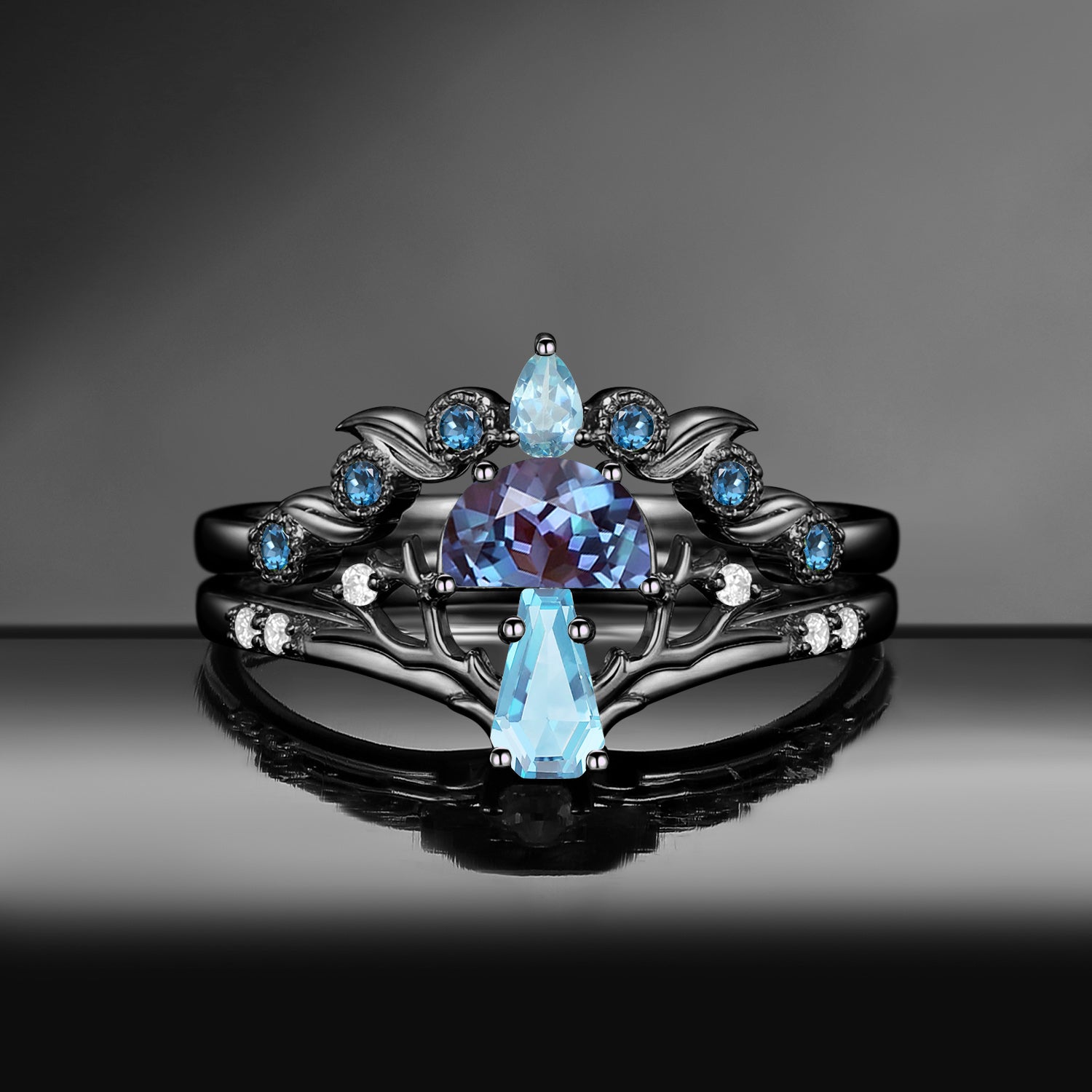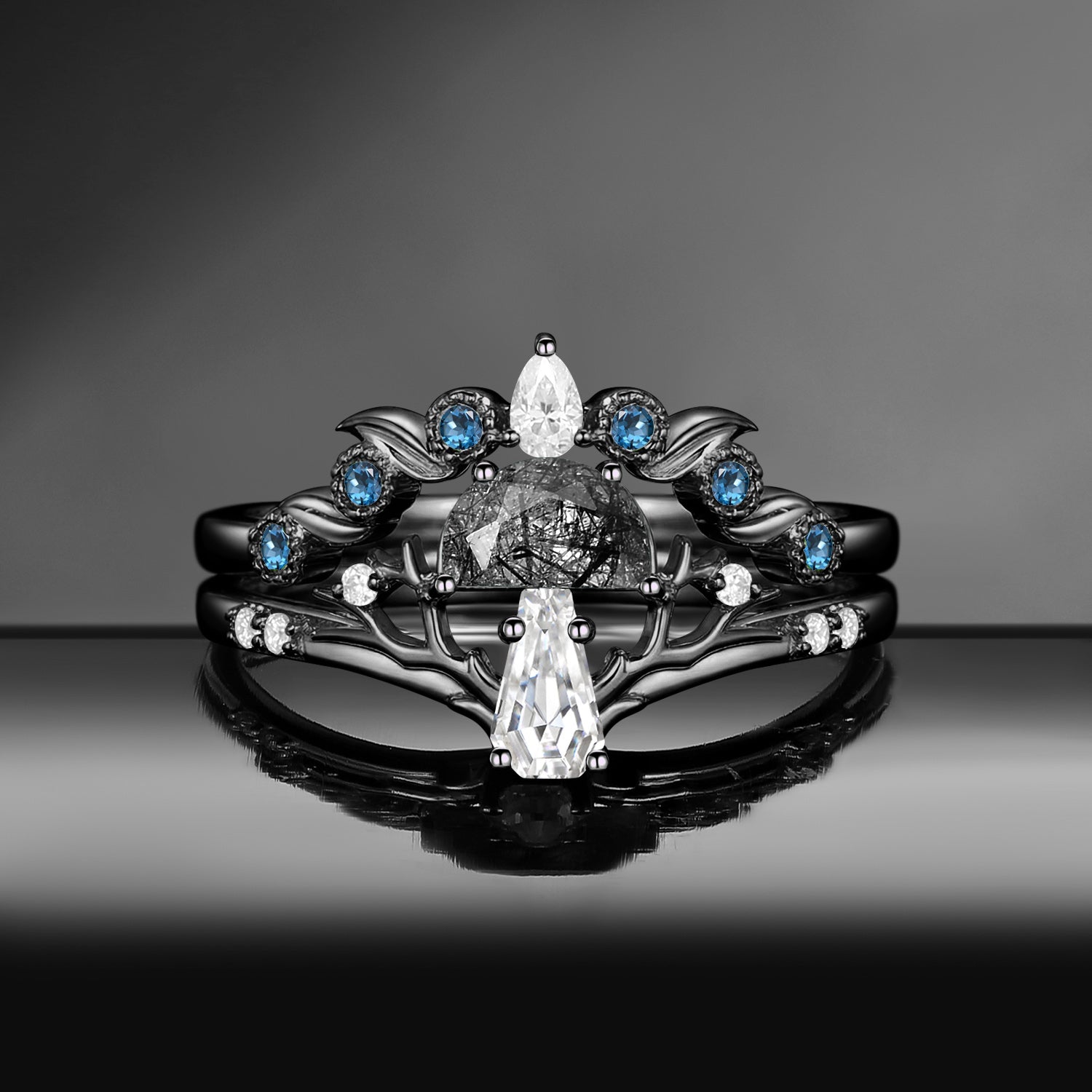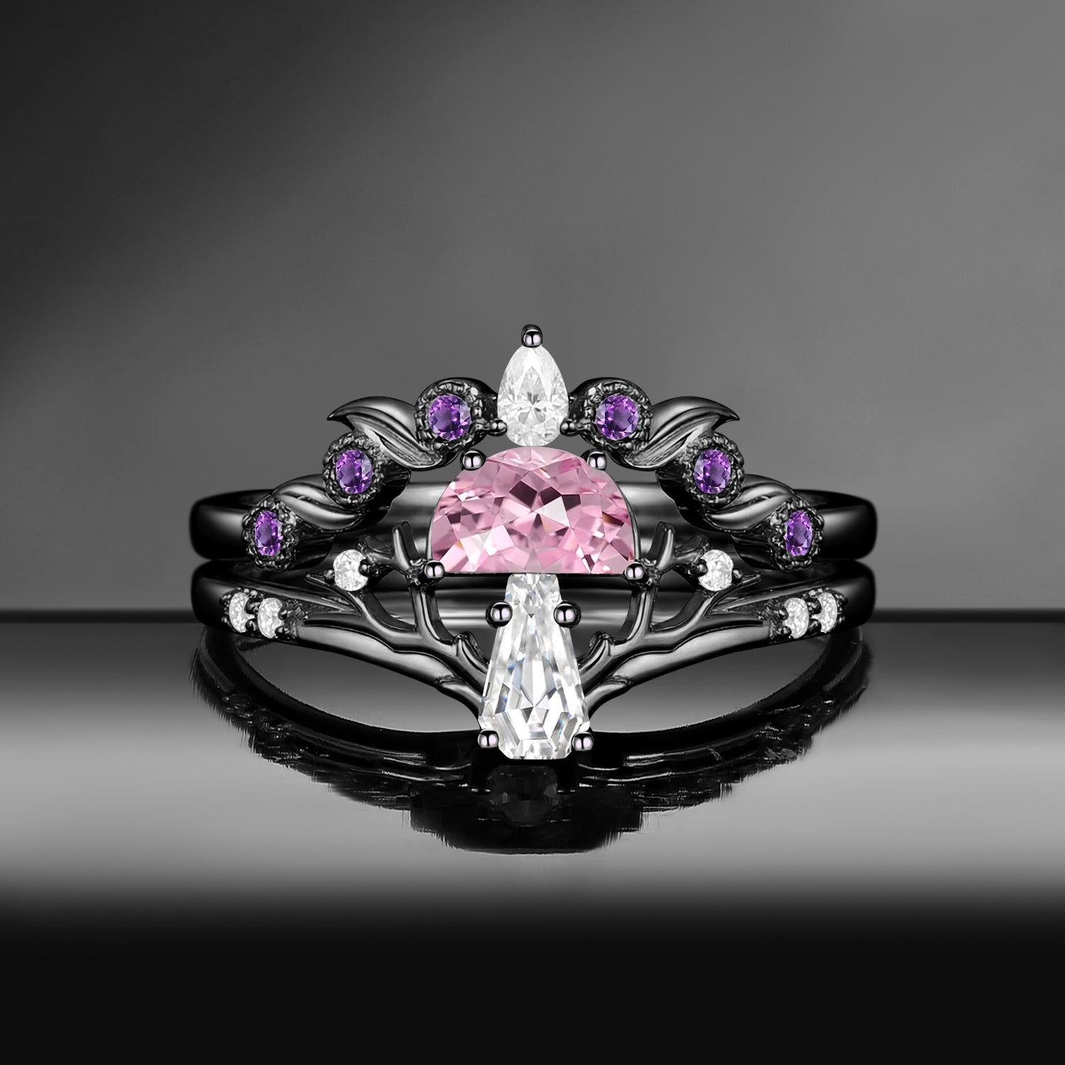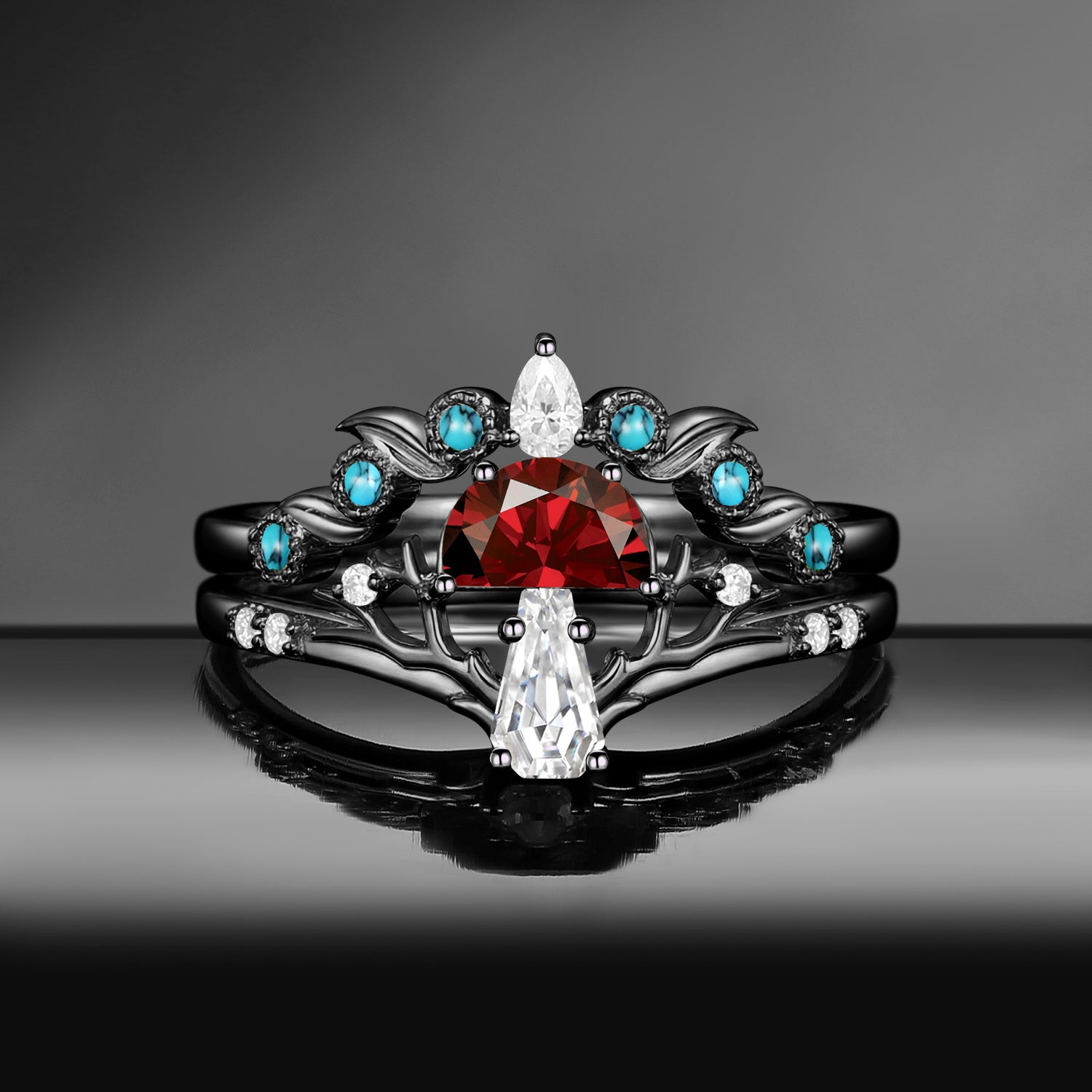 Half Moon Moss Agate + Coffin Cut Moissanite 'Tree of Life' Mushroom Engagement Ring Set 2pcs