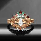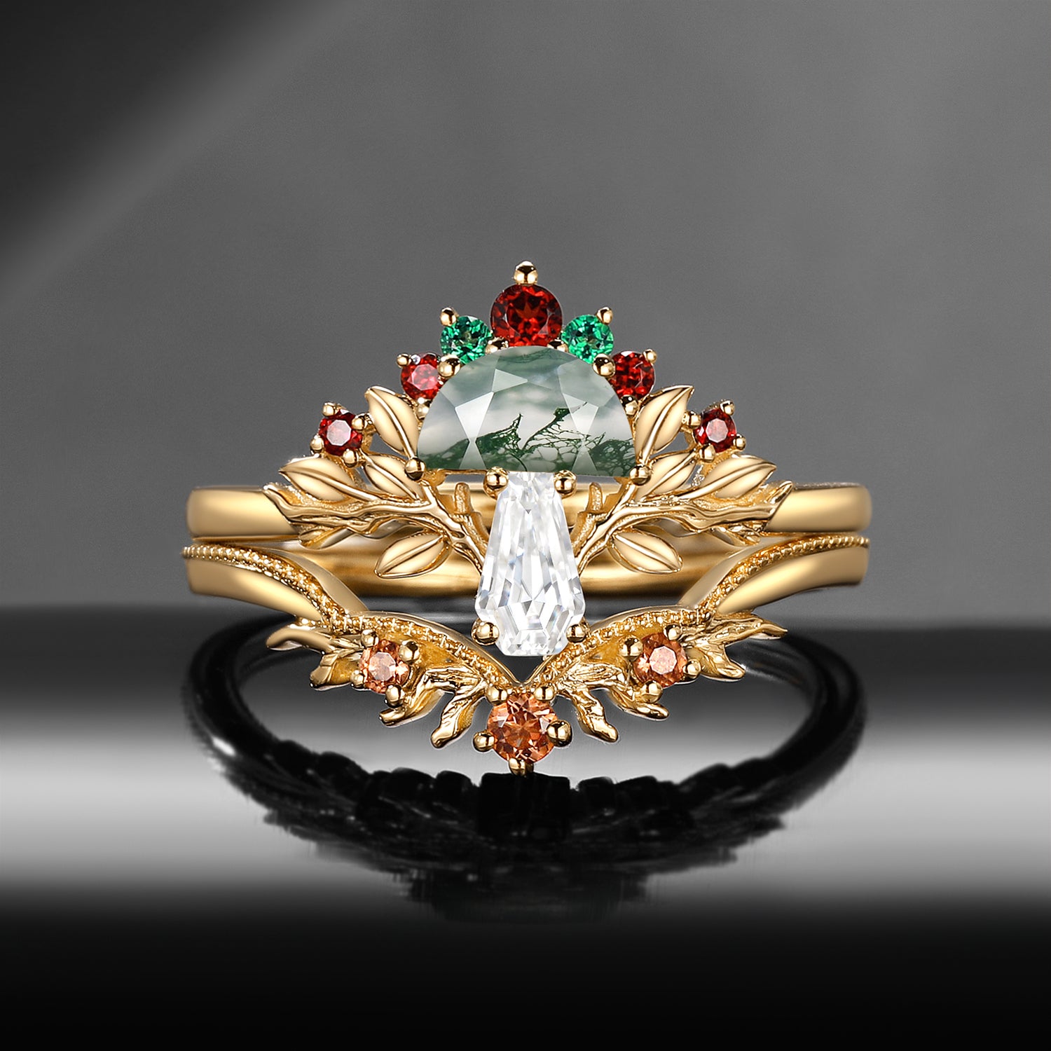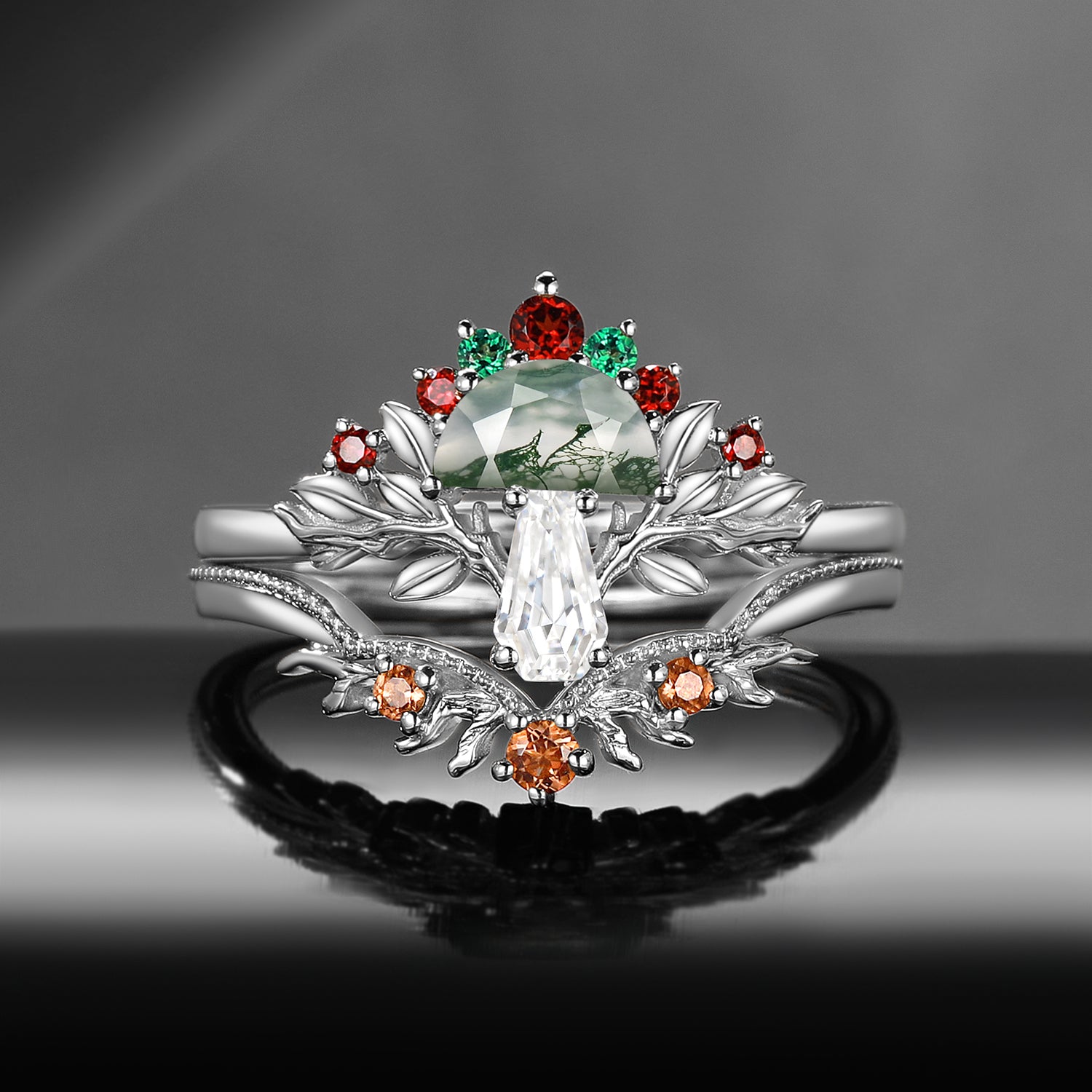 Nature Inspired Gothic Tree Half Moon Moss Agate + Coffin Moissanite Mushroom Engagement Ring Set 2pcs - 'Tree of Life' Garden of Eden