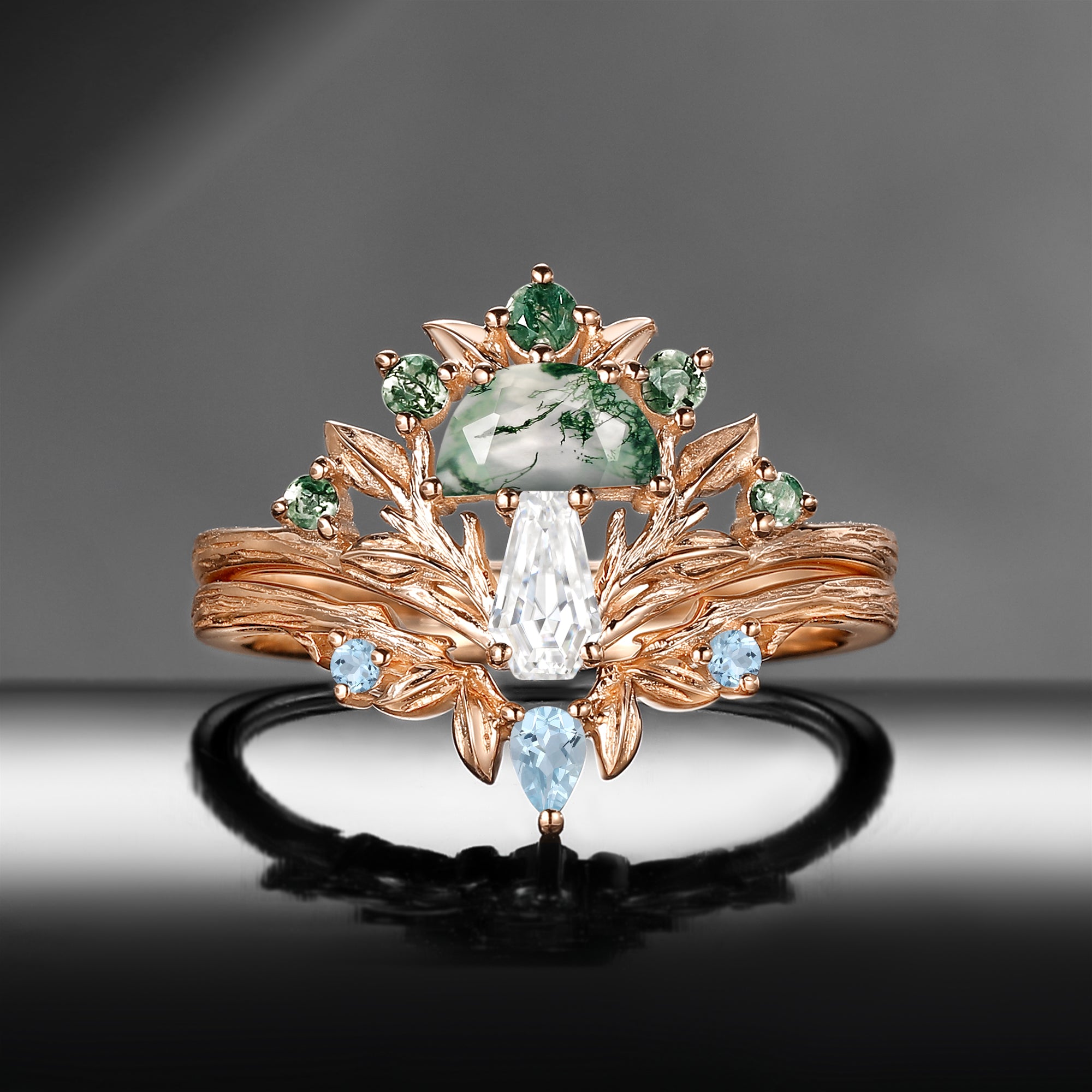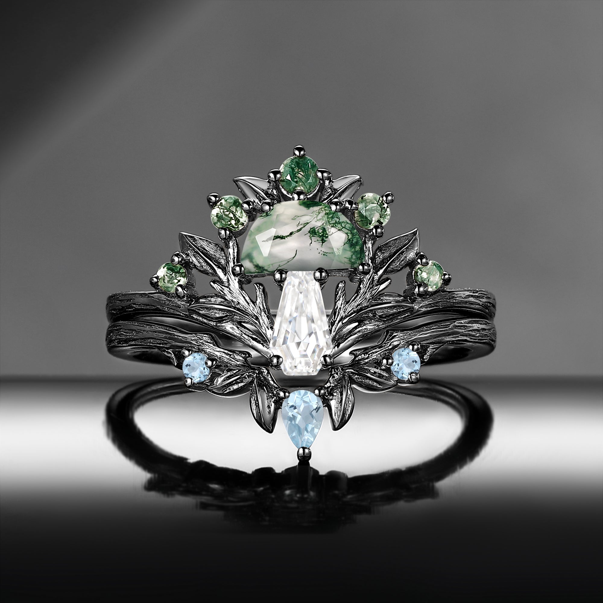 Unique Gothic Nature Half Moon Moss Agate & Coffin Moissanite Mushroom Textured Engagement Ring Set 2pcs - 'Tree of Life' Garden of Eden