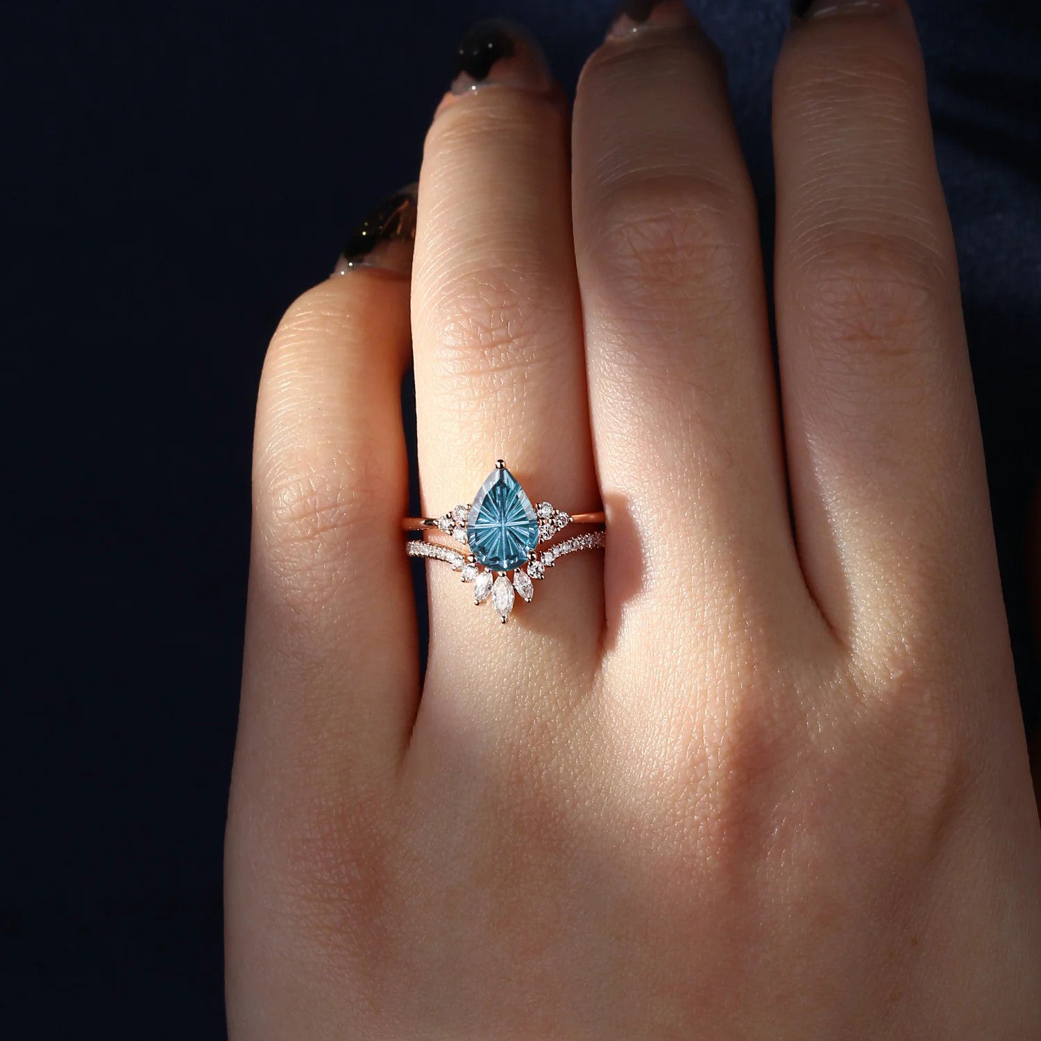 Crescent Moon | Fantasy Cut Pear Garnet Engagement Ring Set 2pcs - Luna