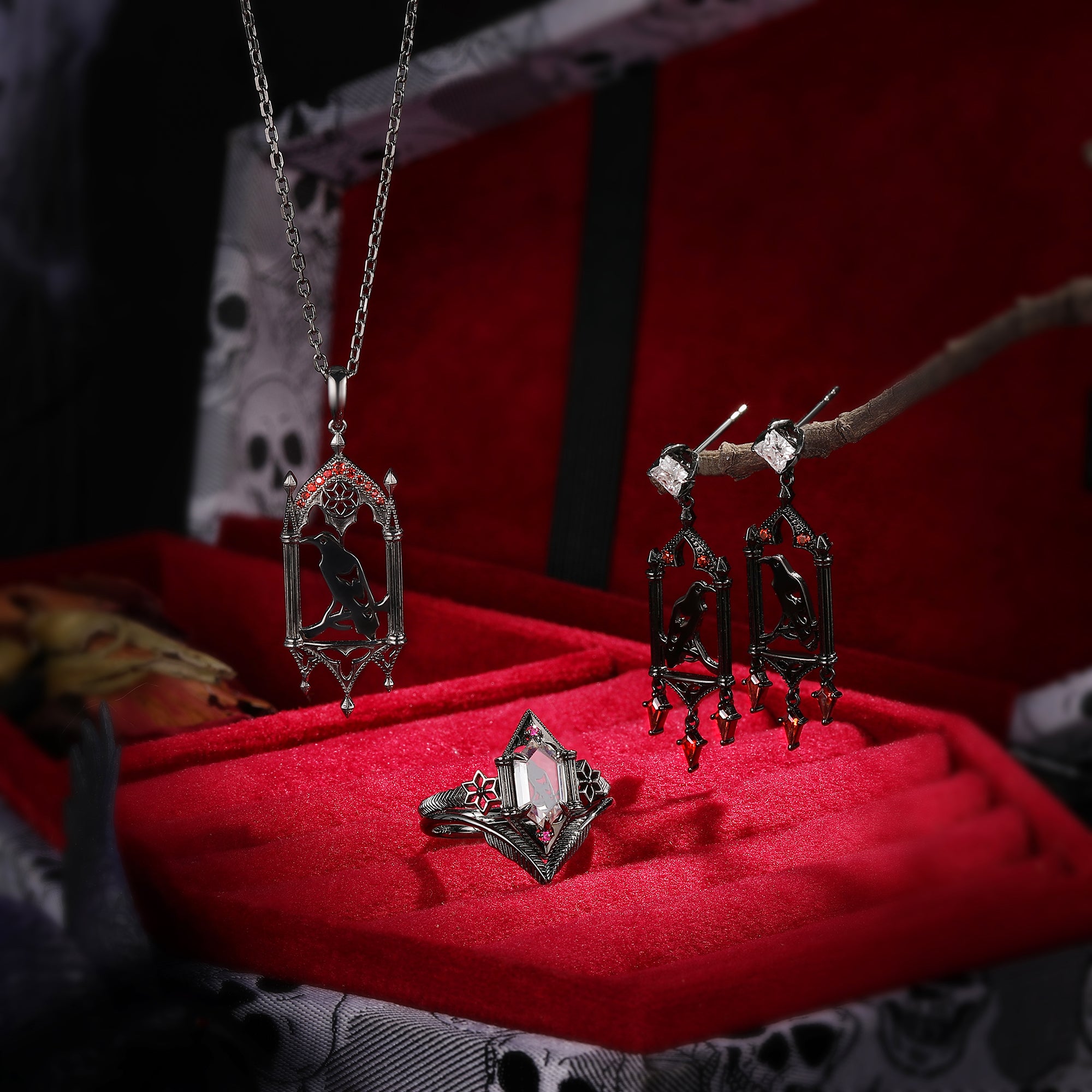 Coffin Cut Pink Lab Diamond Spooky Engagement Ring Set 2pcs - Dainty Bat Ring