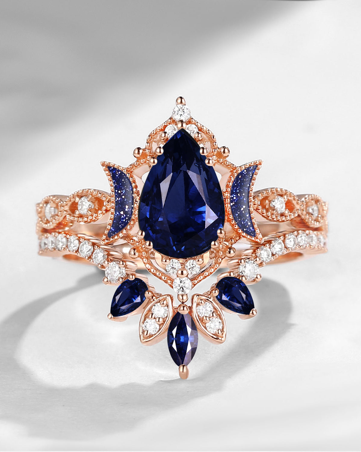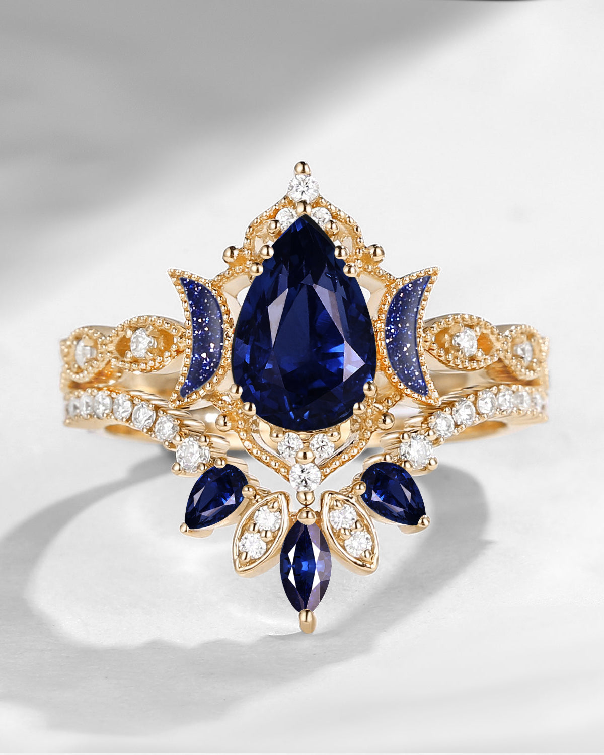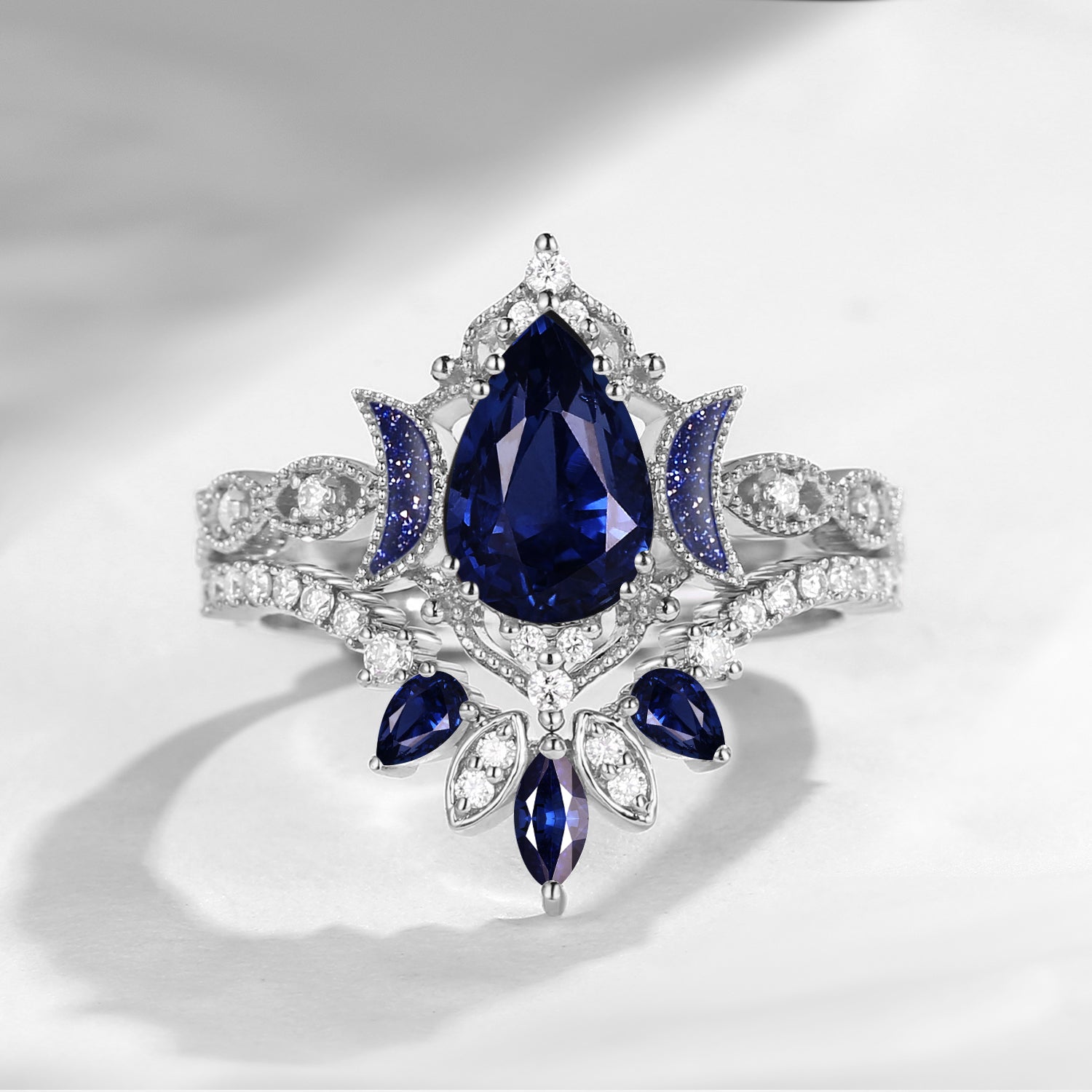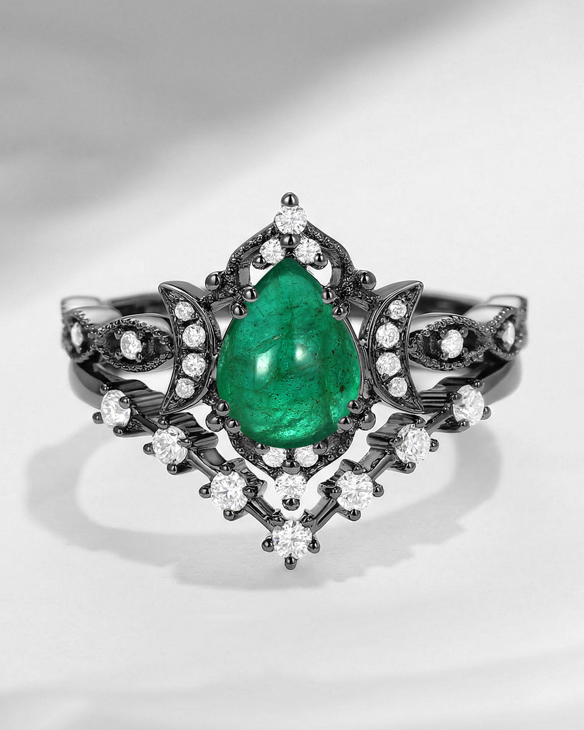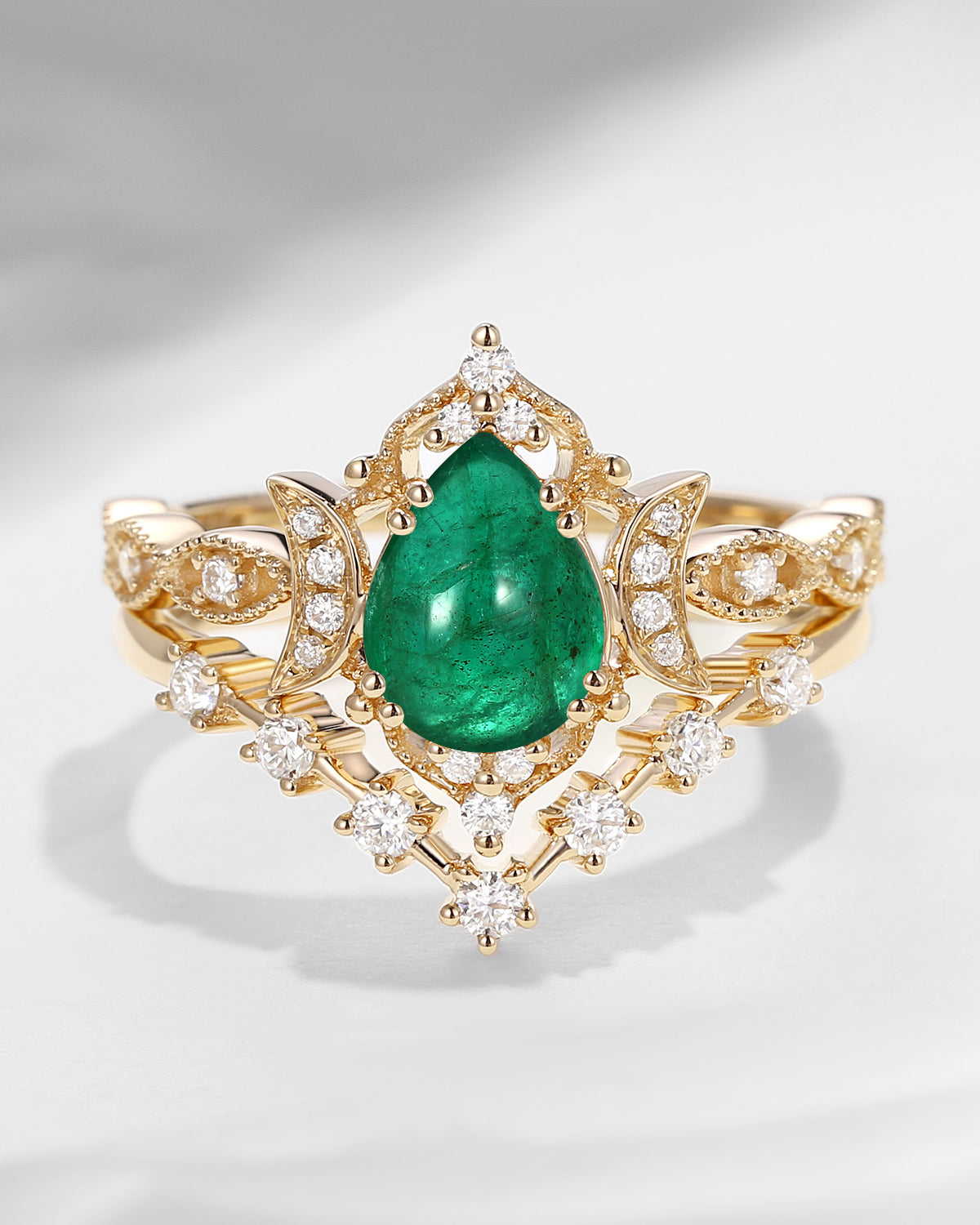 Crescent Moon | Pear Cut Natural Emerald Unique Galaxy Engagement Ring Set 2pcs