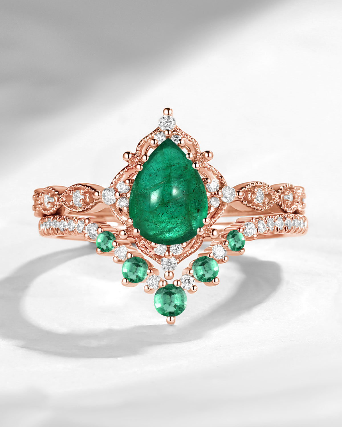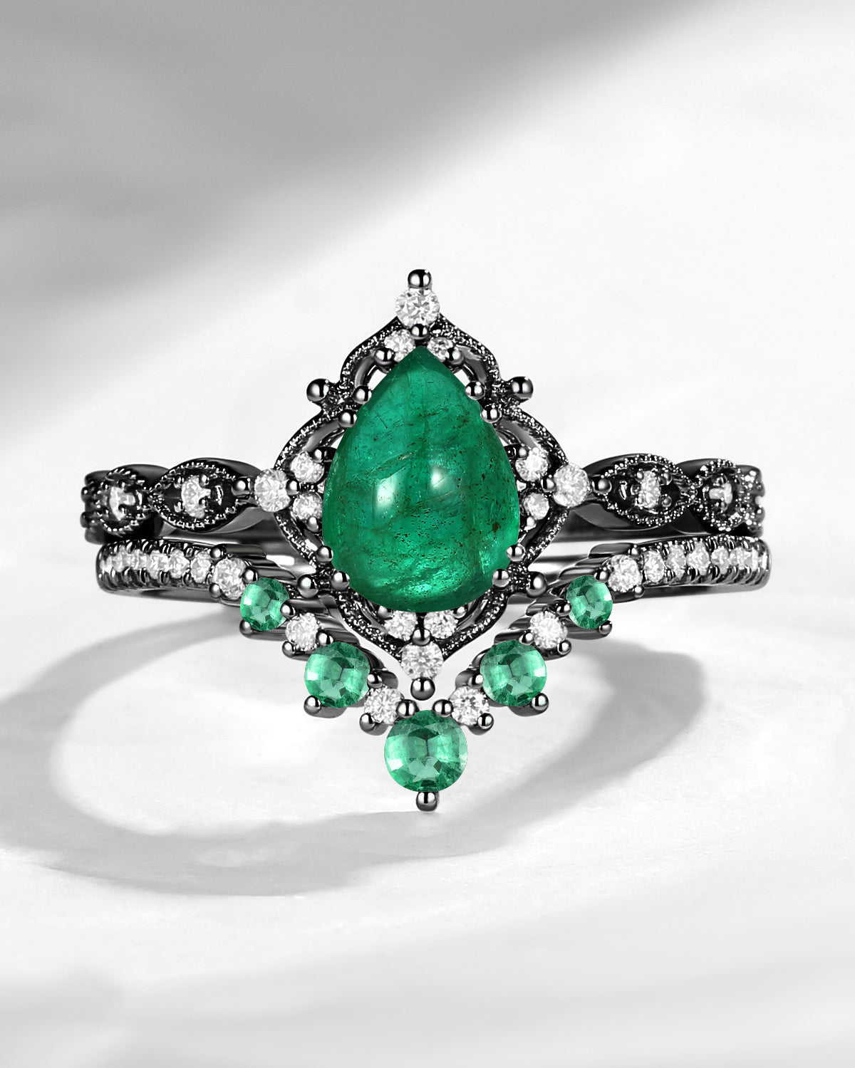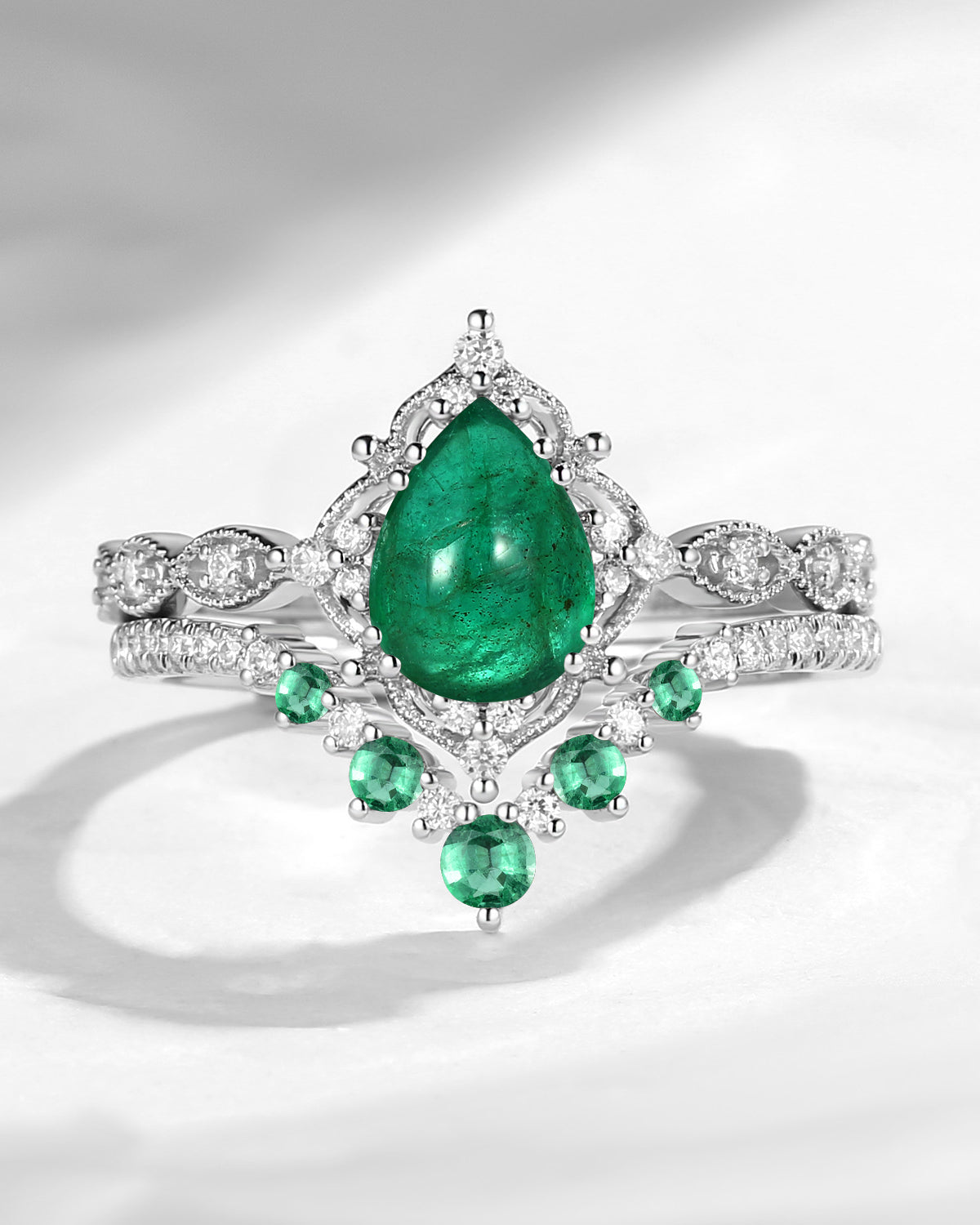 Antique Pear Cut Natural Emerald Engagement Ring 2pcs