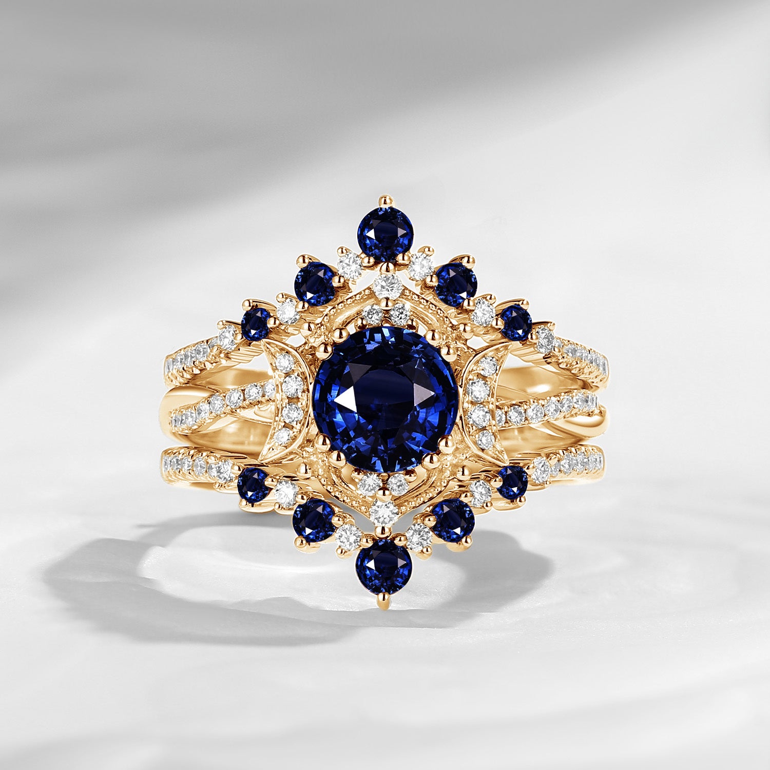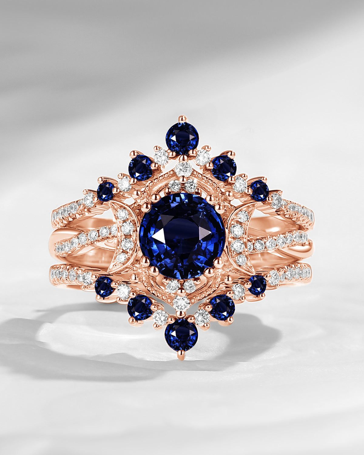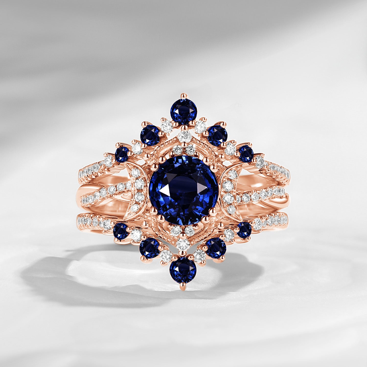 Crescent moon | Unique Infinity Round Natural Sapphire Engagement Ring Set 3pcs