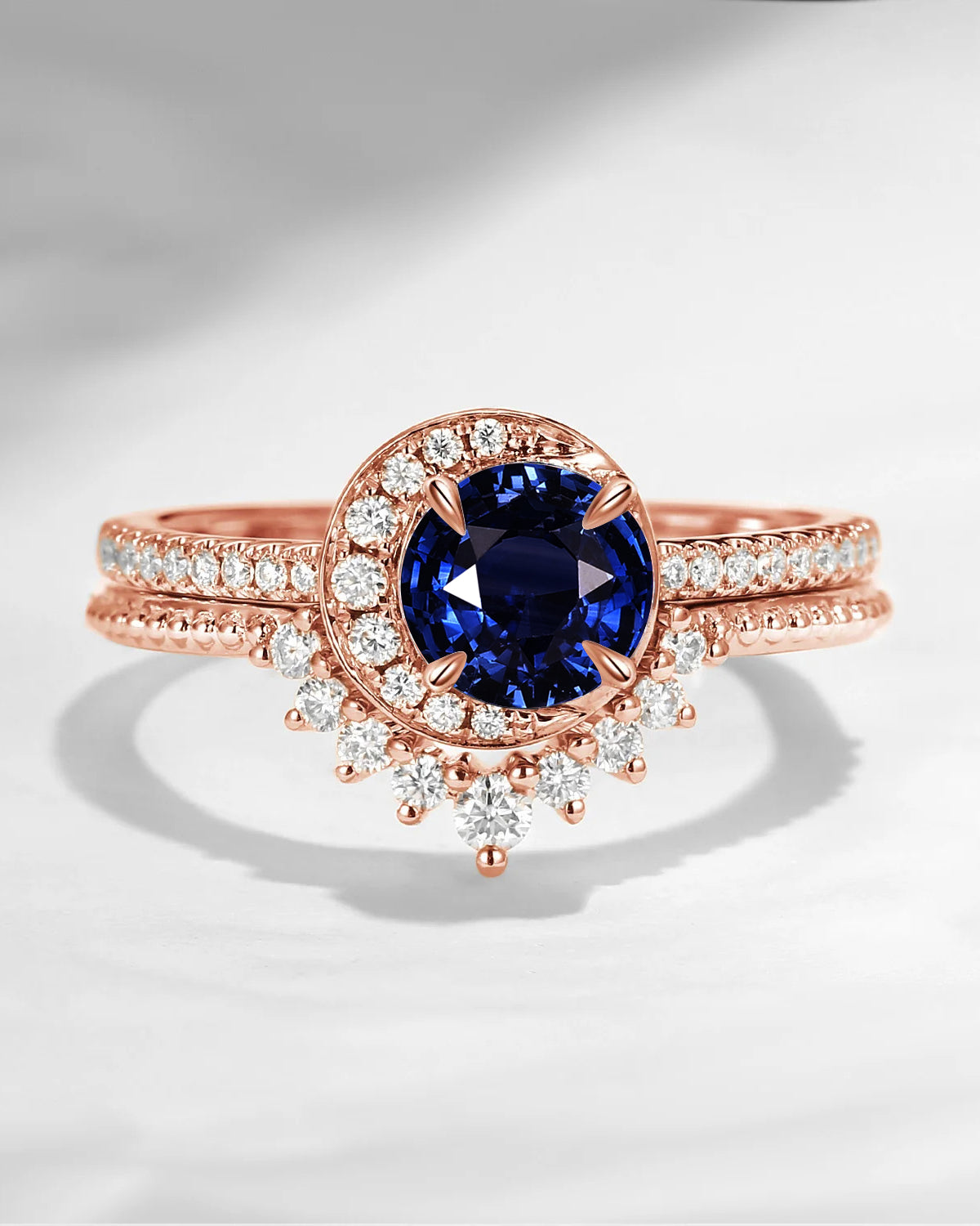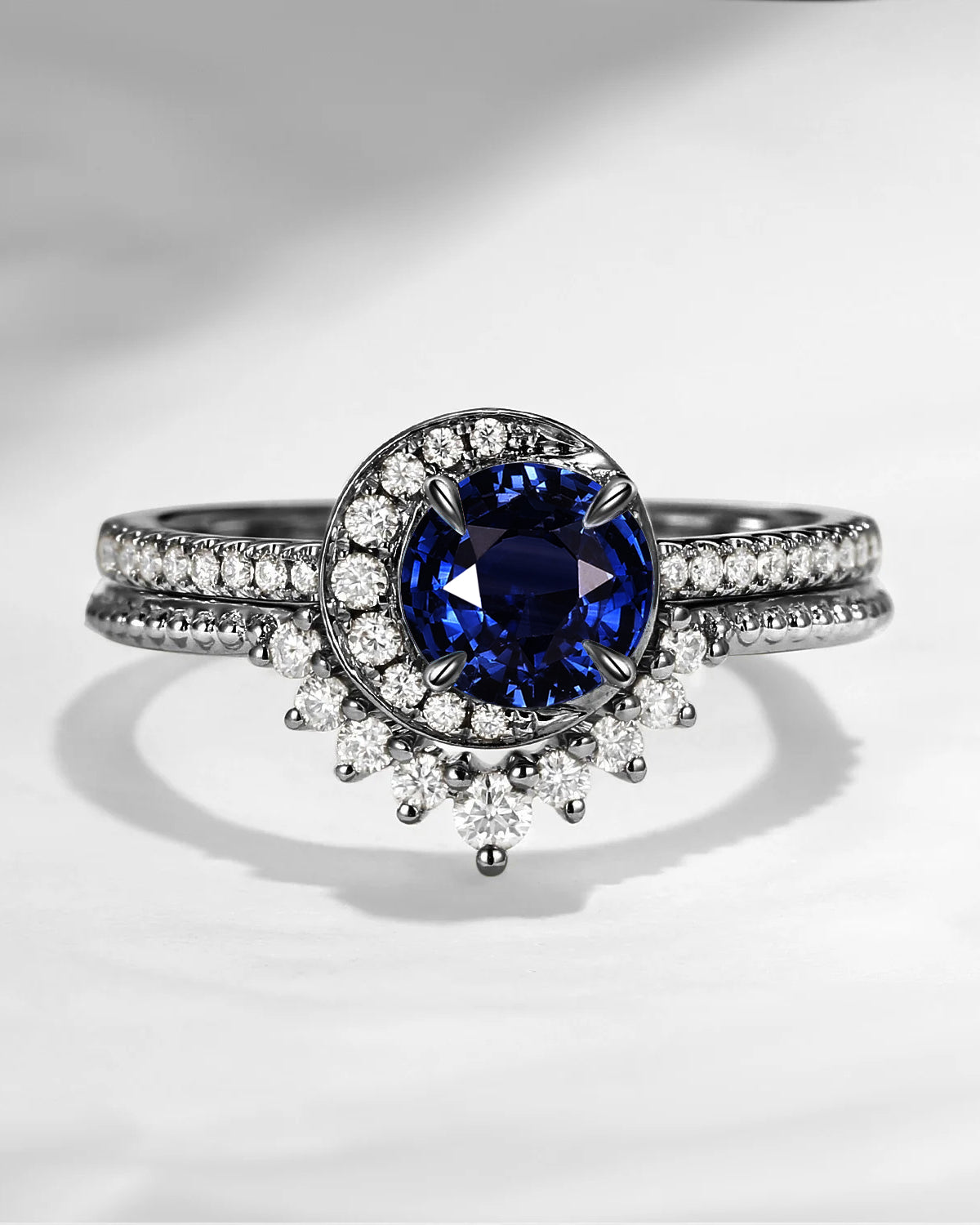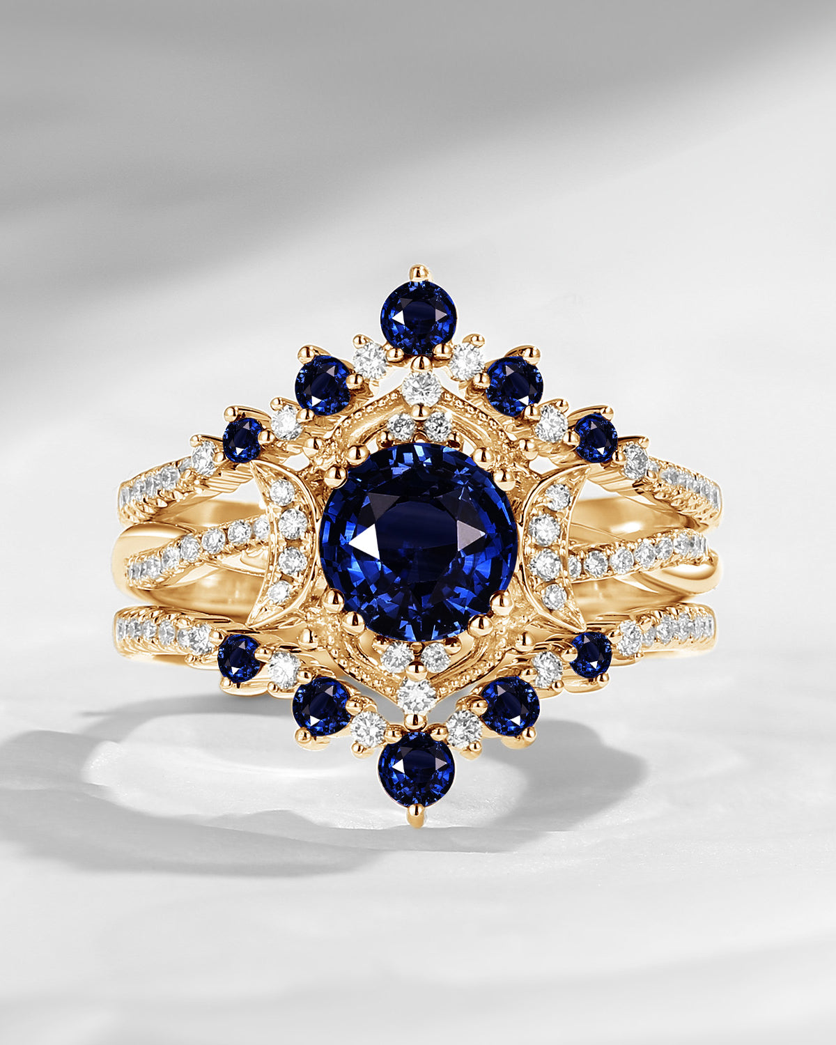 Crescent moon | Unique Infinity Round Natural Sapphire Engagement Ring Set 3pcs