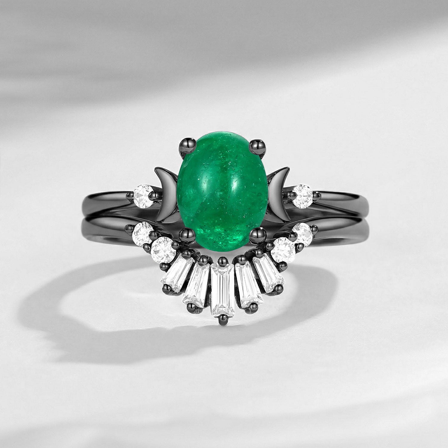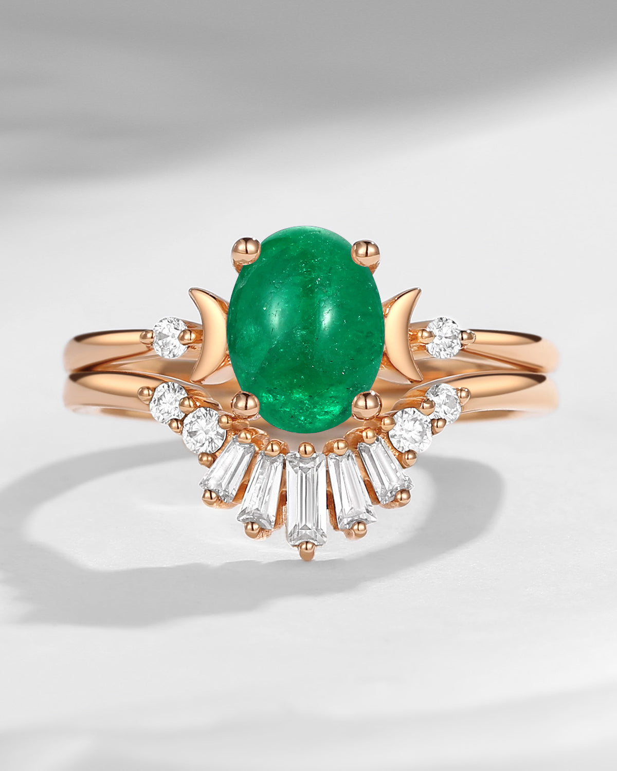 Pure Moon | Fancy Oval Cut Natural Emerald Engagement Ring Set 2pcs