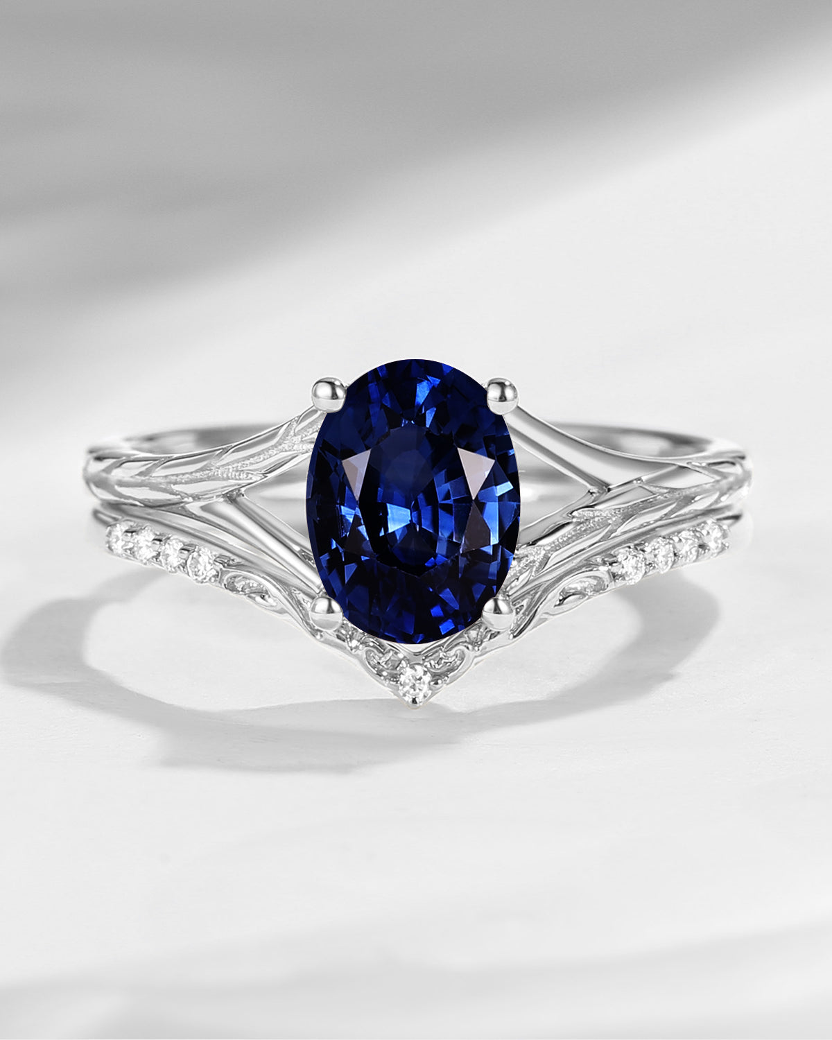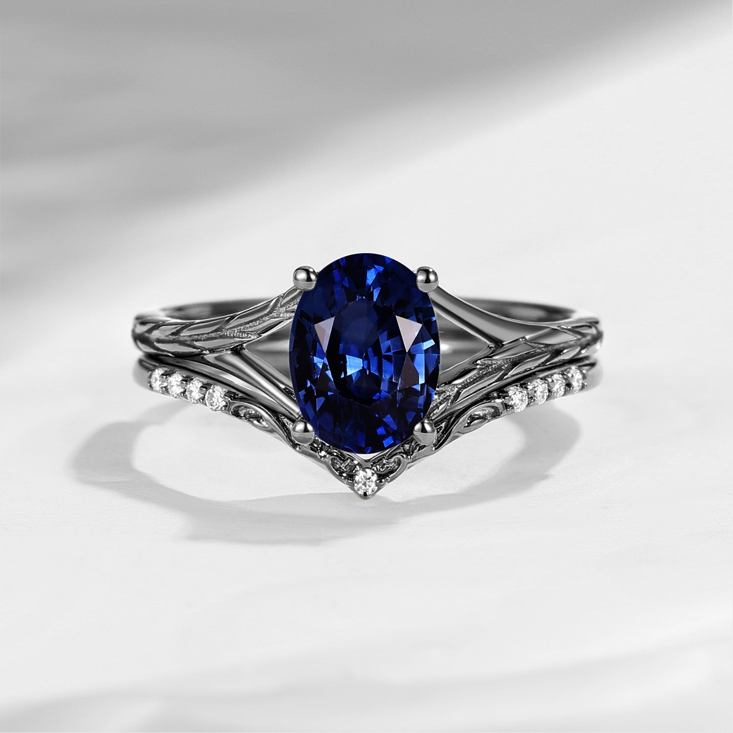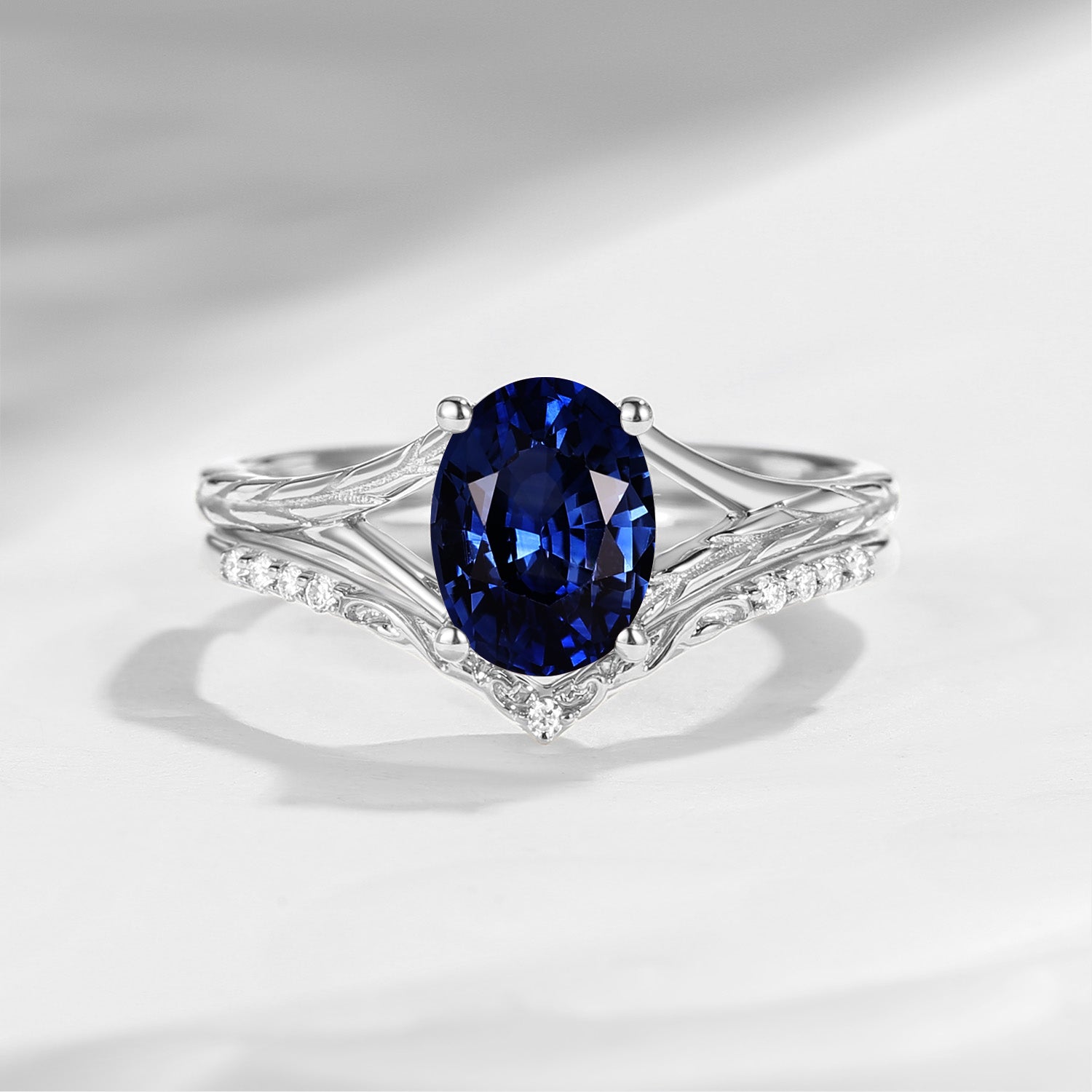 Nature Inspired Oval Cut Natural Sapphire Textured Engagement Ring Set 2pcs