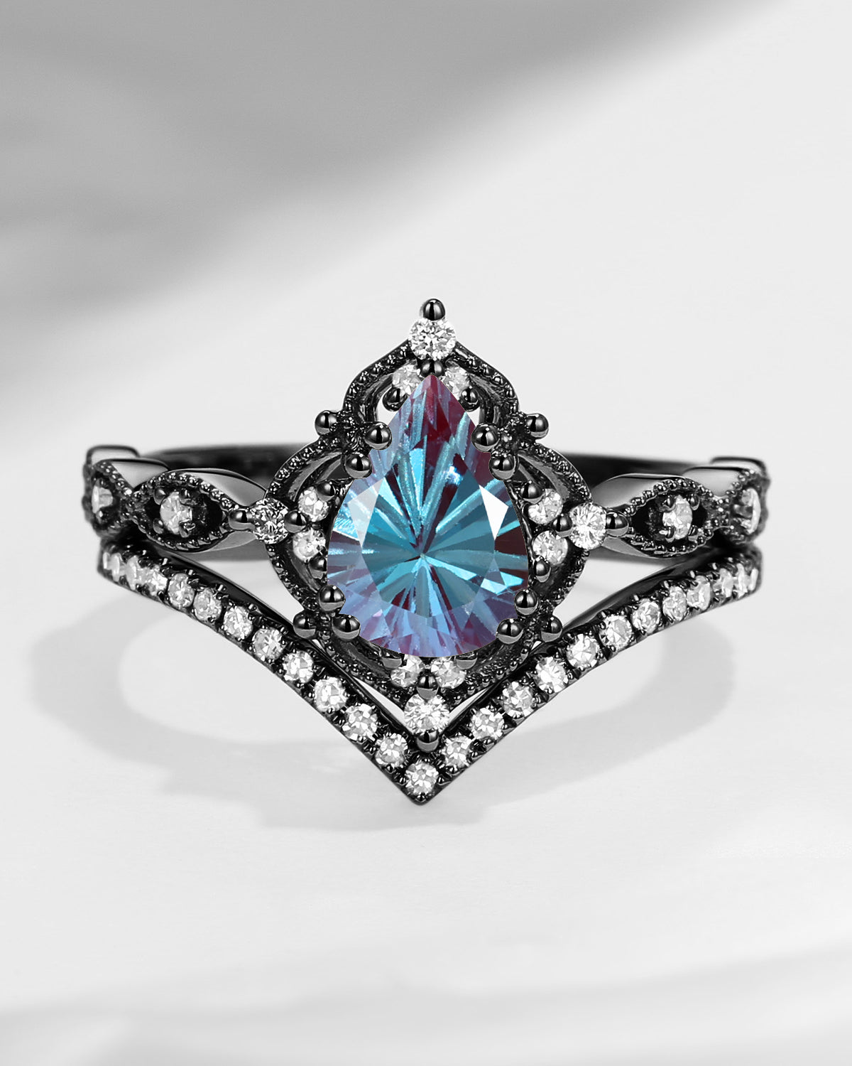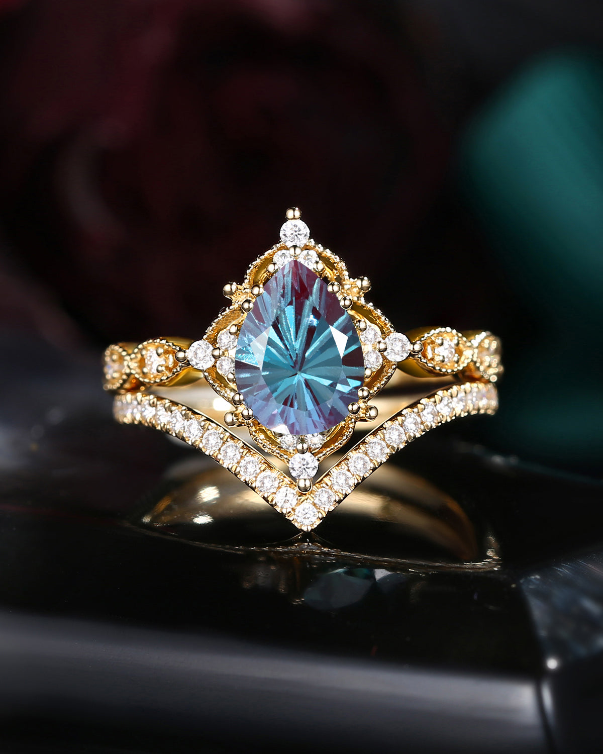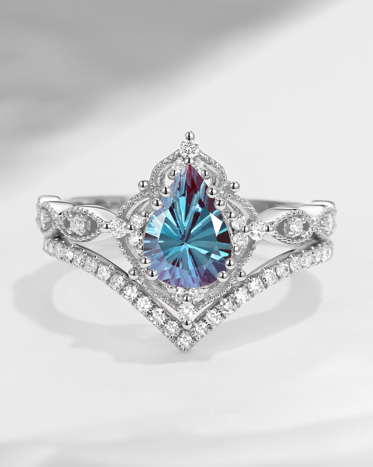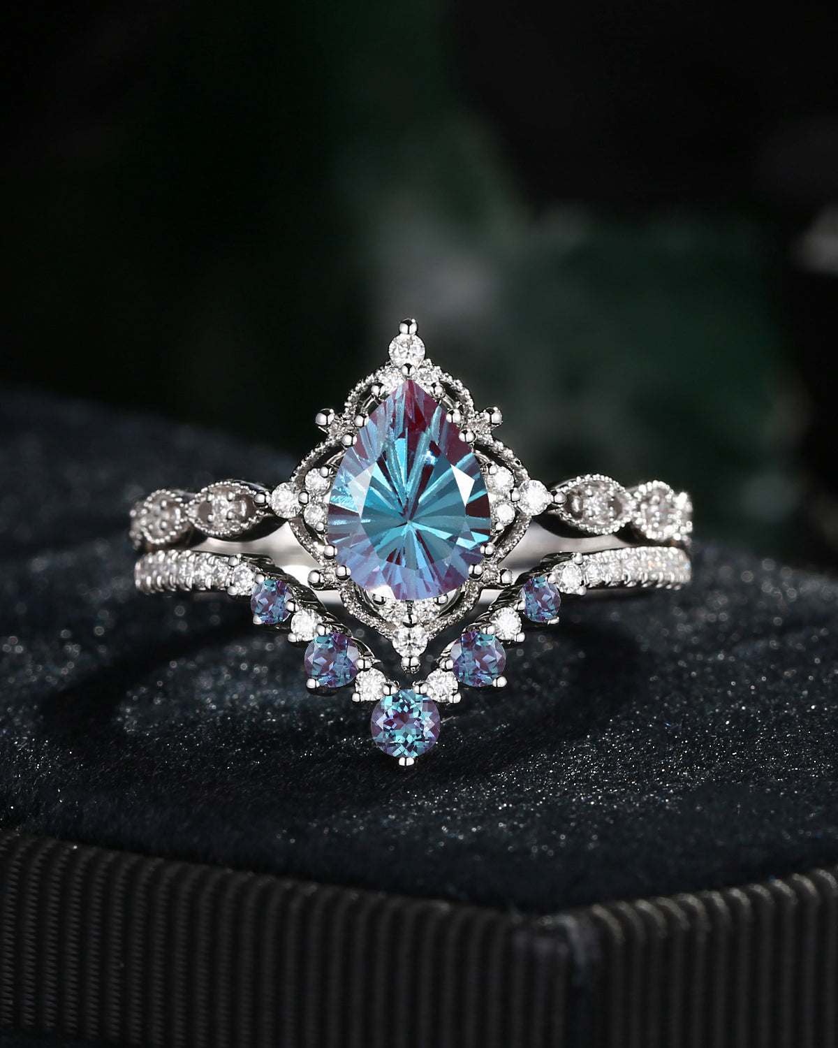 Antique Firework Cut Pear Shaped Lab Alexandrite Engagement Ring 2pcs