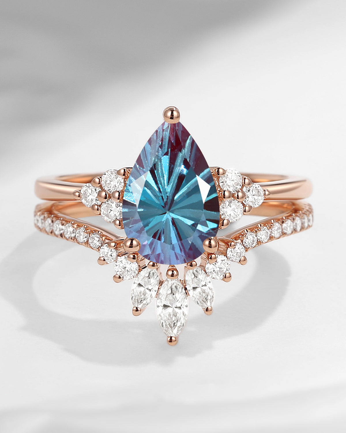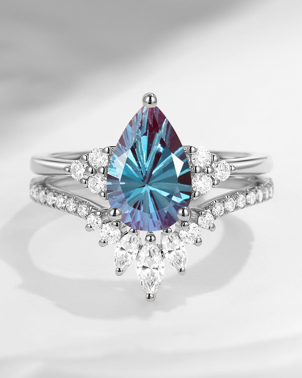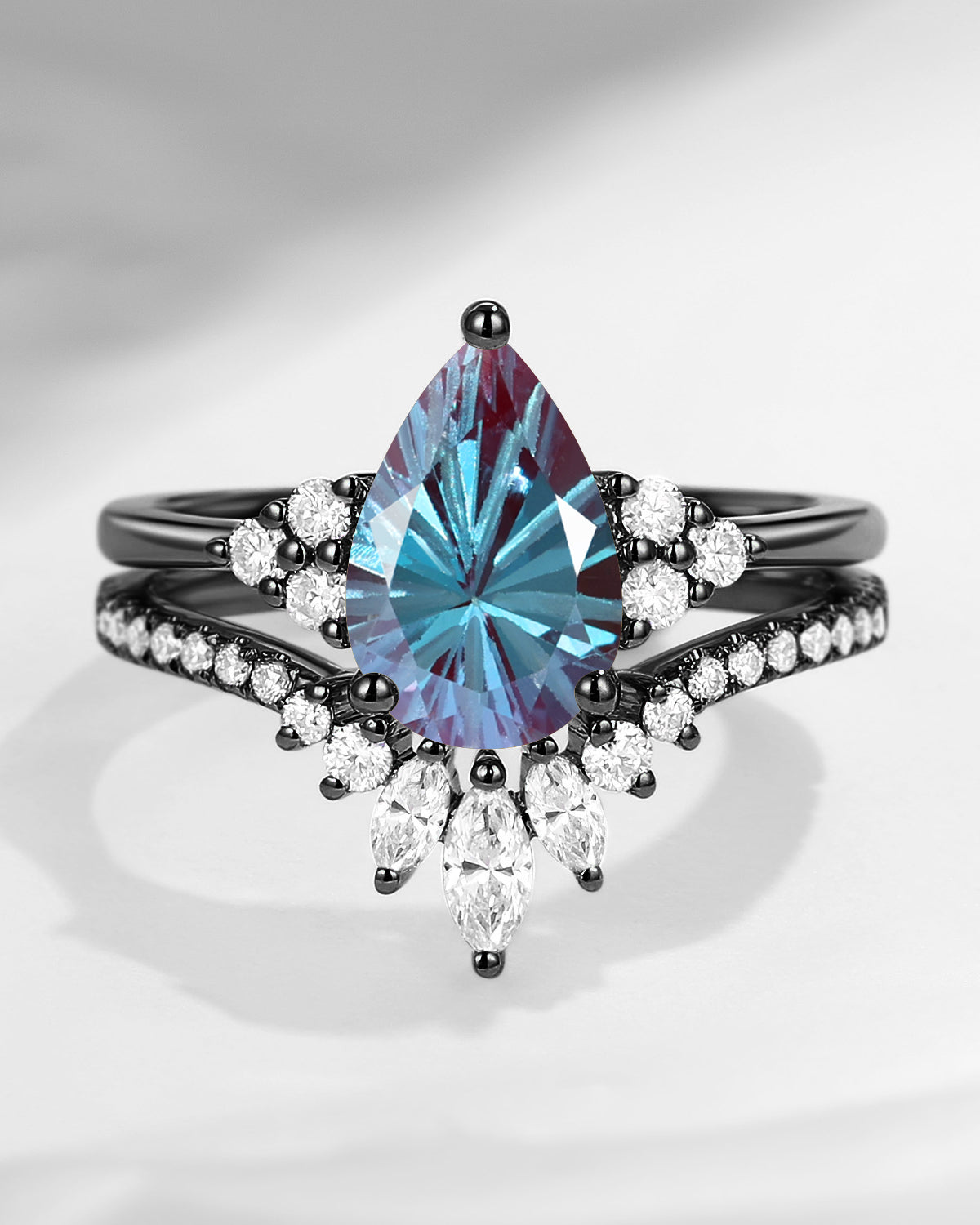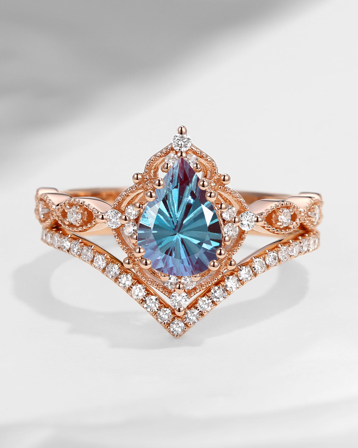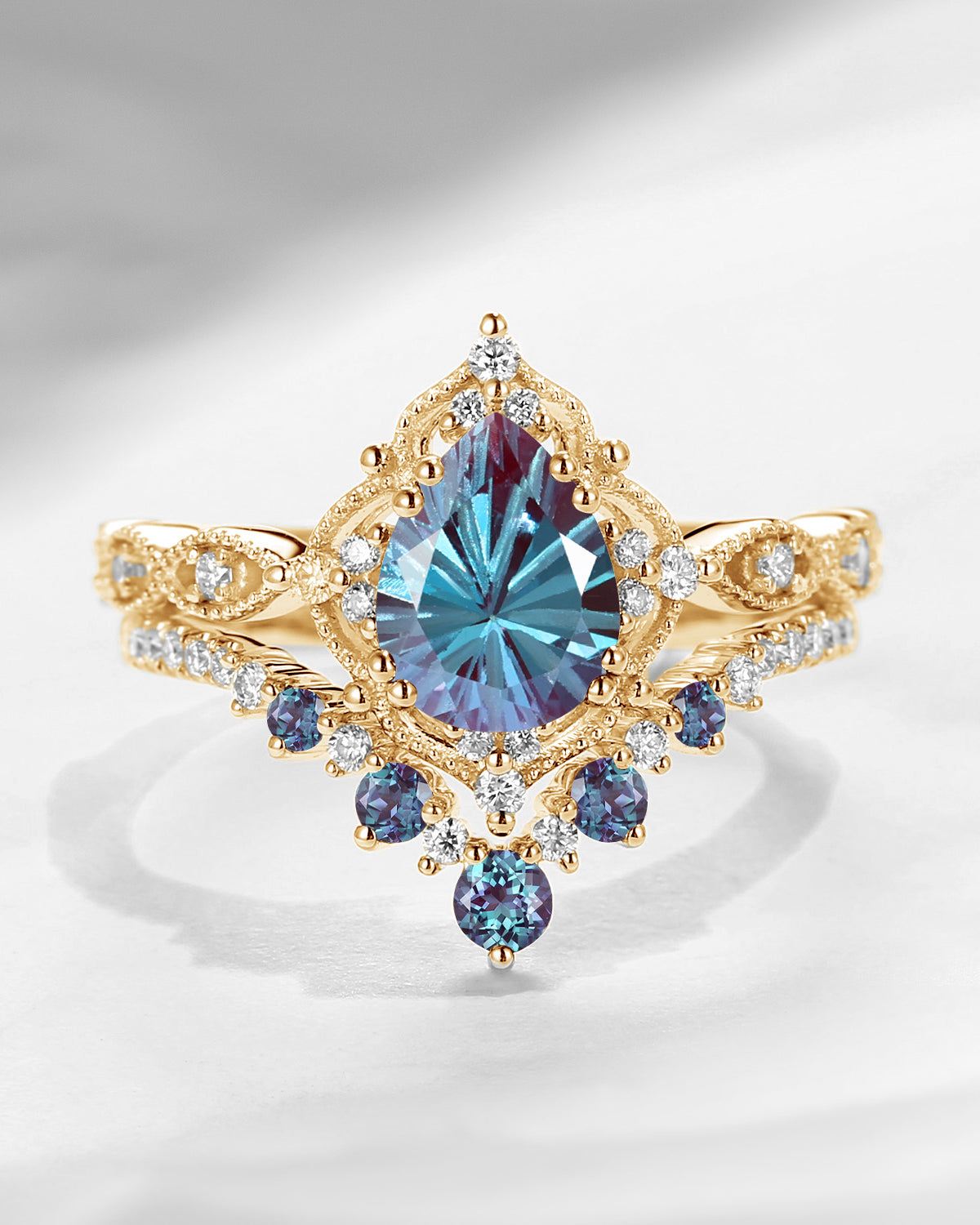 Antique Firework Cut Pear Shaped Lab Alexandrite Engagement Ring 2pcs