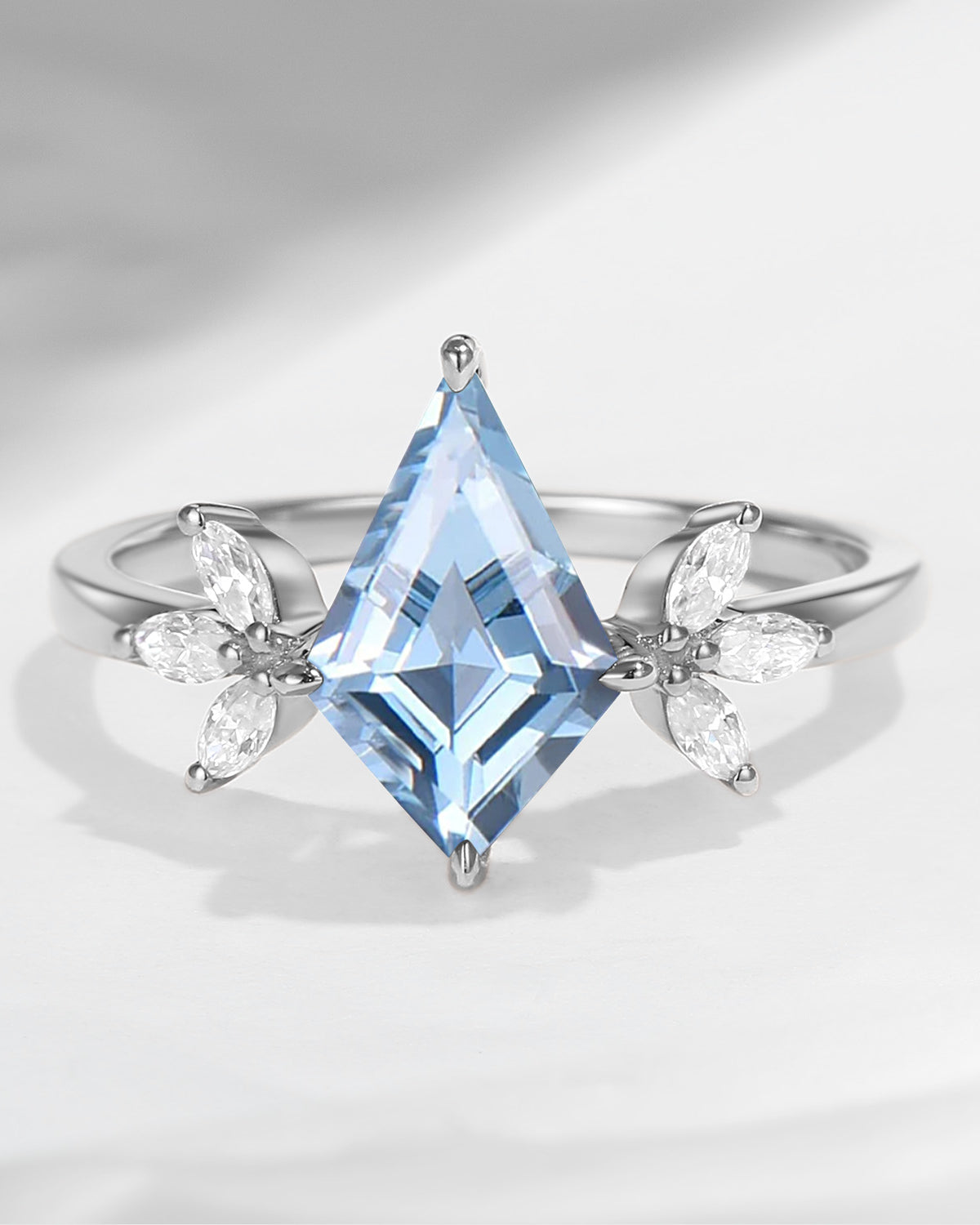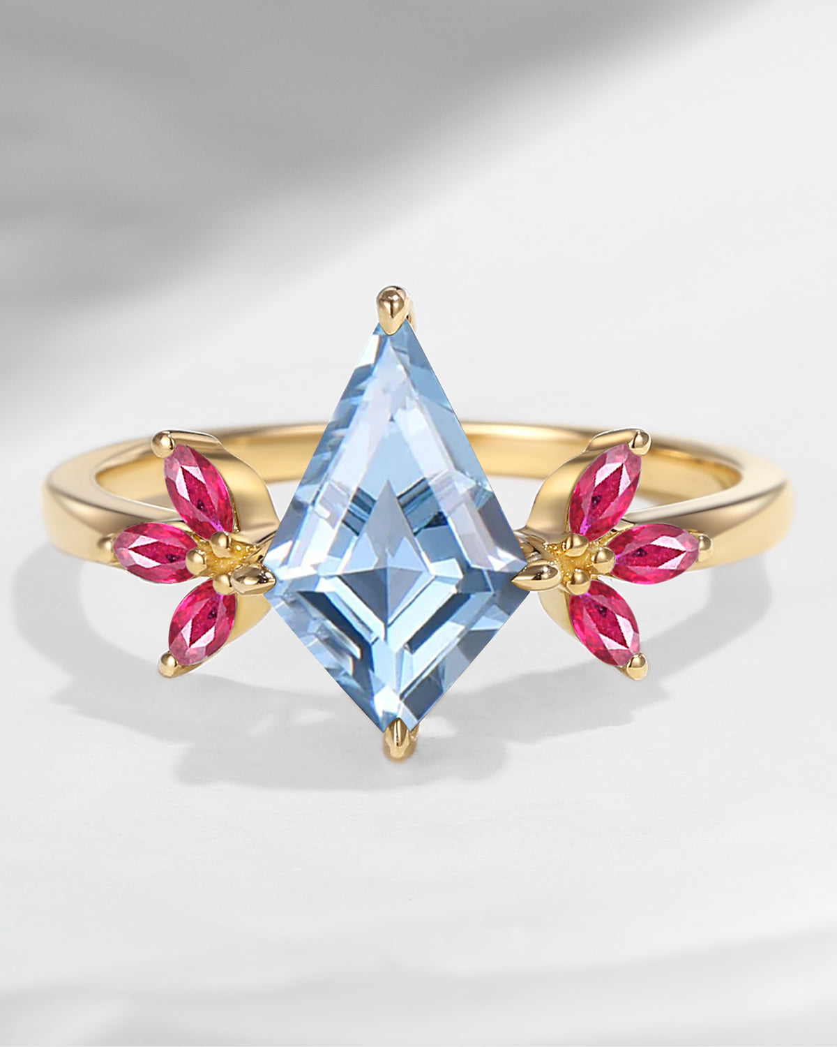 Kite Shaped Natural Aquamarine & Ruby Butterfly Cluster Engagement Ring