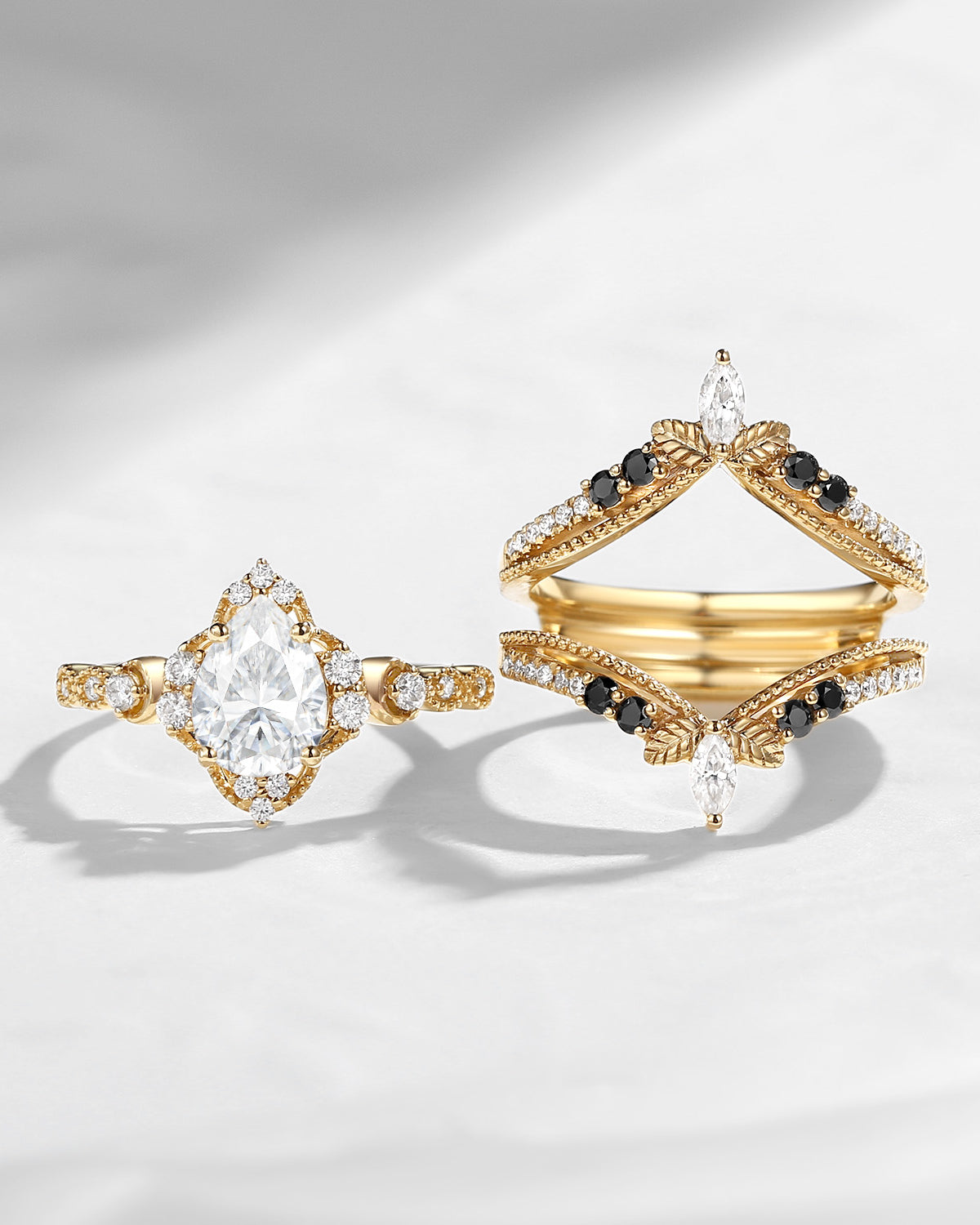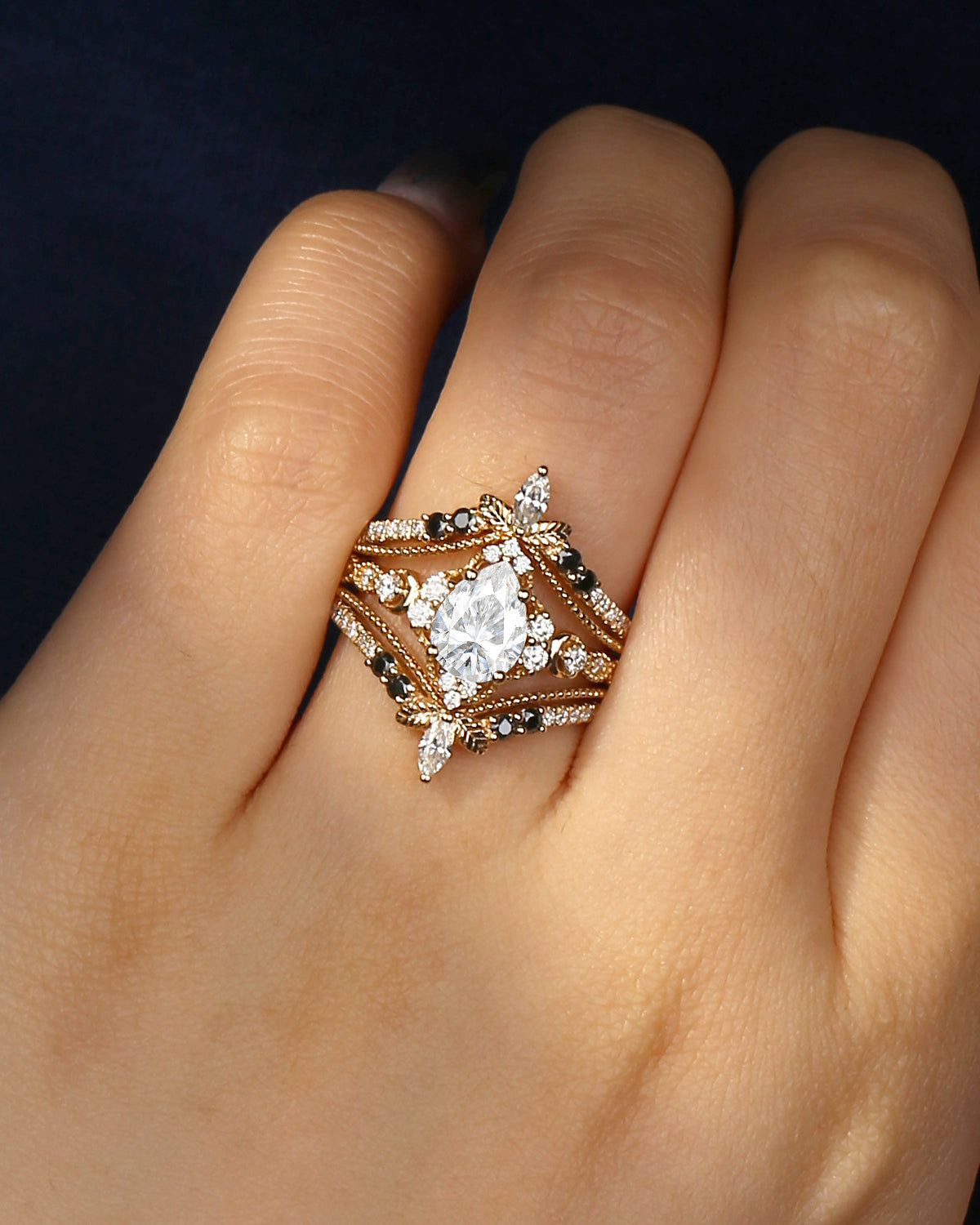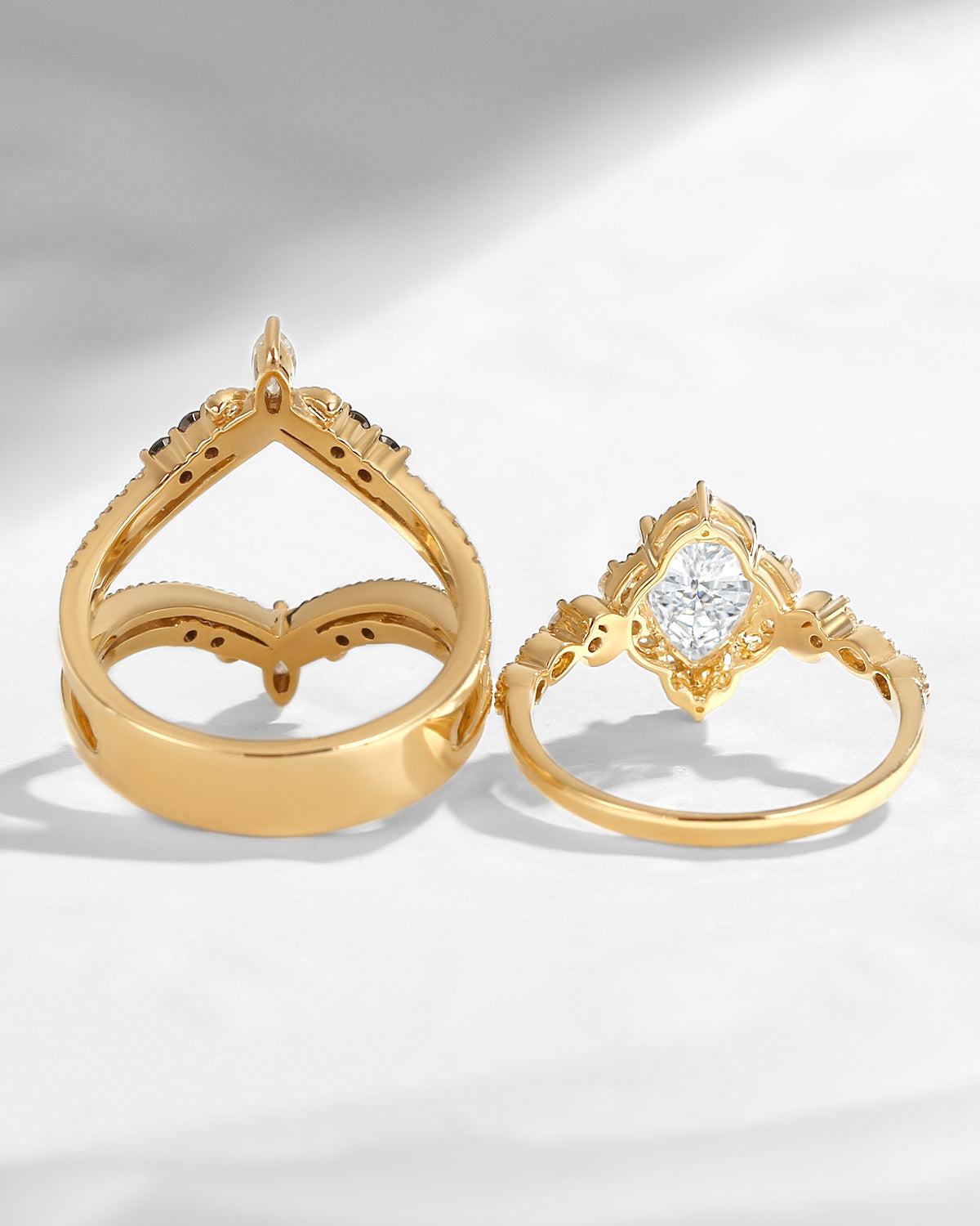 Pear Cut Vintage Inspired Moissanite Ring Set 2pcs - Maximalist Style Cage Ring
