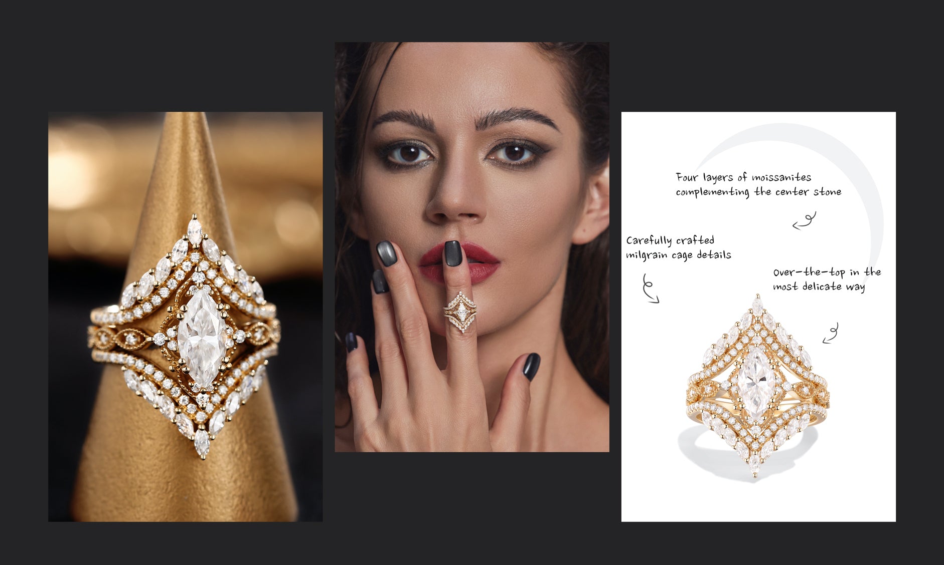 •Design - Maximalist, extra, dramatic, everything over-the-top to make this vintage inspired milgrain ring jacket pop. Elegant with a scent of rebellion. •It Says - Nothing can cage my love for you.