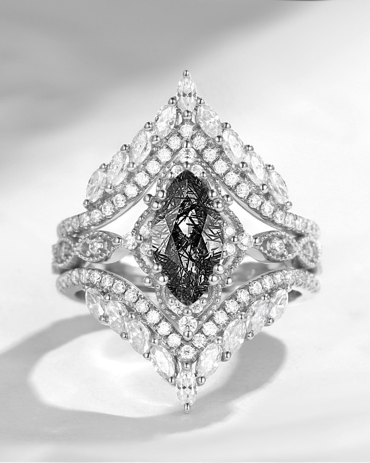 Vintage Pear Cut Black Rutilated Quartz Engagement Ring Cage Ring Set 2pcs