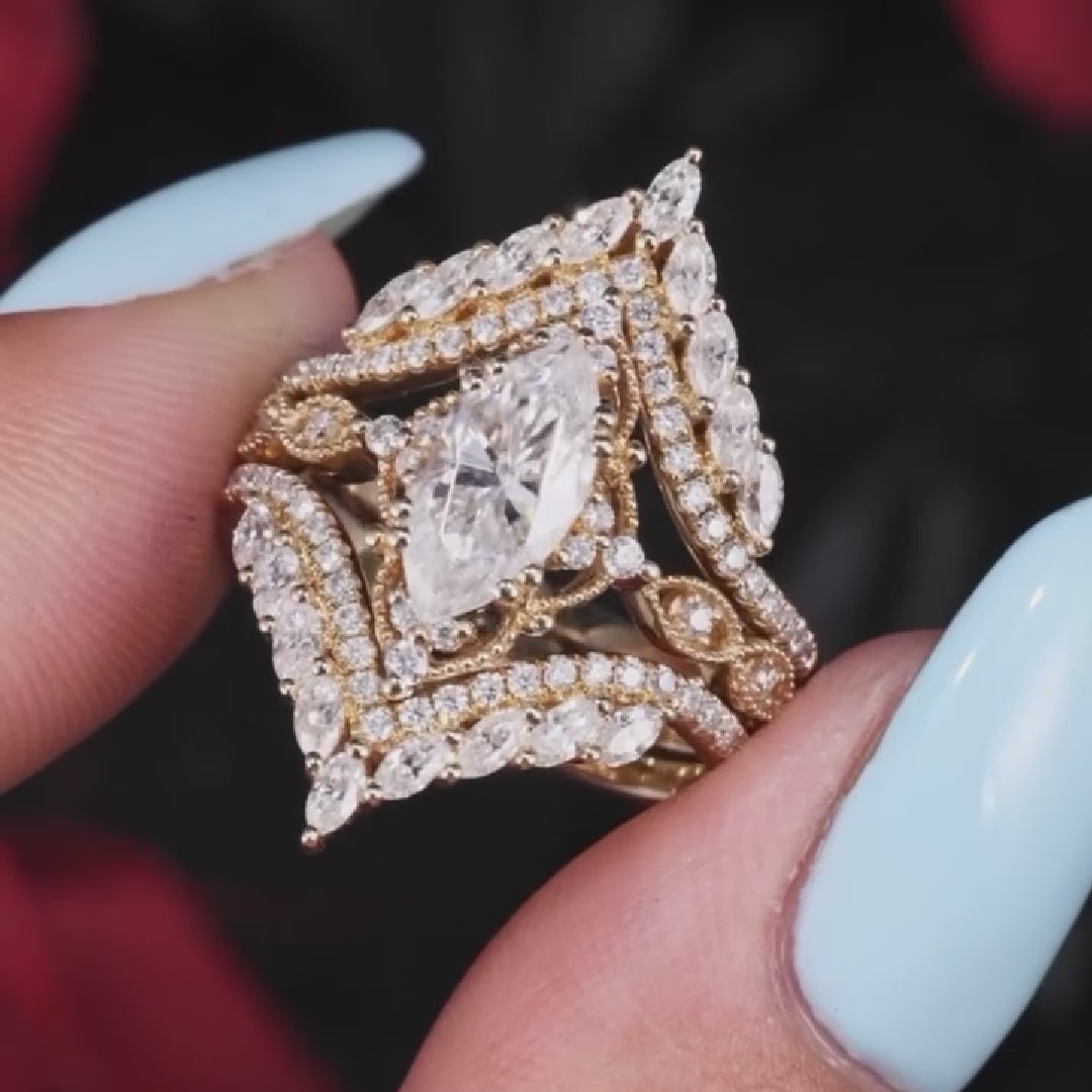Vintage Style Marquise Moissanite Cage Ring Bridal Set 2pcs