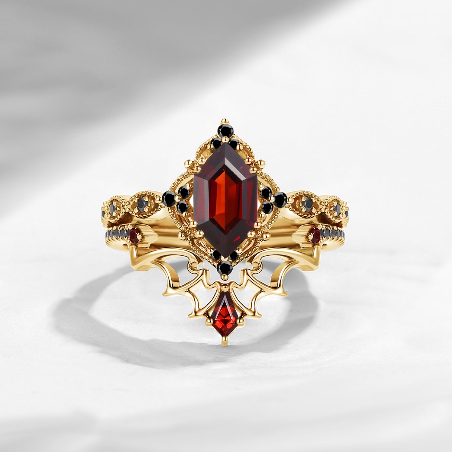 Gothic Inspired 'Dark Romance' Long Hexagon Cut Garnet Black Gold Engagement Ring Set 2pcs