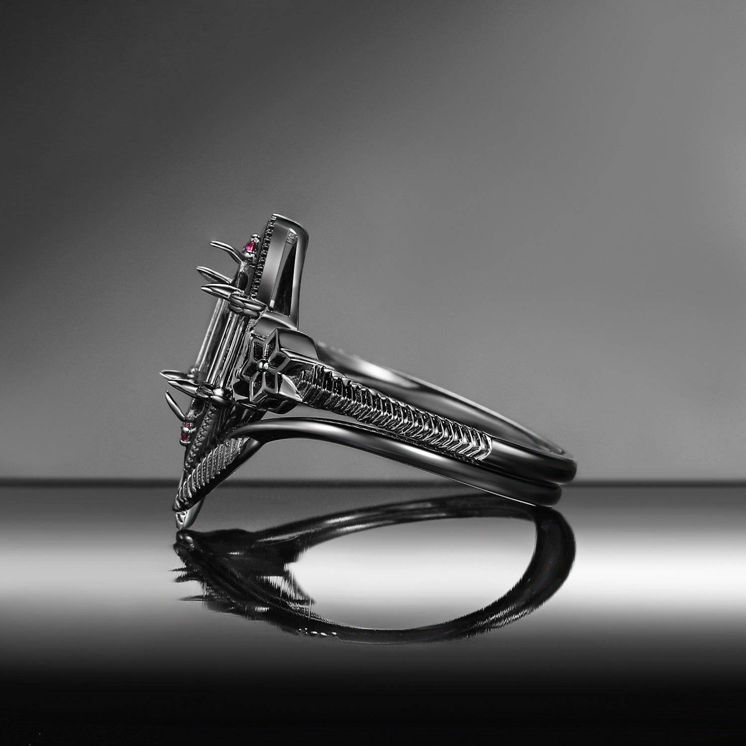 Gothic Style Long Hexagon Cut Moissanite Crow Inspired 'Caged Bird' Engagement Ring Halloween Bridal Sets 2pcs