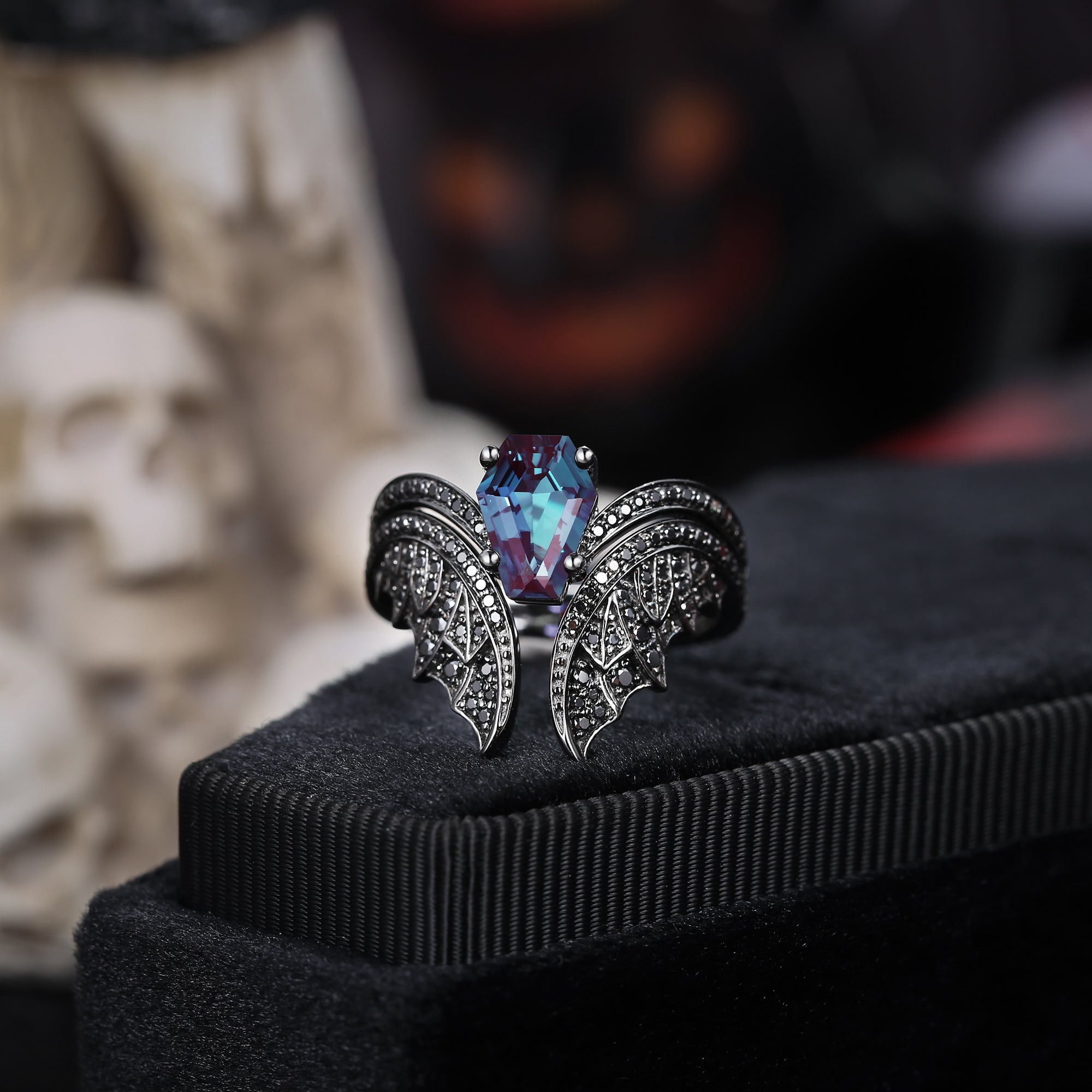 Coffin Cut Lab Alexandrite Vintage Black Gold Bridal Set 2pcs - Bat Ring