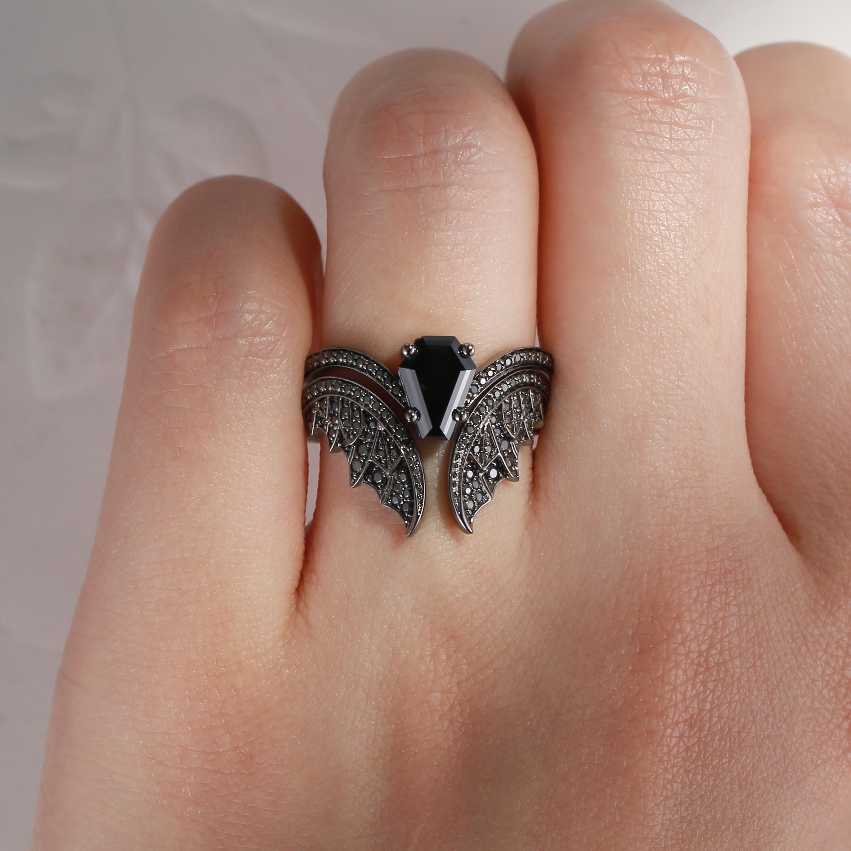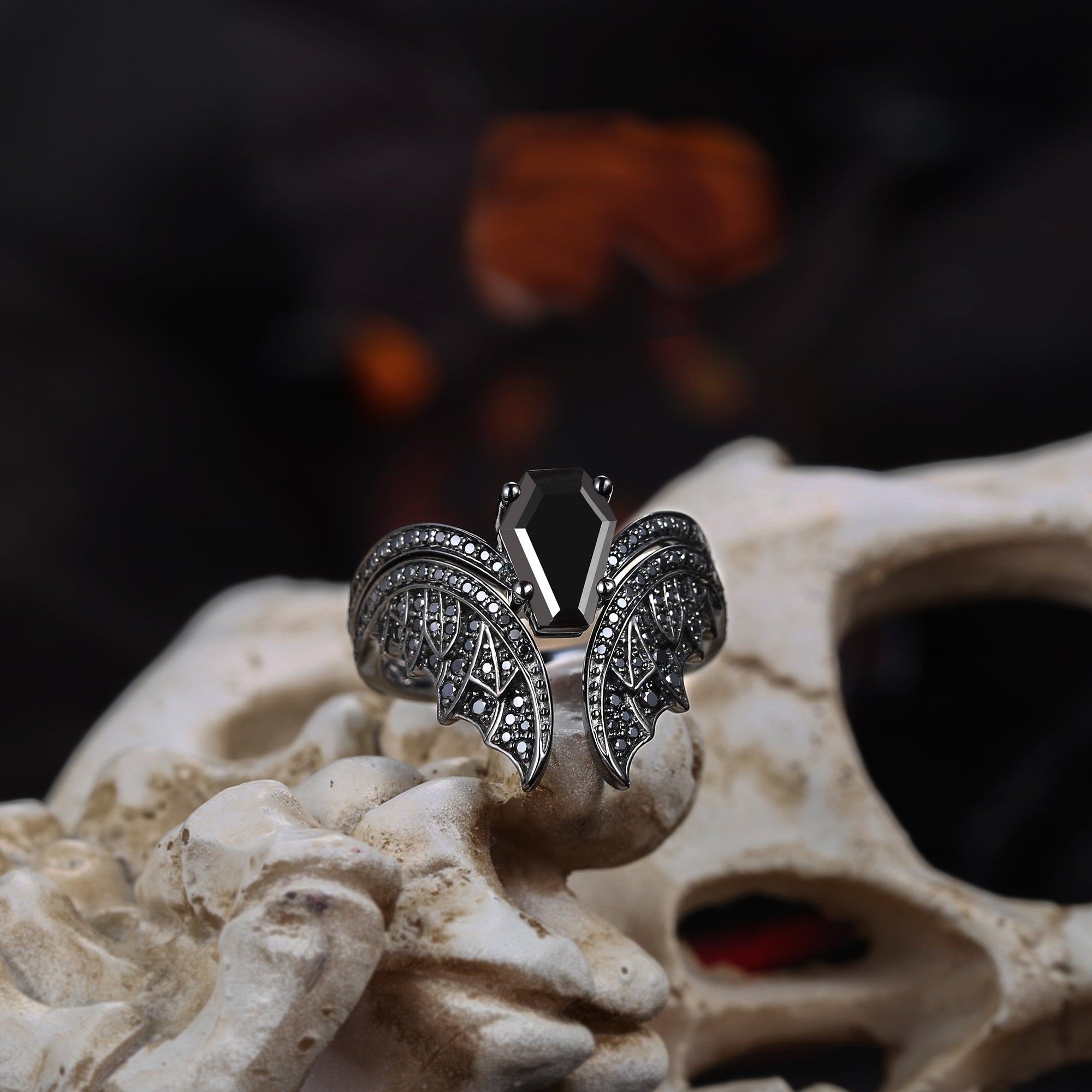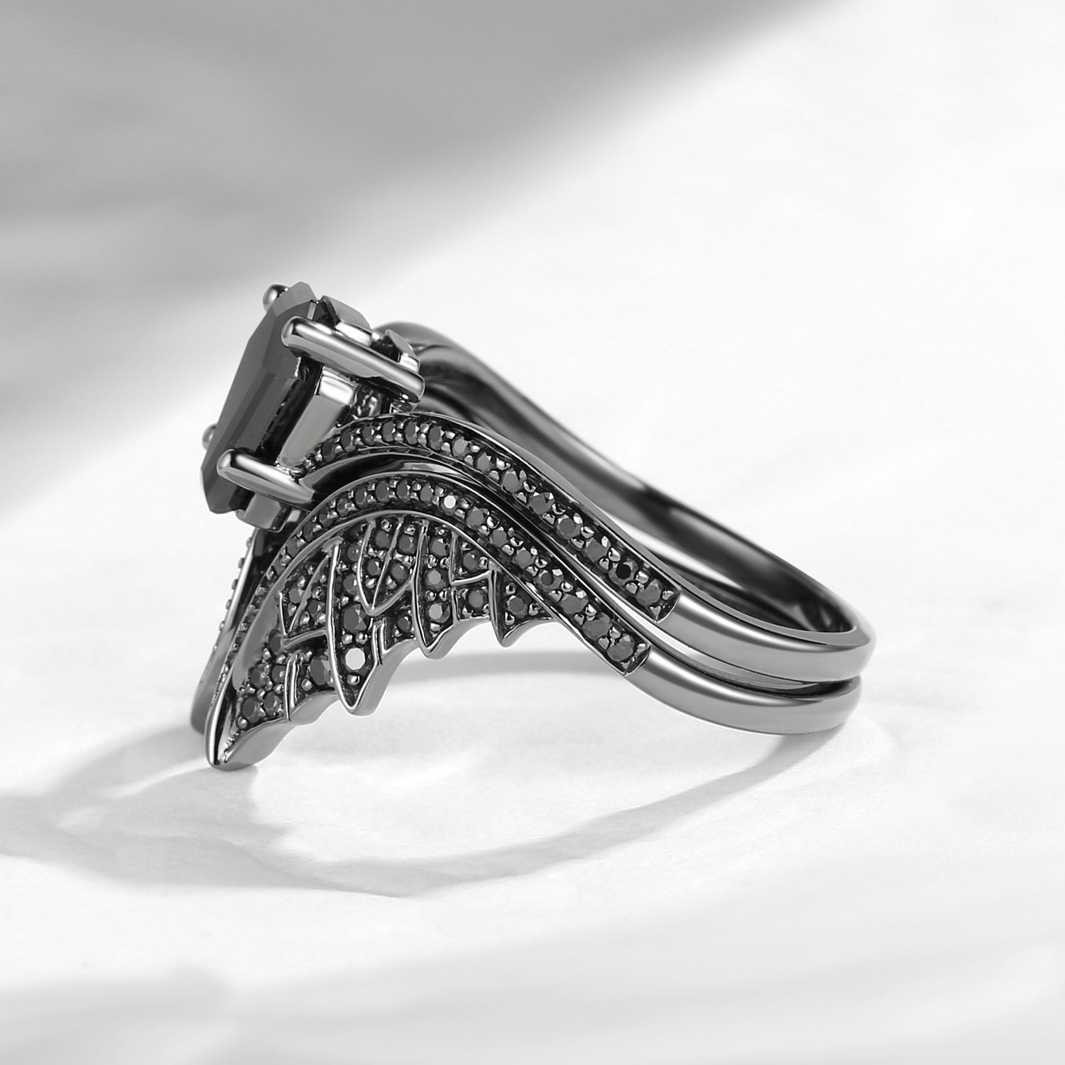 Coffin Cut Black Moissanite Vintage Black Gold Bridal Set 2pcs - Bat Ring