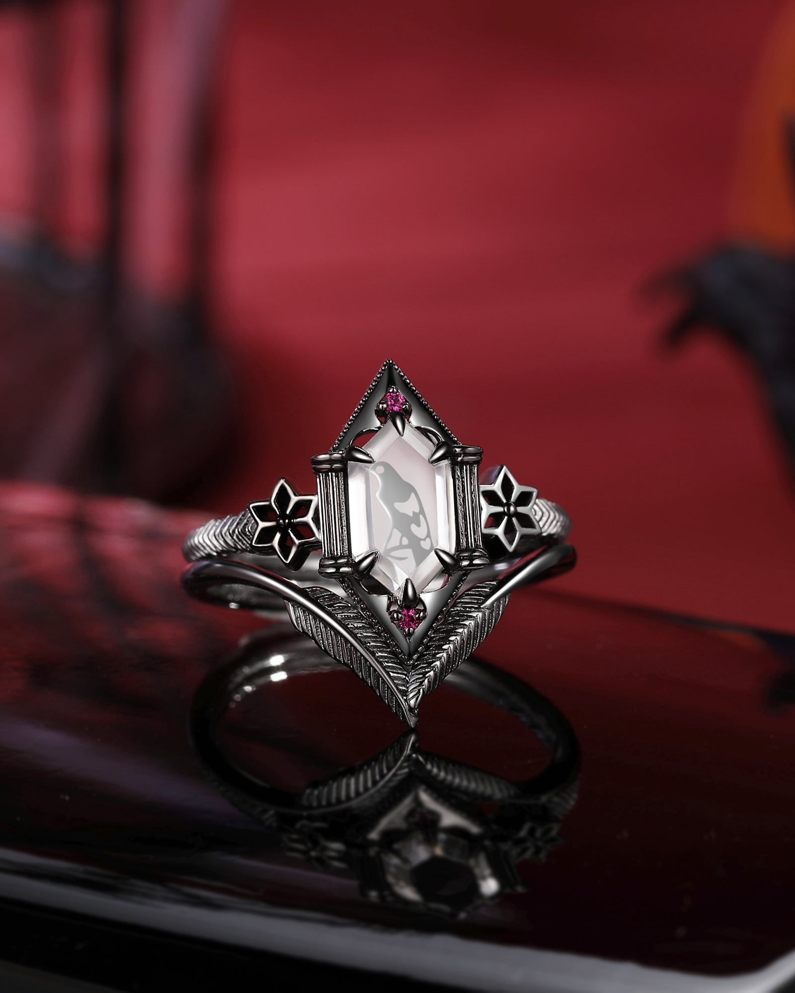 Gothic Crow Inspired Garnet Halloween Black Gold Engagement Ring