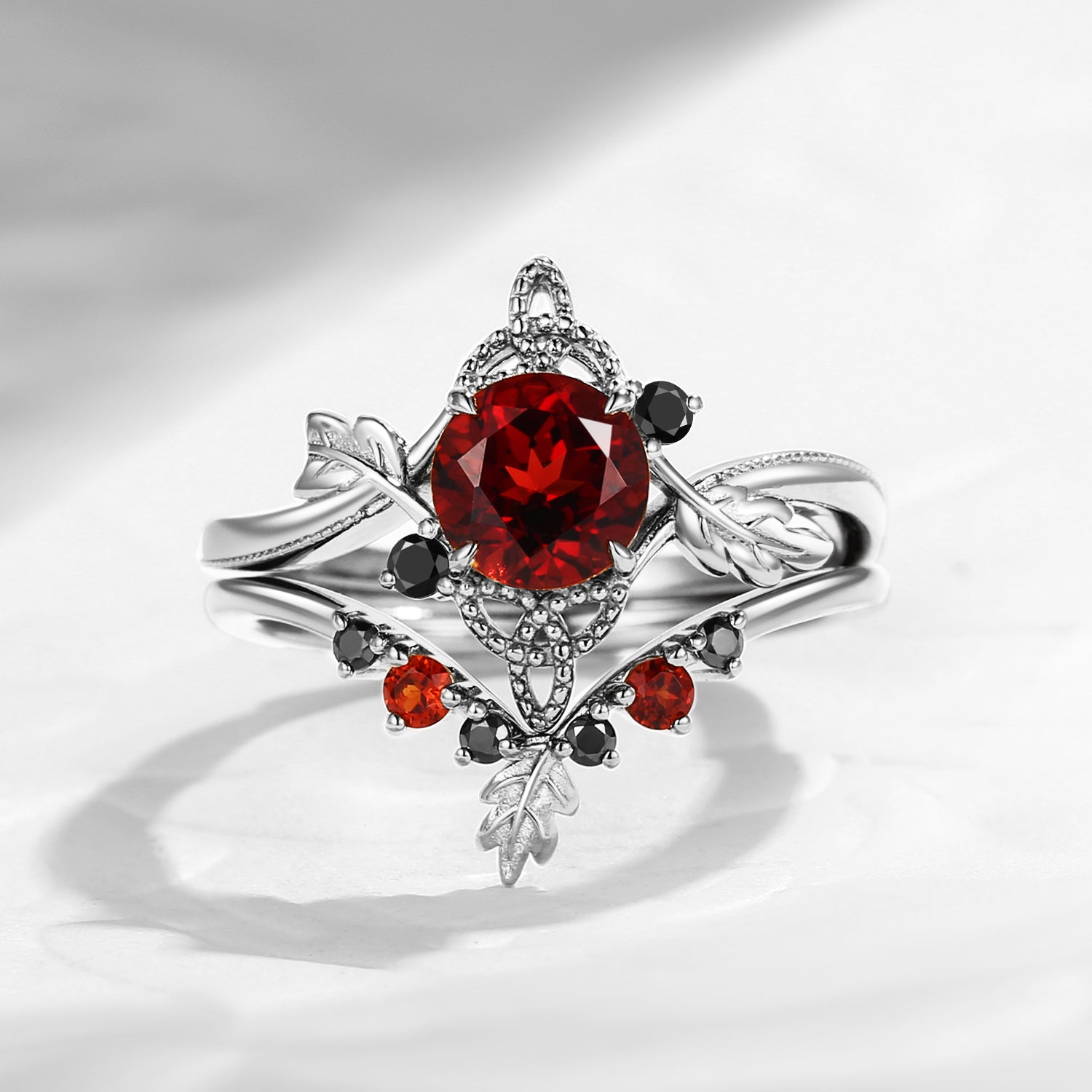 Select moreCeltic Calendar | 12.24-1.20 | Round Cut Garnet Nature Inspired Birch Leafy Celtic Ring Set 2pcs